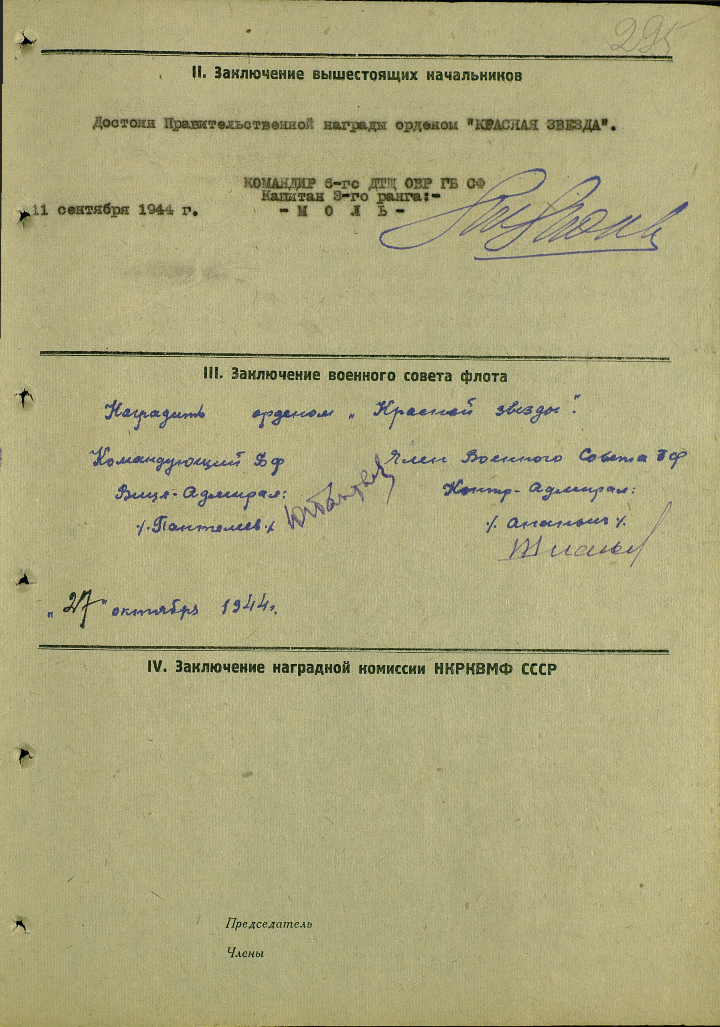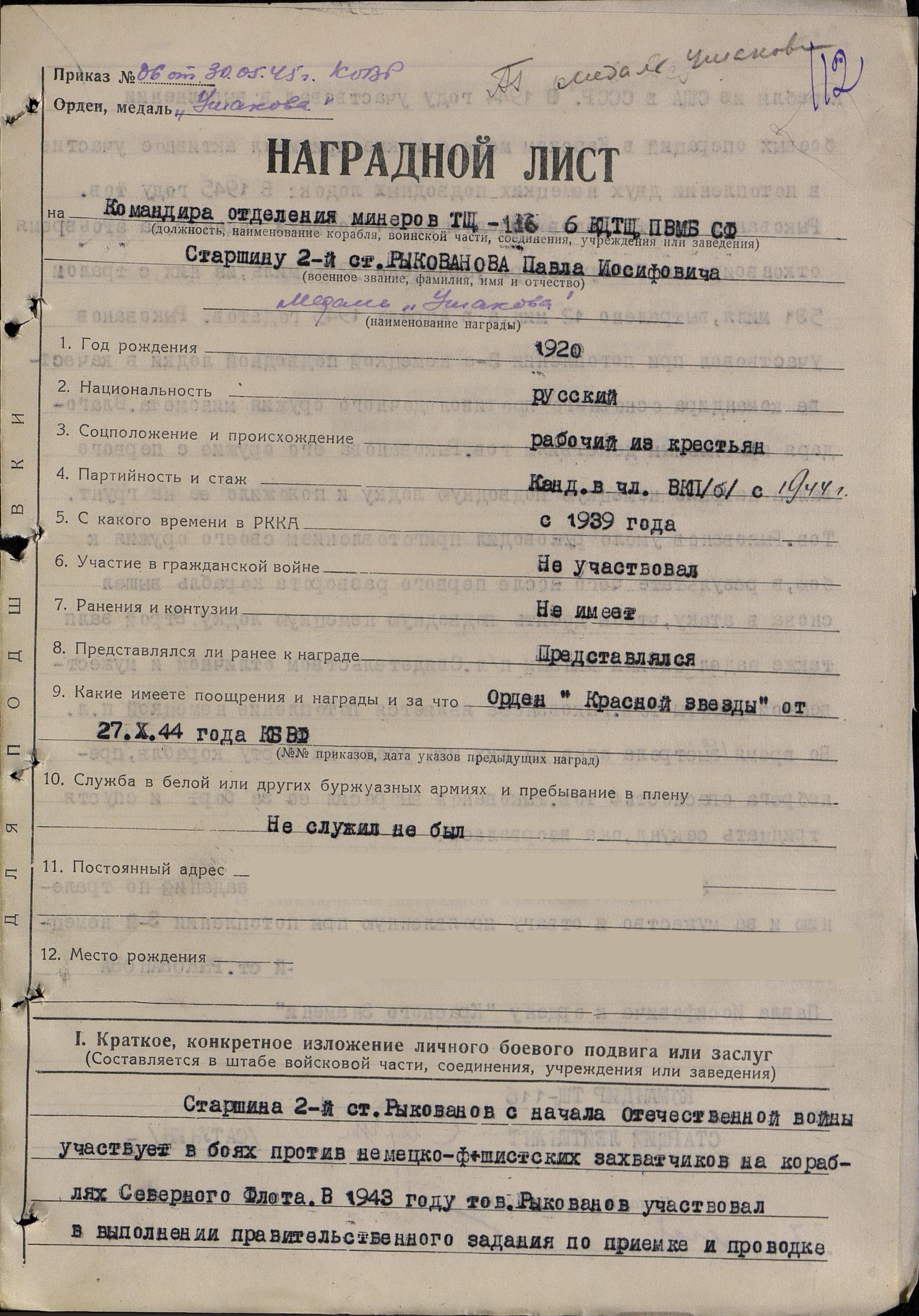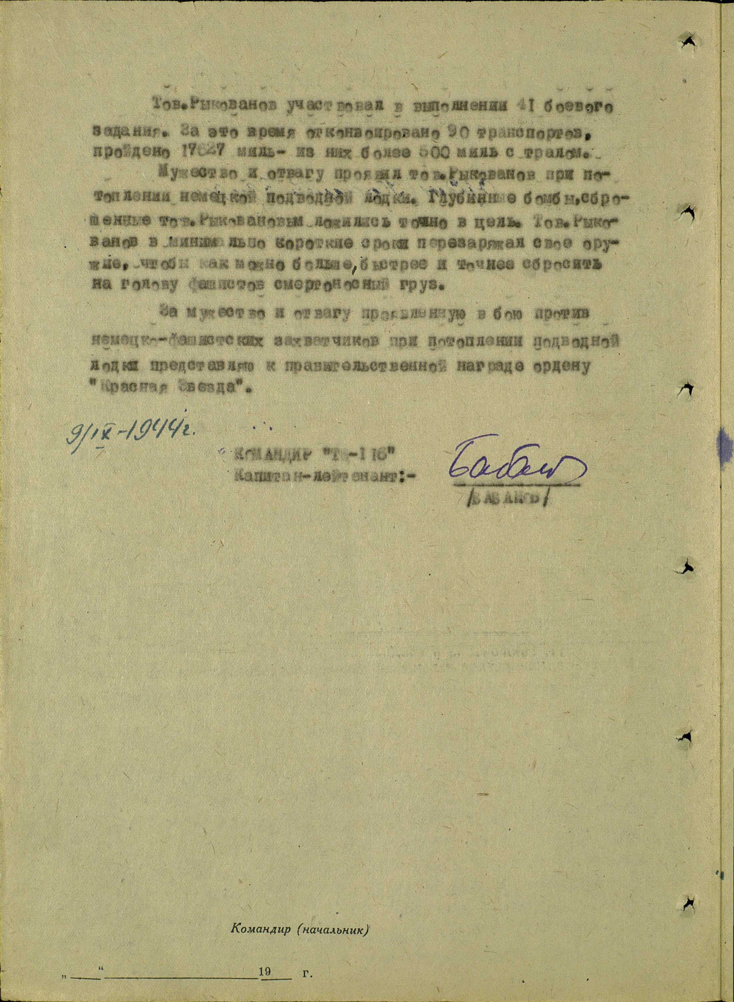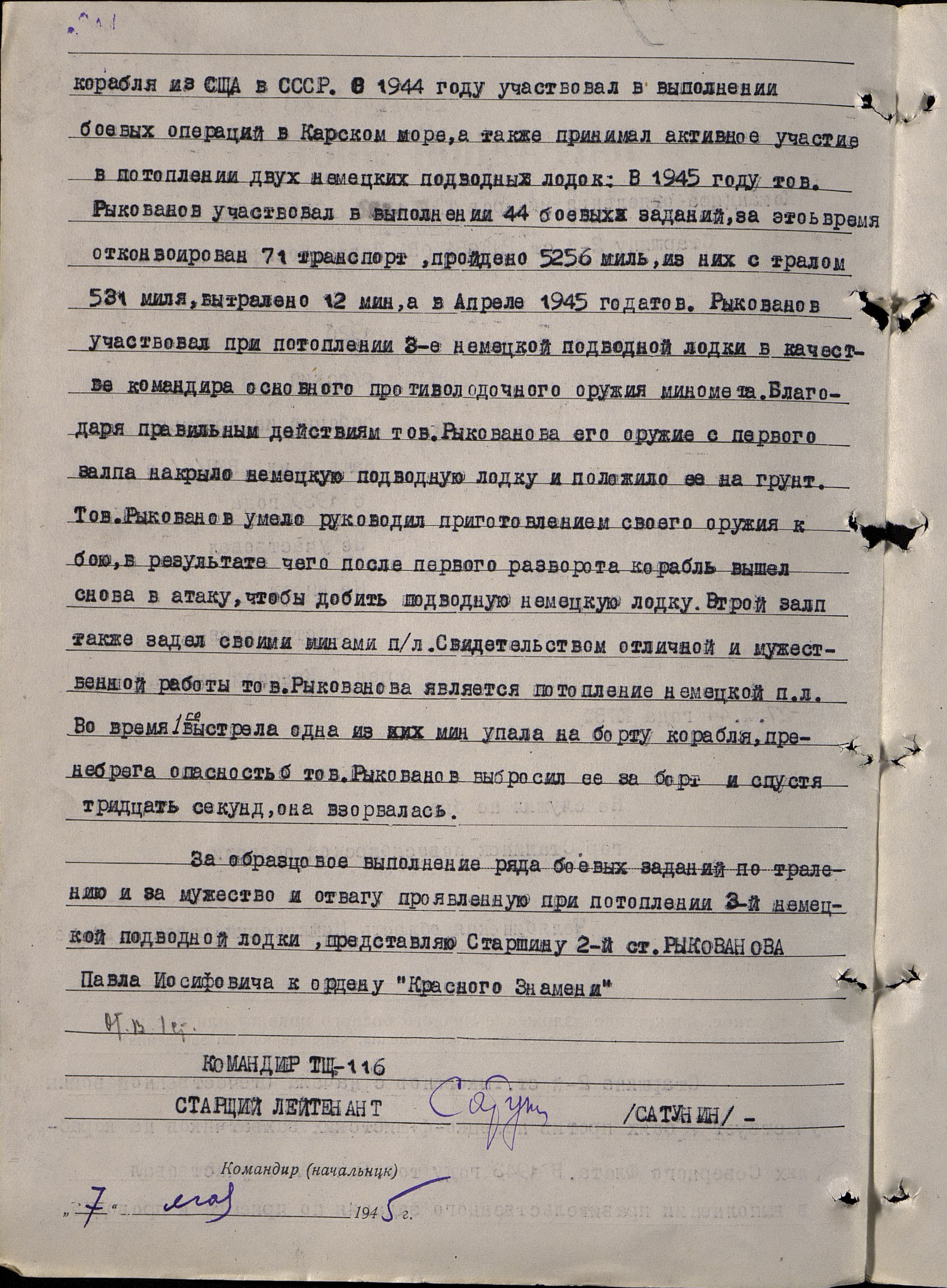 За образцовое выполнение ряда боевых заданий по тралению и за мужество и отвагу, проявленные при потоплении третьей немецкой подводной лодки, представляю старшину 2 статьи Рыкованова Павла Иосифовича к ордену Красного Знамени.