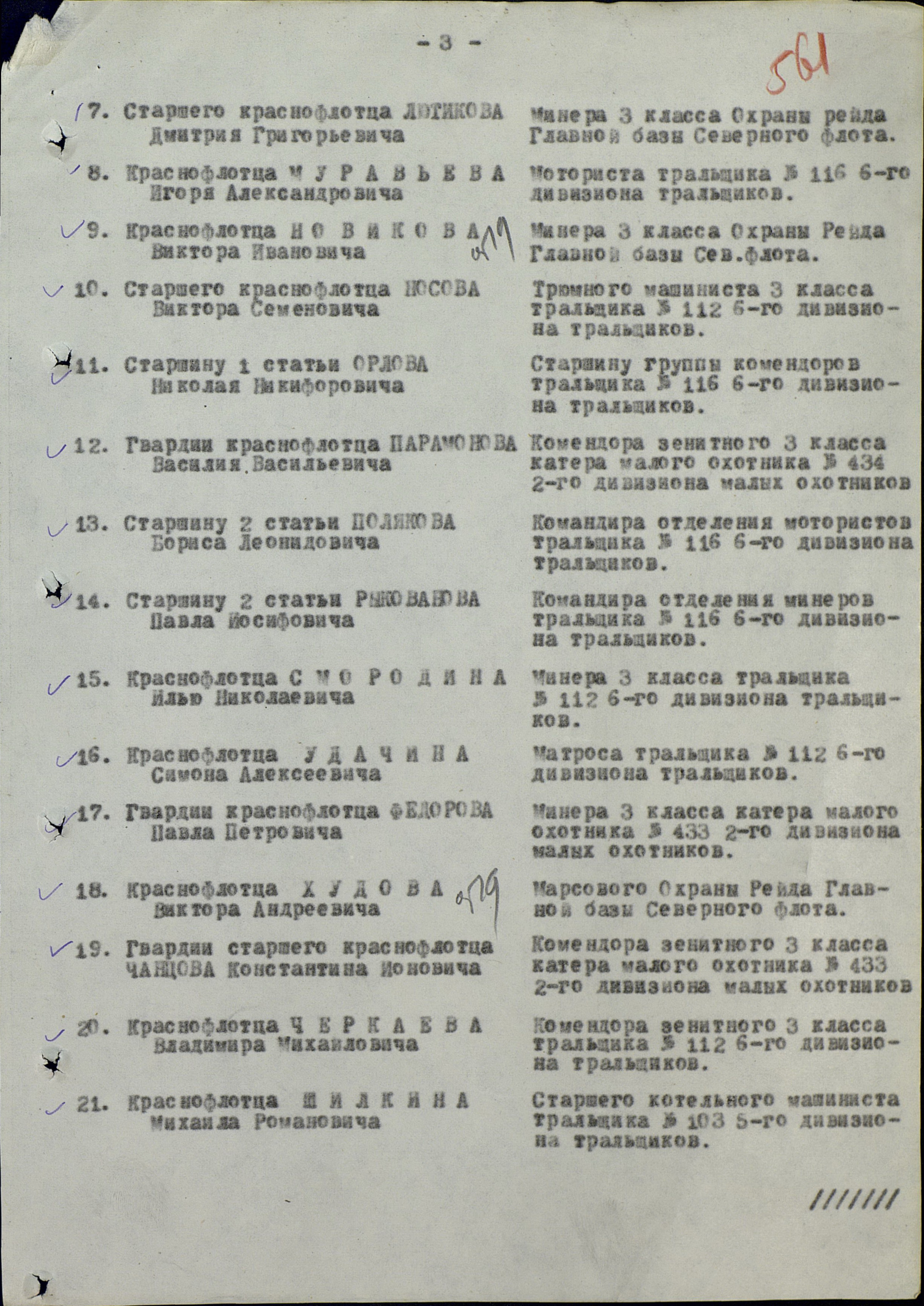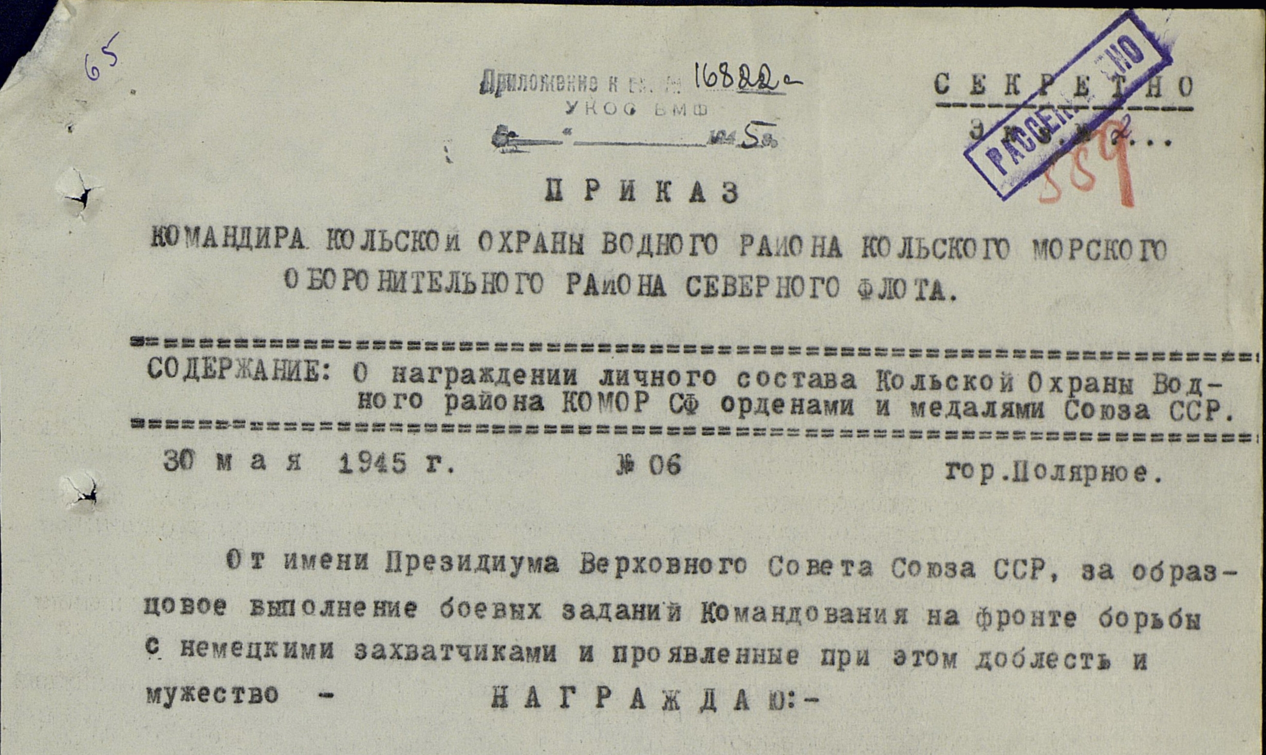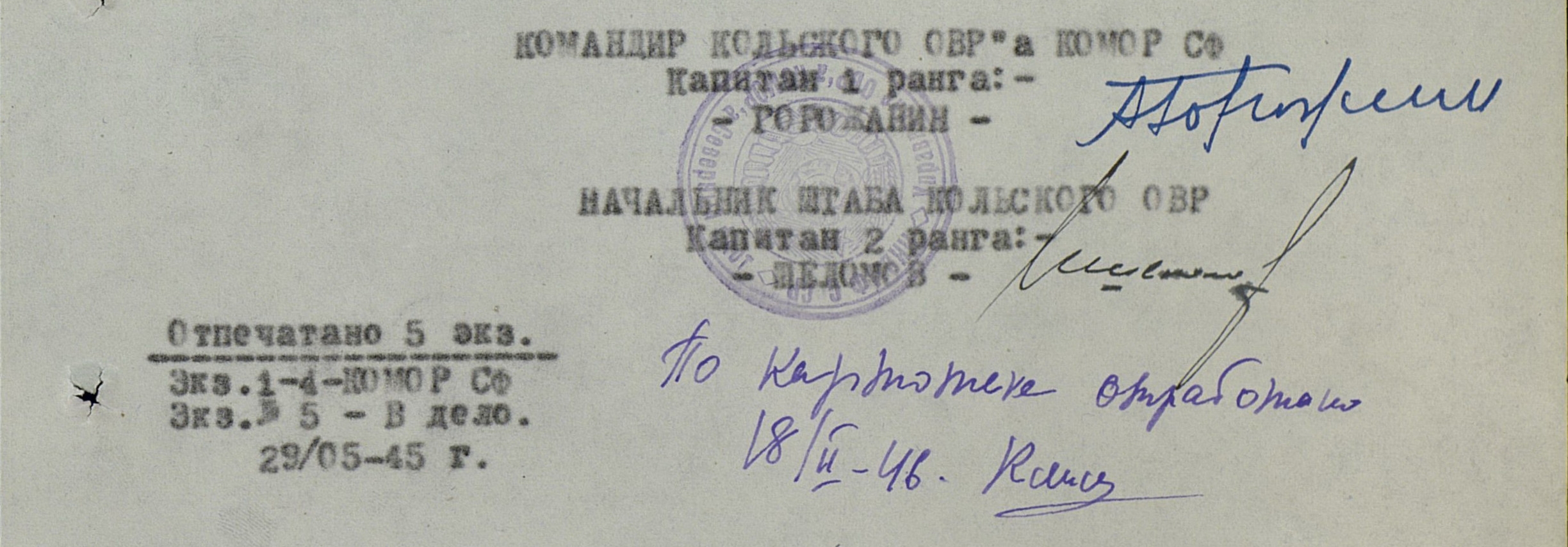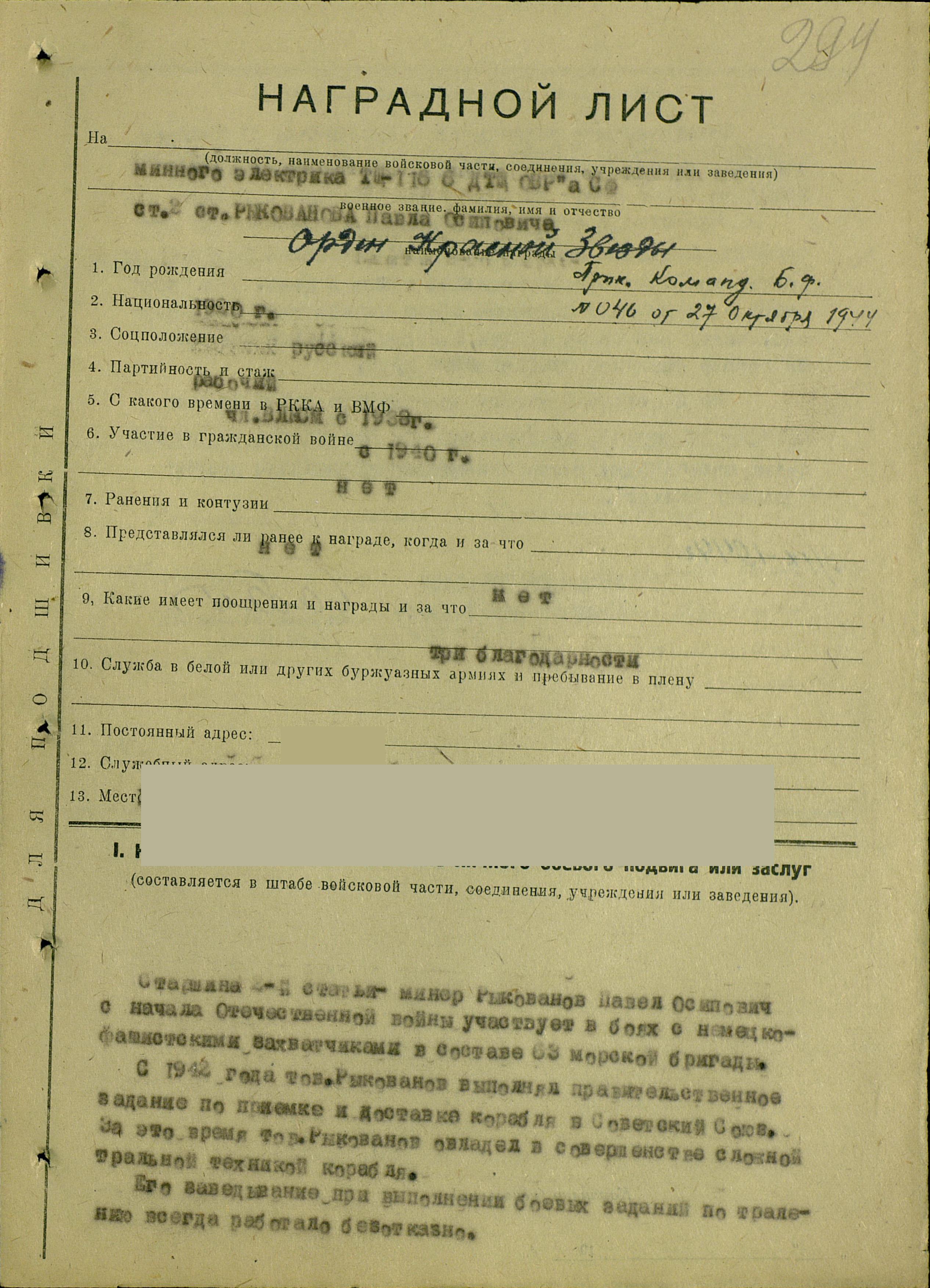 За образцовое выполнение ряда боевых заданий по тралению и за мужество и отвагу, проявленные при потоплении третьей немецкой подводной лодки, представляю старшину 2 статьи Рыкованова Павла Иосифовича к ордену Красного Знамени.