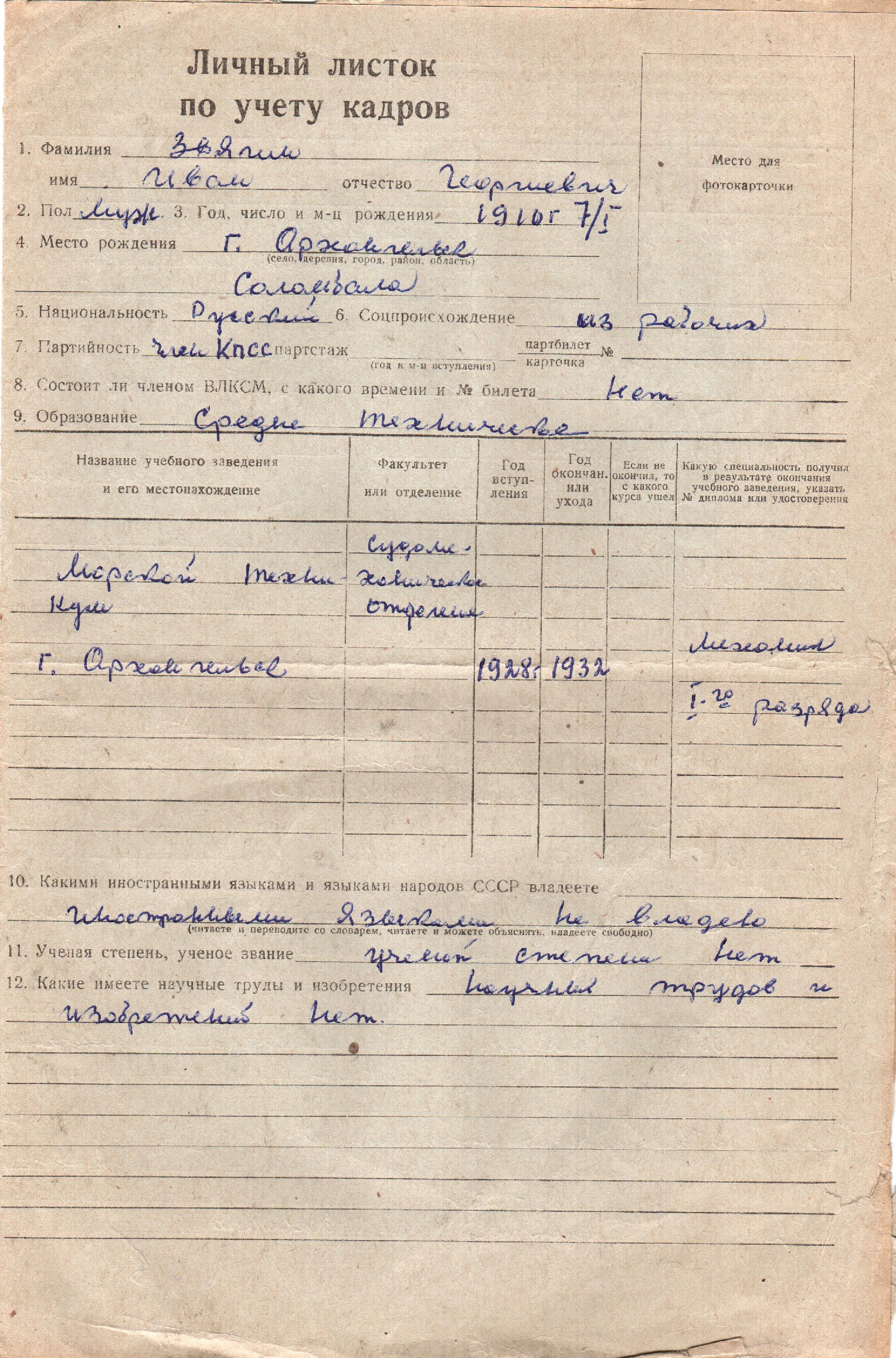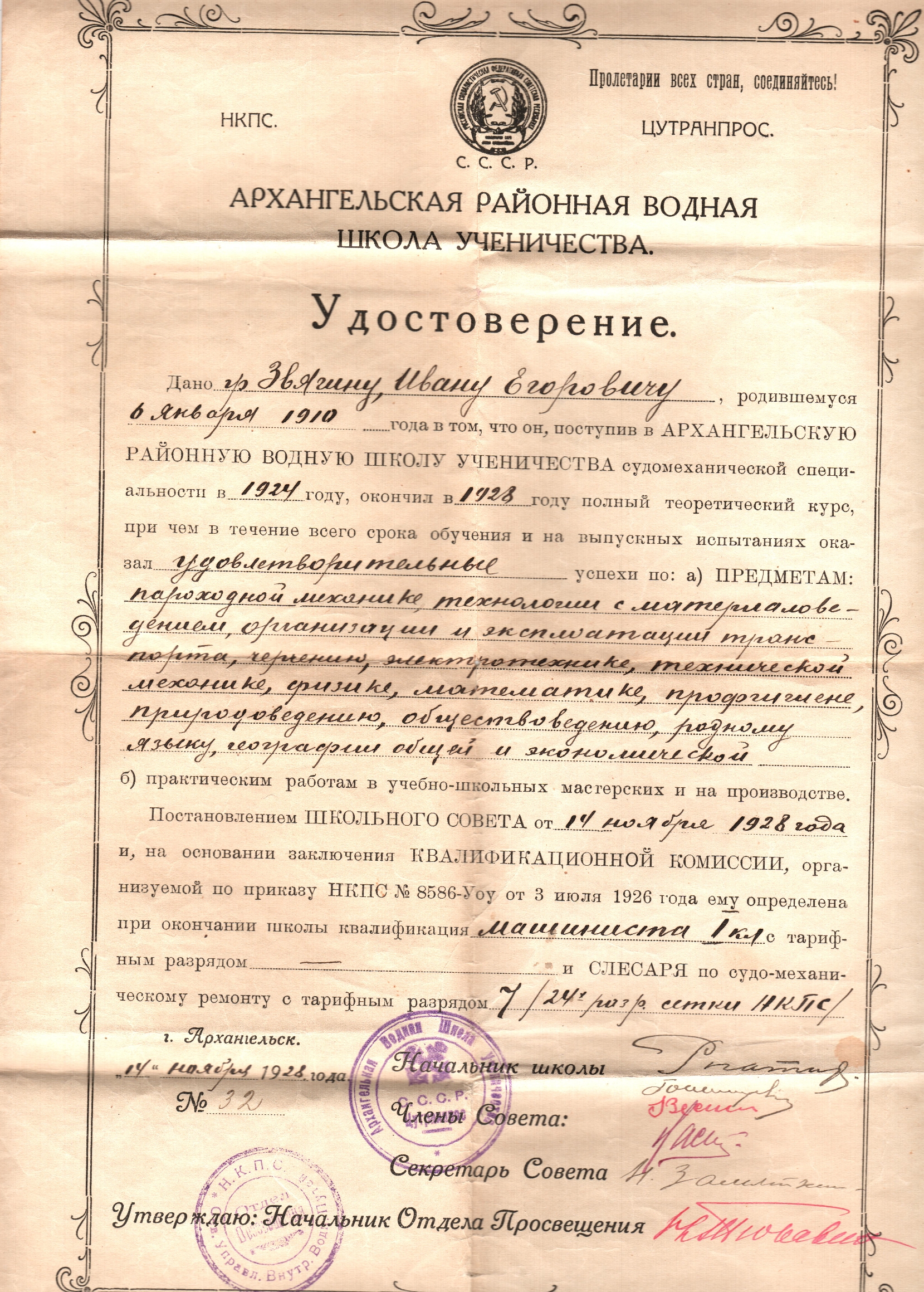 Второй механик п/х. «Крестьянин» тов. Звягин Иван Георгиевич работает на пароходе в должности II механика с 23-го июня с/года. За время своей работы т. Звягин, несмотря на трудность в арктическом рейсе, проявил себя, как вполне знающий свое дело и добросовестно относился к своим обязанностям, является стахановцем на судне. В общественной работы – был председателем производственного машинного звена. Тов. Звягин среди экипажа пользуется авторитетом и является хорошим товарищем по работе.
