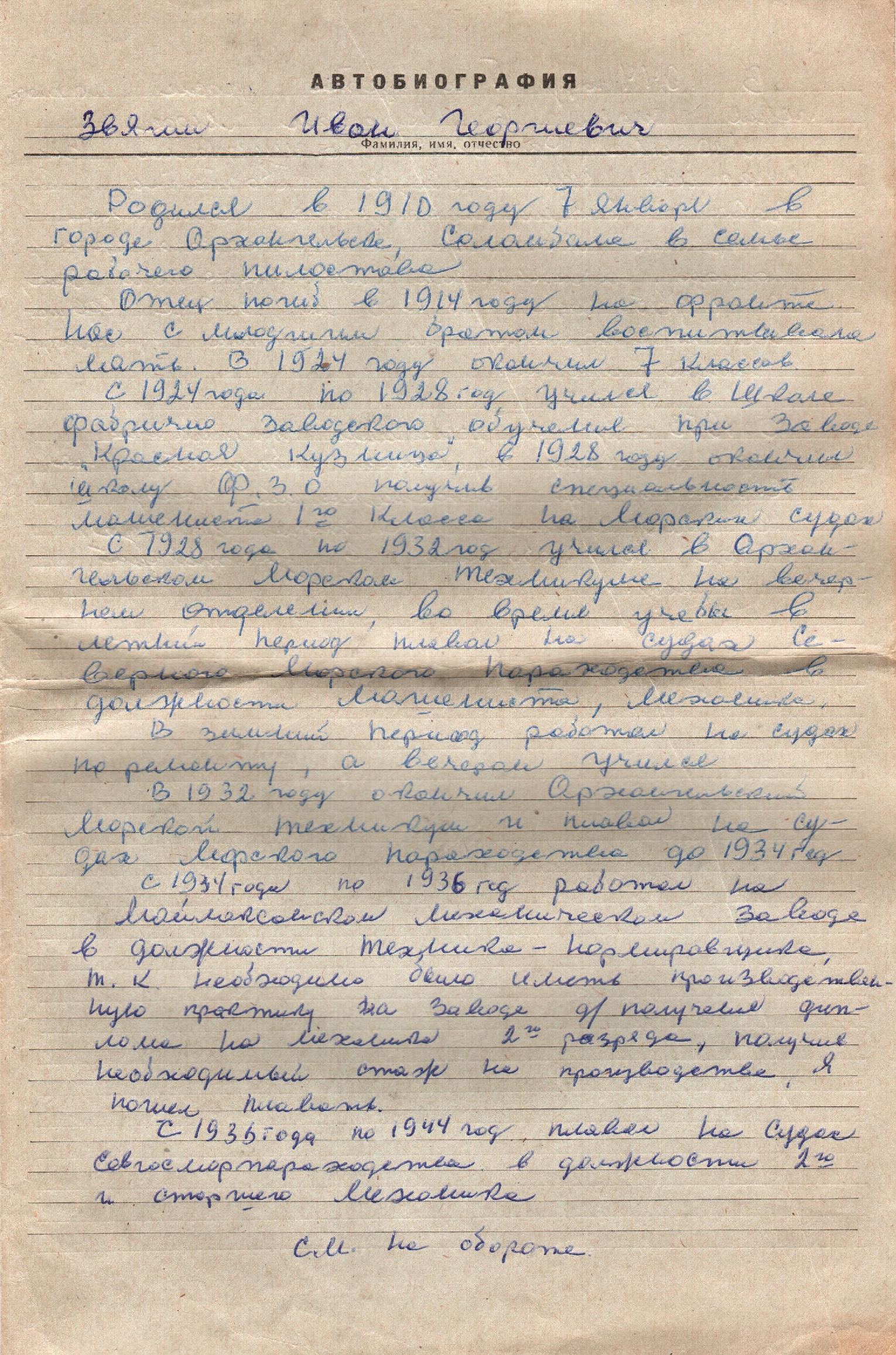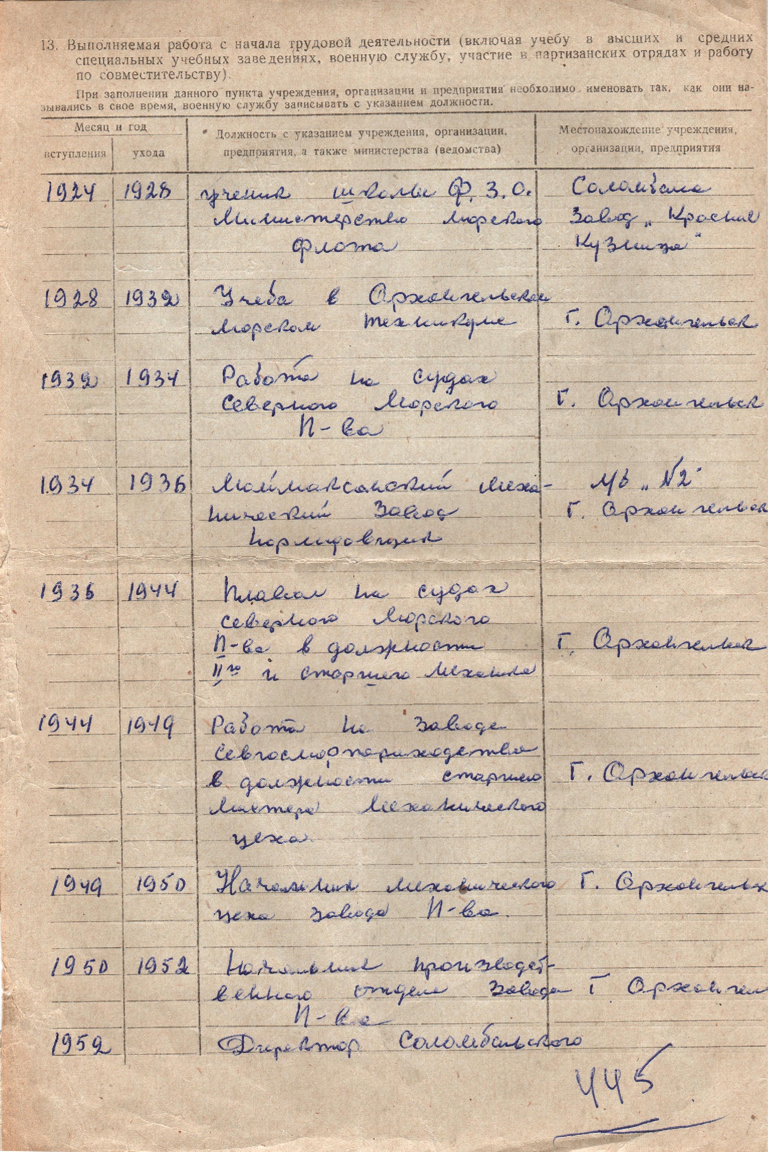 С 1934 года по 1936 года работал на … механическом заводе в должности техника-нормировщика, т.к. необходимо было иметь производственную практику для получения диплома на механика 2-го разряда, получив необходимый стаж на производстве, я пошел плавать.