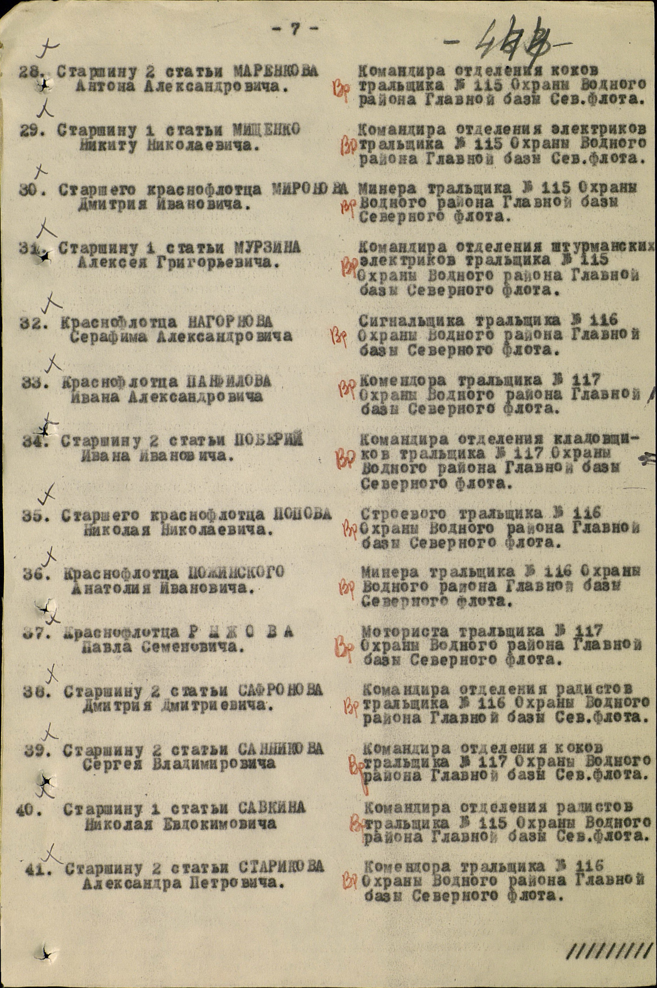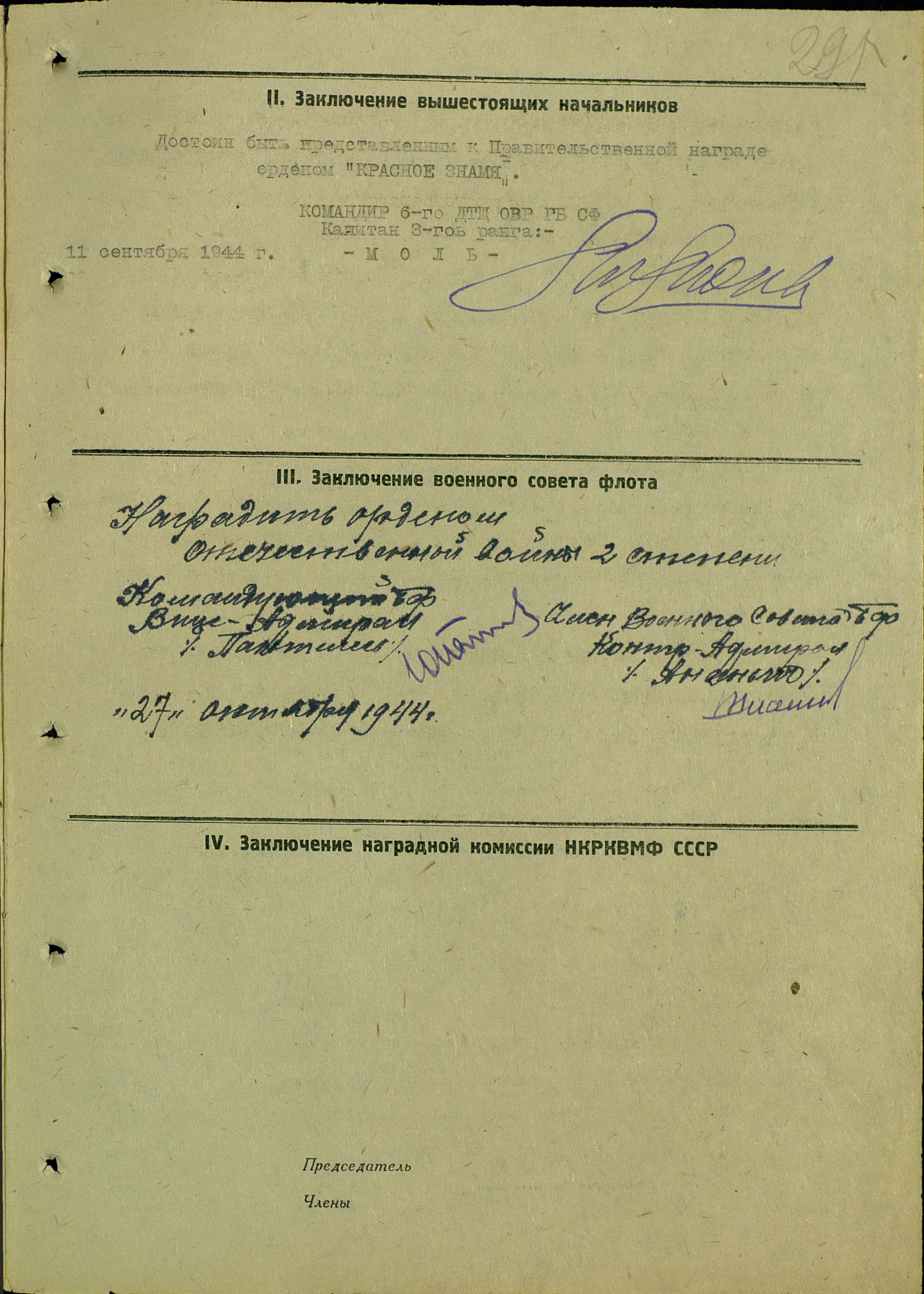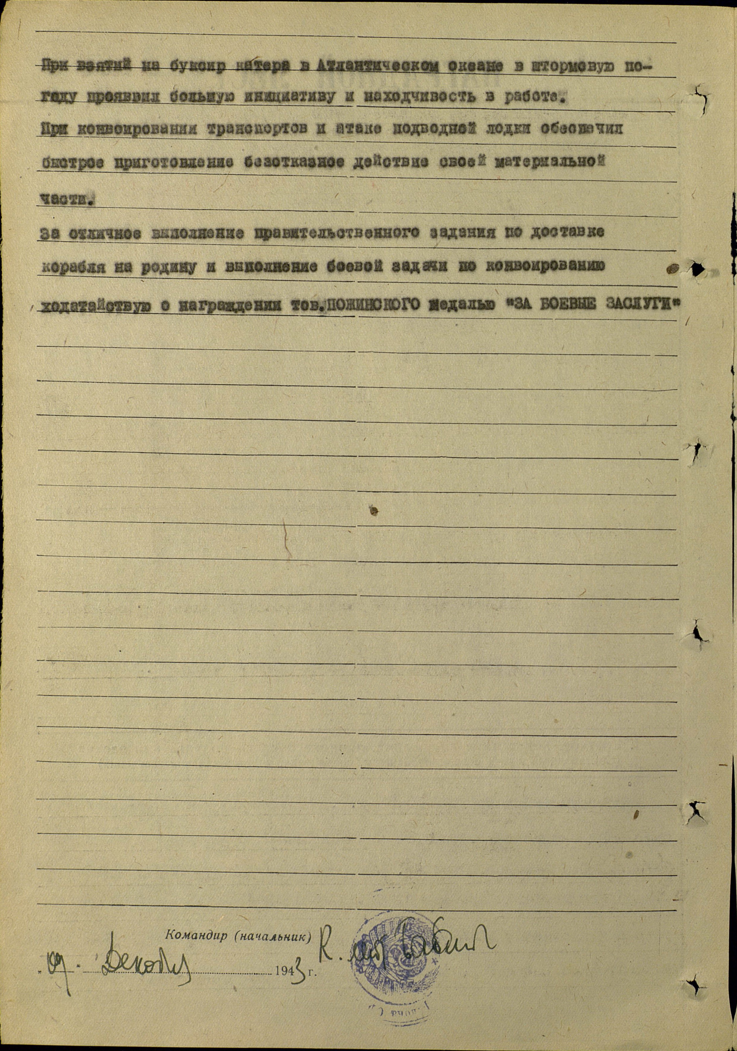 За отличное выполнение правительственного задания по доставке корабля на Родину и за выполнение боевой задачи по конвоированию ходатайствую о награждении тов. Пожинского медалью «За боевые заслуги».