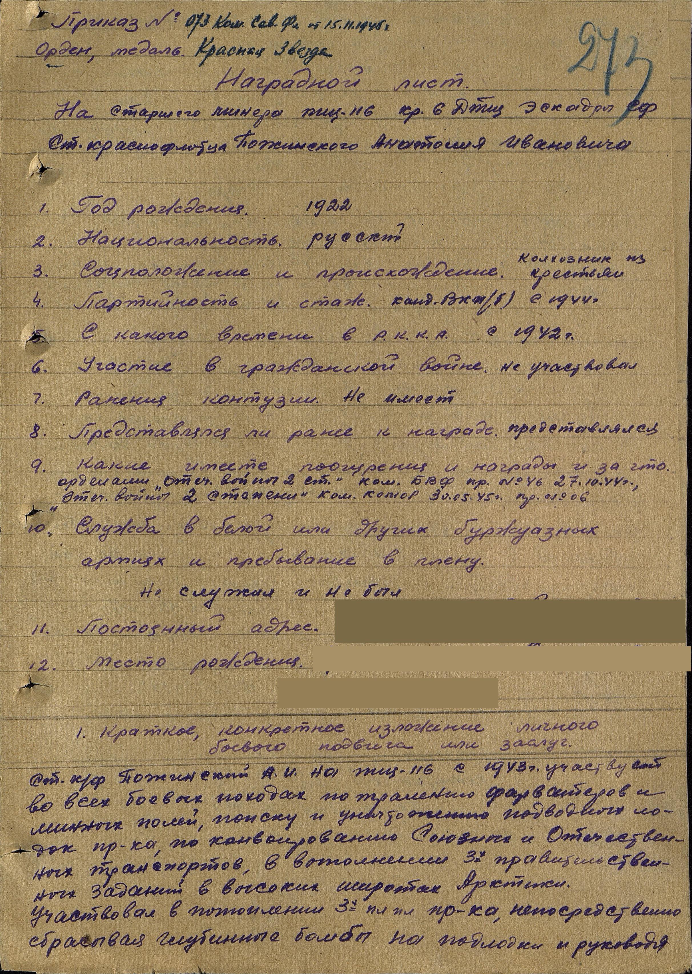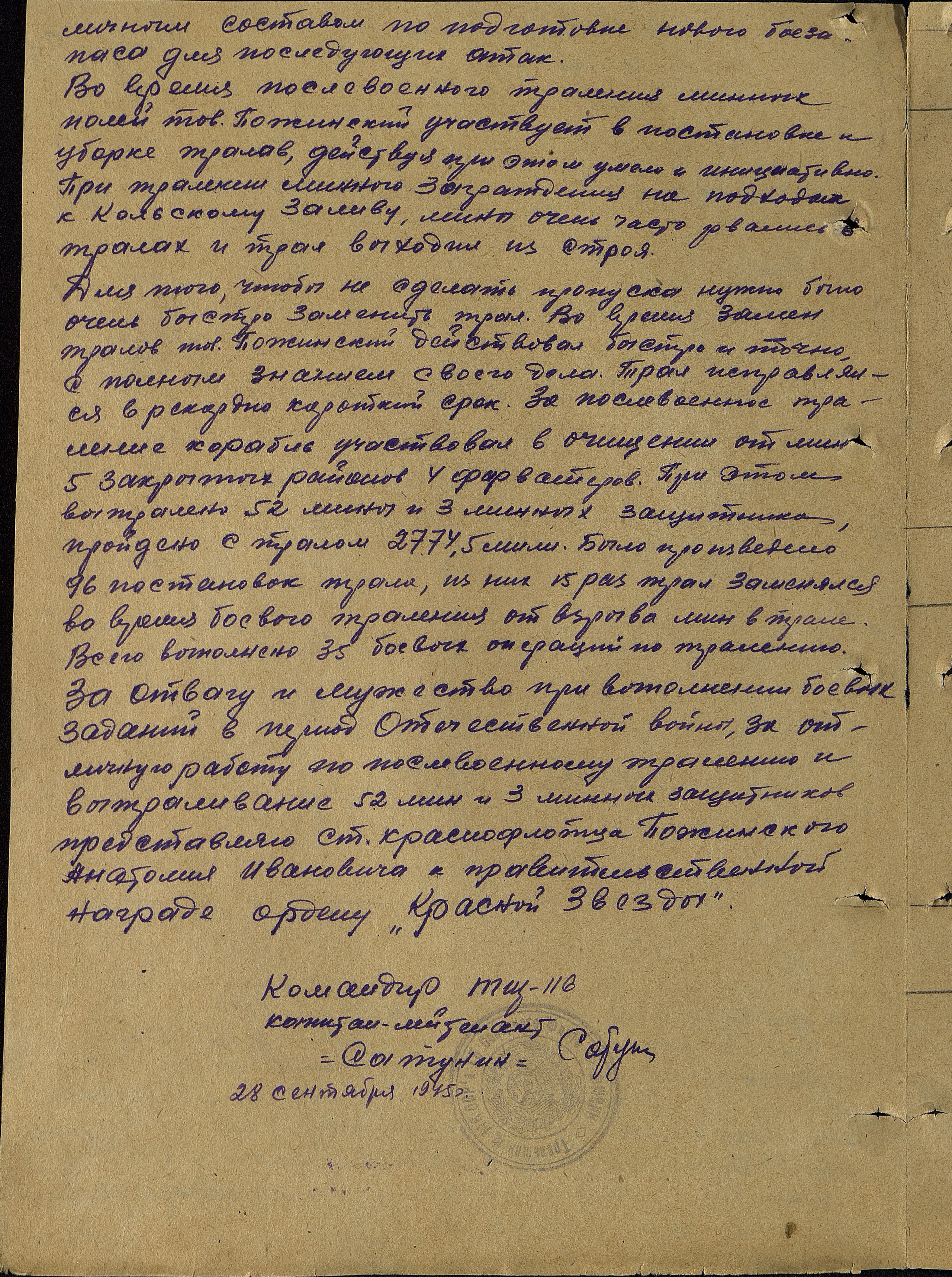 За отвагу и мужество при выполнении боевых заданий в период Отечественной войны, за отличную работу по послевоенному тралению и вытраливание 52 мин и 3 минных защитников представляю ст. краснофлотца Пожинского Анатолия Ивановича к правительственной награде – ордену Красной Звезды.