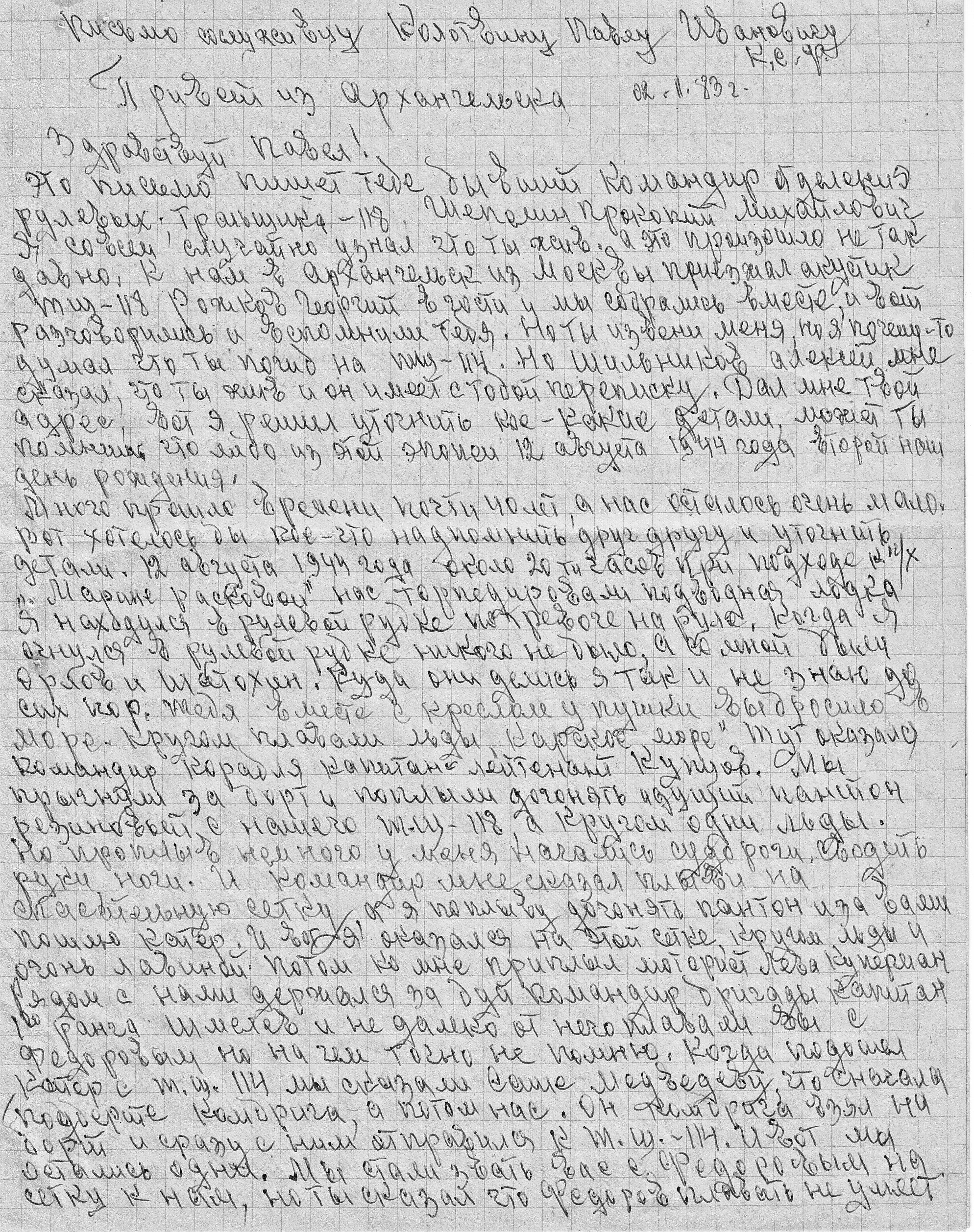 Это письмо пишет тебе бывший командир отделения рулевых тральщика – 118, Шепелин Прокопий Михайлович. Я совсем случайно узнал, что ты жив. А это произошло не так давно. К нам в Архангельск из Москвы приезжал акустик ТШ – 118 Рожков Георгий в гости' и мы собрались вместе, и вот разговорились и вспомнили тебя. Но ты извини меня, но я почему-то думал, что ты погиб на ТШ – 114. Но Шильников Алексей мне сказал, что ты жив, и он имеет с тобой переписку. Дал мне твой адрес, вот я и решил уточнить кое-какие детали, может, ты помнишь, что-либо из этой эпопеи 12 Августа 1944 года второй наш день рождения.
