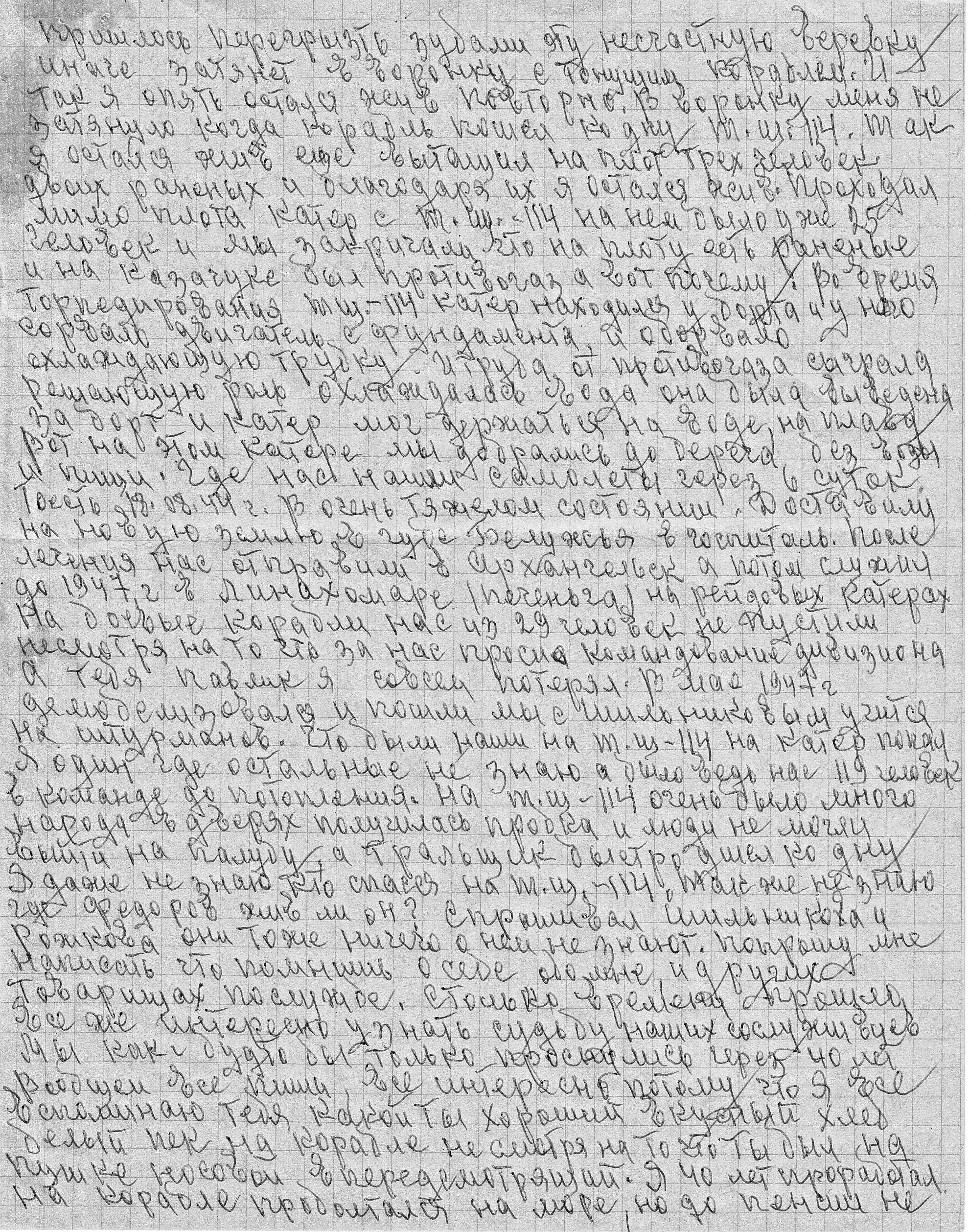 А тебя, Павлик, я совсем потерял. В мае 1947 г. демобилизовался и пошли мы с Шильниковым учиться на штурманов. Что были наши на ТЩ–114, на катер попал я один, где остальные не знаю, а было ведь нас 119 человек в команде до потопления. На ТЩ–114 очень было много народа, в дверях получилась пробка и люди не могли выйти на палубу, а тральщик быстро ушел ко дну. Я даже не знаю, кто спасся на ТЩ–114. Также не знаю, где Федоров: жив ли он? Спрашивал Шильникова и Рожкова, они тоже ничего о нем не знают. Попрошу мне написать, что помнишь о себе, обо мне и других товарищах по службе. Столько времени прошло, все же интересно узнать судьбу наших сослуживцев. Мы как будто бы только проснулись через 40 лет. В общем, все пиши, все интересно, потому что я все вспоминаю тебя, какой ты хороший вкусный хлеб белый пек на корабле, не смотря на то, что ты был на пушке носовой впередсмотрящий. Я 40 лет проработал на корабле, проболтался на море, но до пенсии не дотянул. Ранения и эти купания все же сделали свое дело. В 1973 г. меня парализовало прямо в море. Дали II гр. и вот сидим, отдыхаем. Даже климат врачи не разрешают менять. Работать не разрешают, чувствую себя плохо. Женился в 1951 г. имею сына и дочь, живут отдельно. Пиши, Павел, очень жду от тебя. Желаю тебе хорошего здоровья, чистого неба над головой, чтоб ни нам, ни нашим детям не испытать, что испытали и пережили мы. Привет всей семье. Проша.