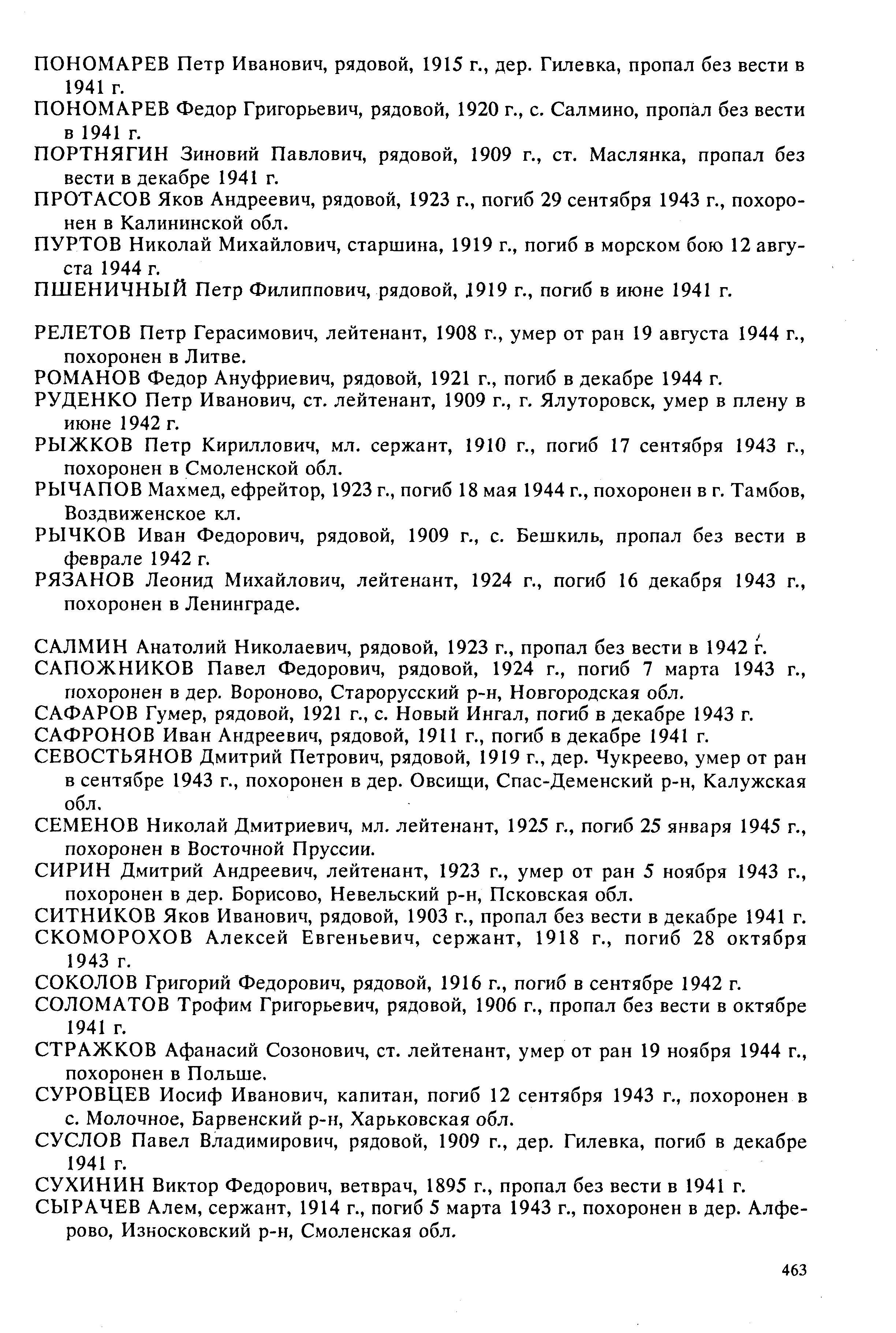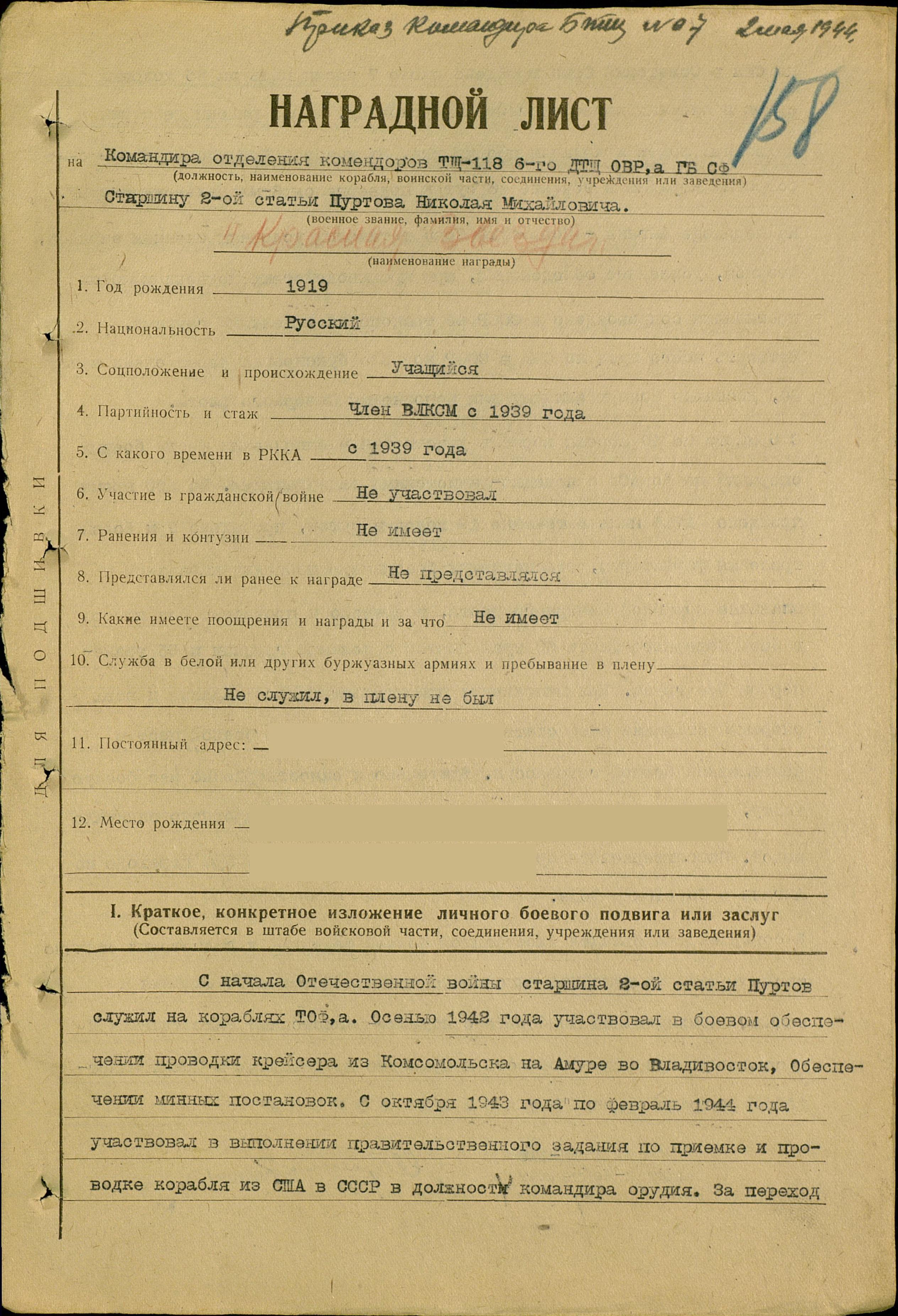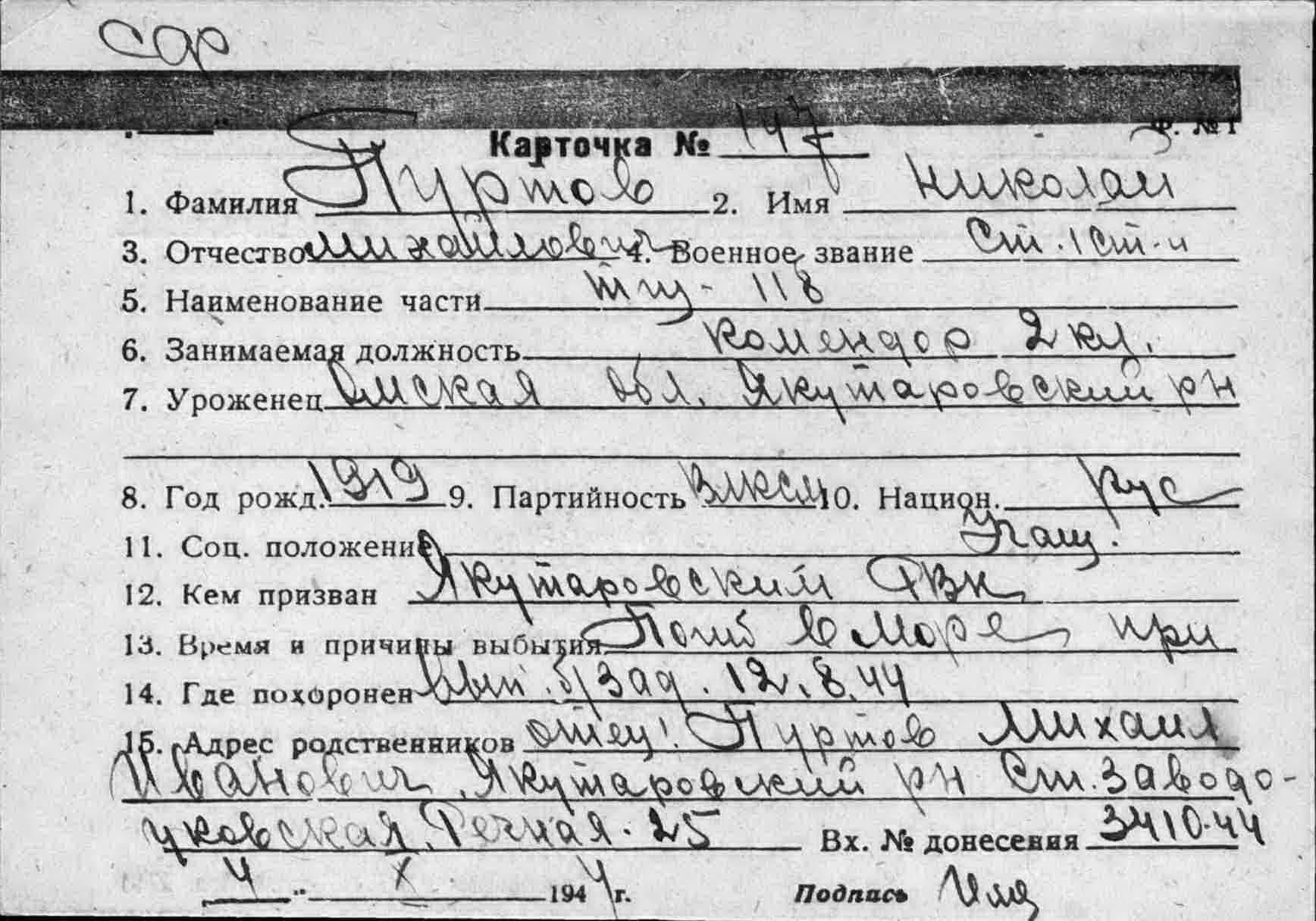 466. Пуртов Николай Михайлович, воинское звание – старшина 1 статьи; должность и специальность – командир отделения комендоров, комендор 2 кл.; год рождения – 1919 г.; партийность и № партдокумента (комсомольского билета) – КСМ; место рождения – Омская обл., Ялуторовский р-н, ; социальное положение – учащийся; национальность – русский; срок срочной службы – 1939 г.; последнее место службы – минный тральщик ТЩ-118, бригада траления ОВР ГБ СФ; каким РВК призван – Ялуторовским РВК; по какой причине, где и когда выбыл – погиб в море при выполнении боевого задания, 12.08.1944 г.; семейное положение – холост; родственники (фамилия, имя, отчество, адрес) – отец: Михаил Иванович, Ялуторовский р-н, ст. Заводоуковск, Рабочая 28.
