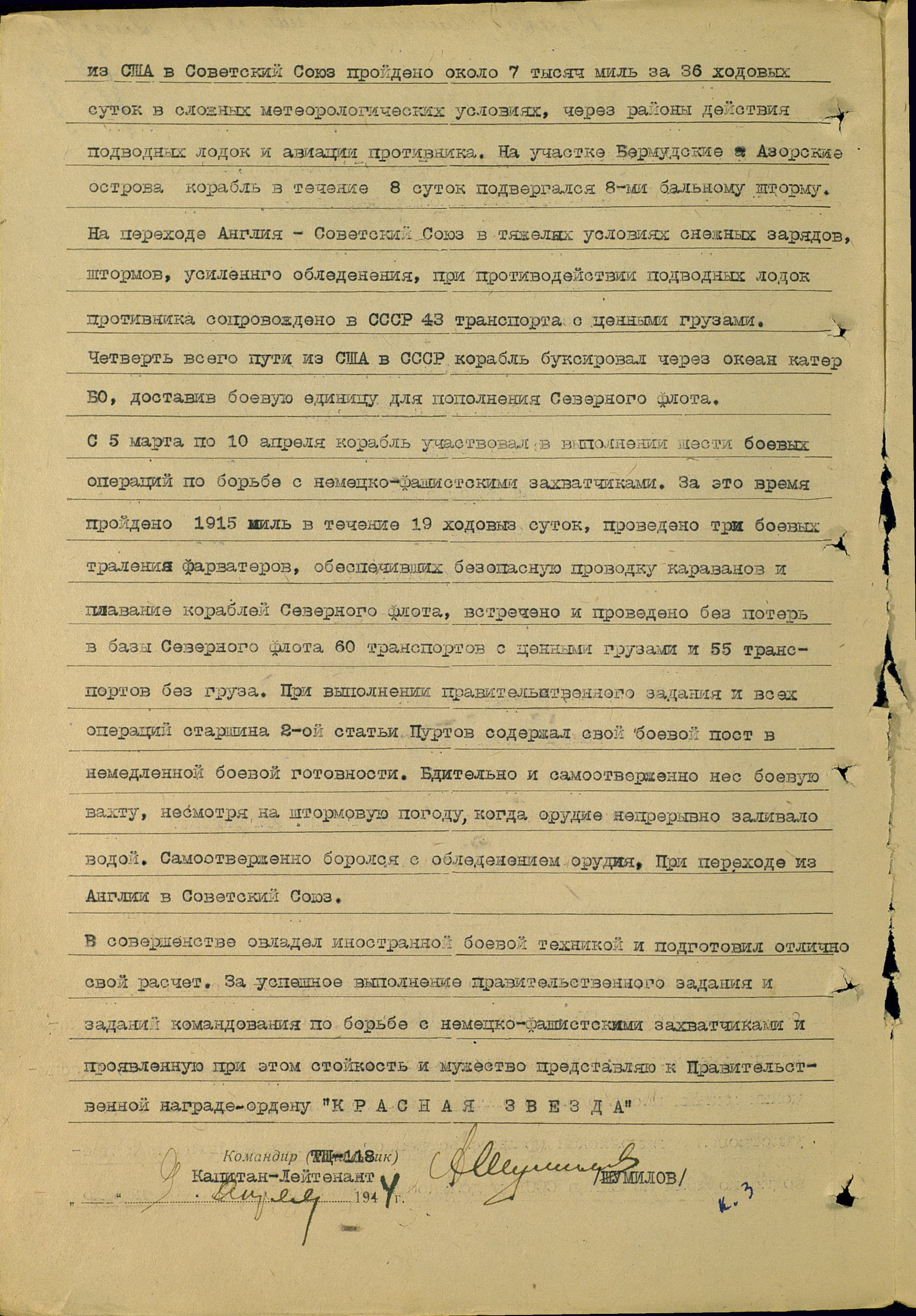С 5 марта по 10 апреля корабль участвовал в выполнении шести боевых операций по борьбе с немецко-фашистскими захватчиками. За это время пройдено 1915 миль в течение 19 ходовых суток, проведено три боевых траления фарватеров, обеспечивших безопасную проводку караванов и плавание кораблей СФ, встречено и проведено без потерь в базы СФ 60 транспортов с ценными грузами и 55 транспортов без груза. При выполнении правительственного задания и всех операций старшина 2 статьи Пуртов содержал свой боевой пост в немедленной боевой готовности. Бдительно и самоотверженно нес боевую вахту, несмотря на штормовую погоду, когда орудие непрерывно заливало водой. Самоотверженно боролся с обледенением орудия при переходе из Англии в Советский Союз.