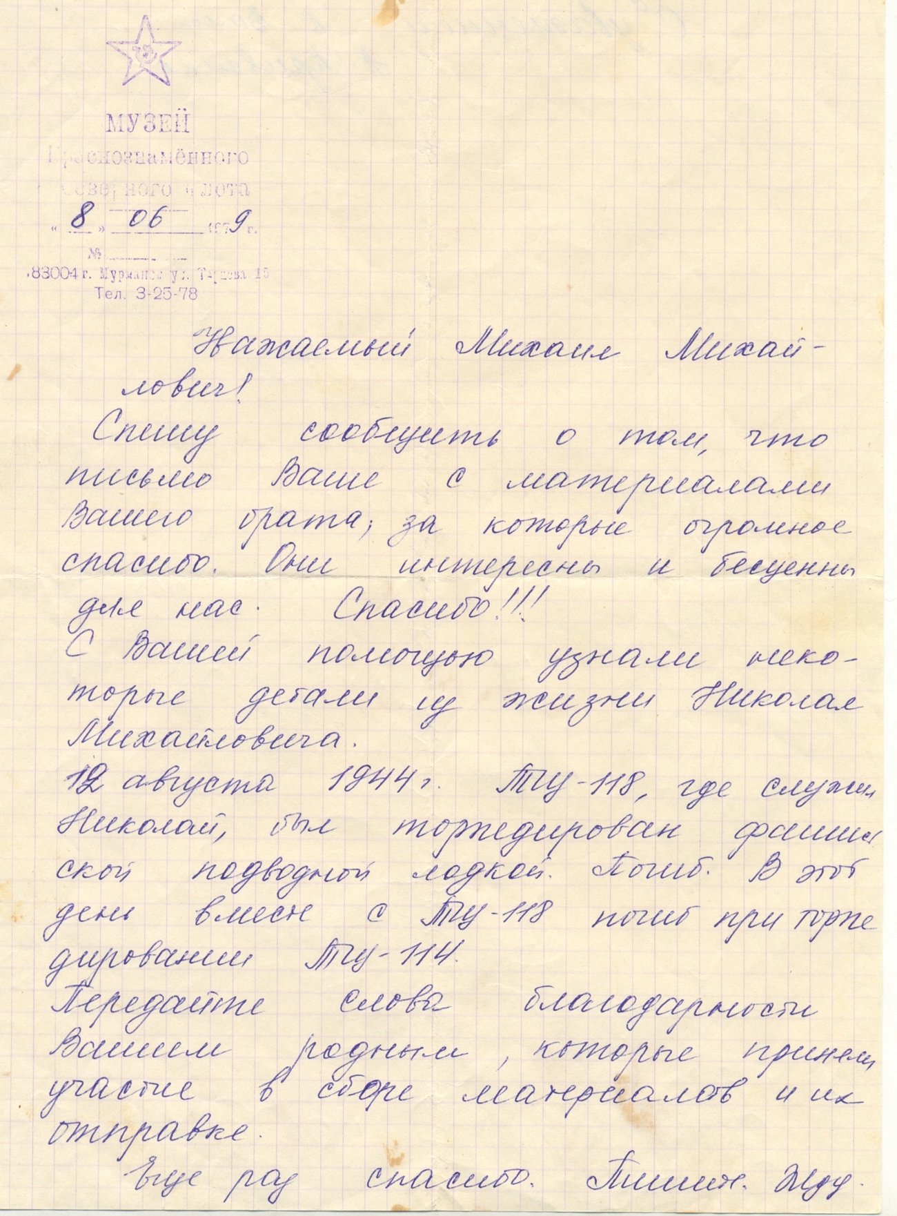 Письмо из музея Северного флота от 08.06.79 г. на имя Пуртова Михаила Михайловича.