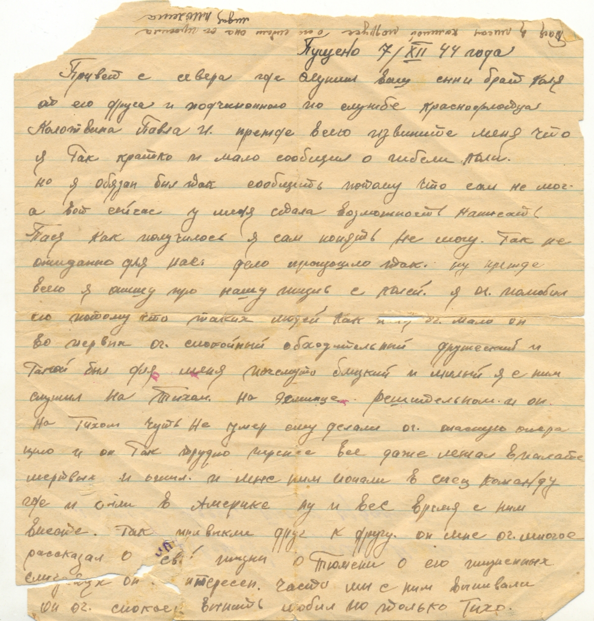 Письмо от друга Колотвина Павла И. на имя сестры Николая Михайловича Таисии Михайловны (мать Глебова Николая Фёдоровича) от 07.12.44. г.