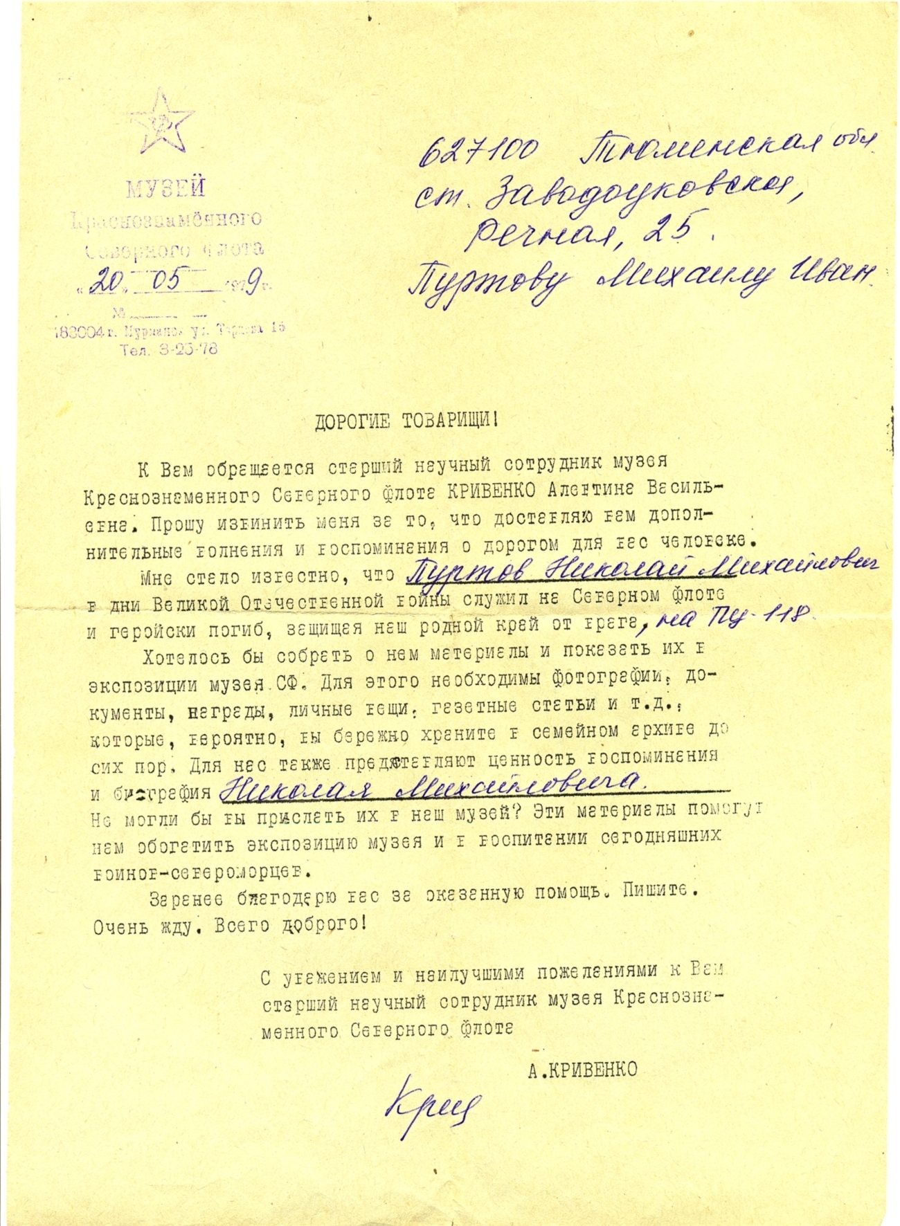 Письмо из музея Северного флота от 20.05.79 г. на имя Пуртова Михаила Ивановича.