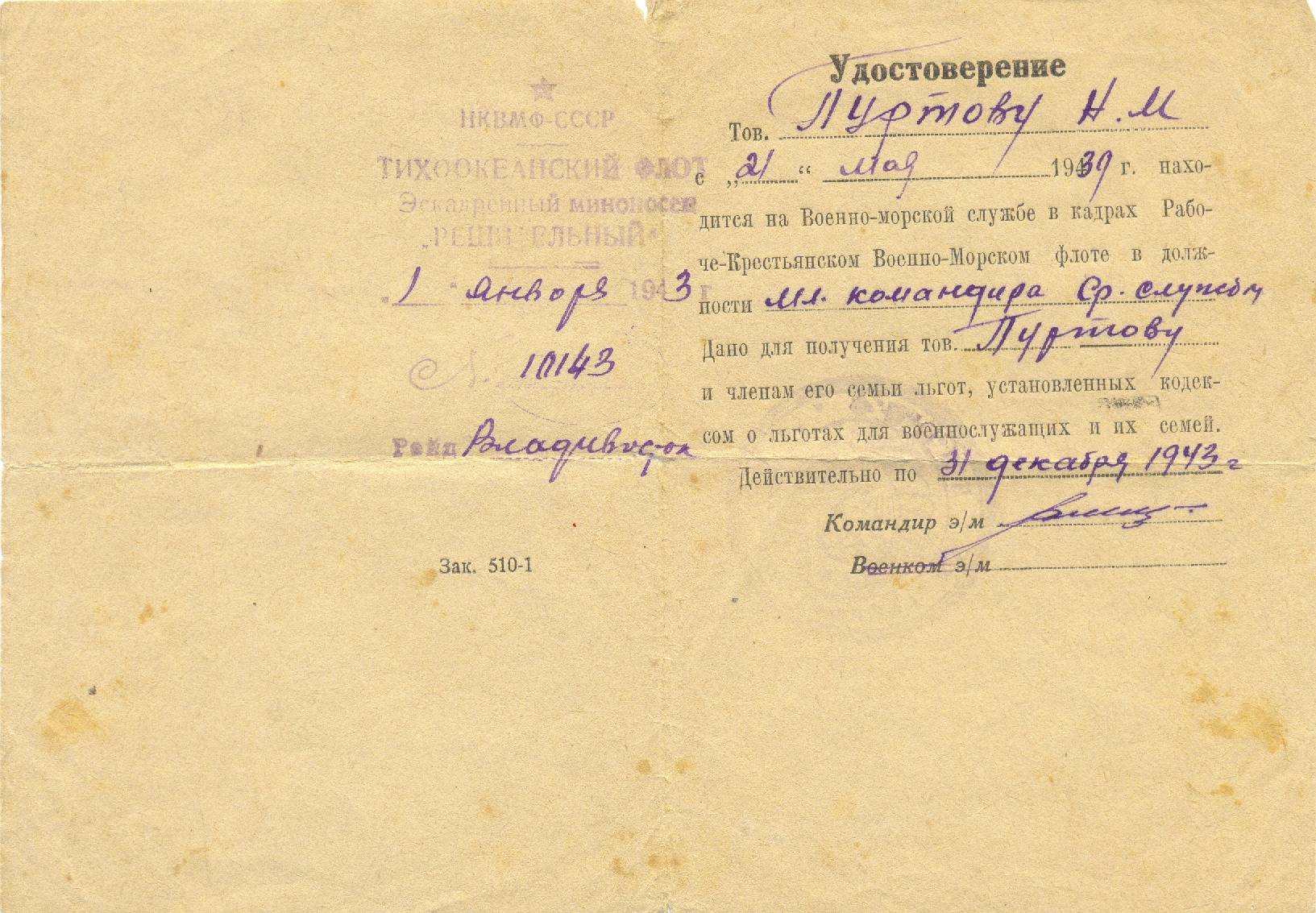 Удостоверение с эсминца «Решительный». Справка и удостоверение присланы родителям для получения пособия семье военнослужащего.