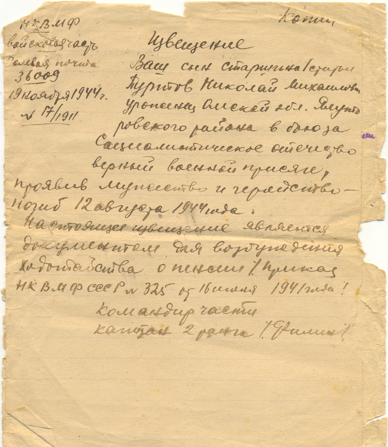 Извещение о гибели от 14.11.44 г.