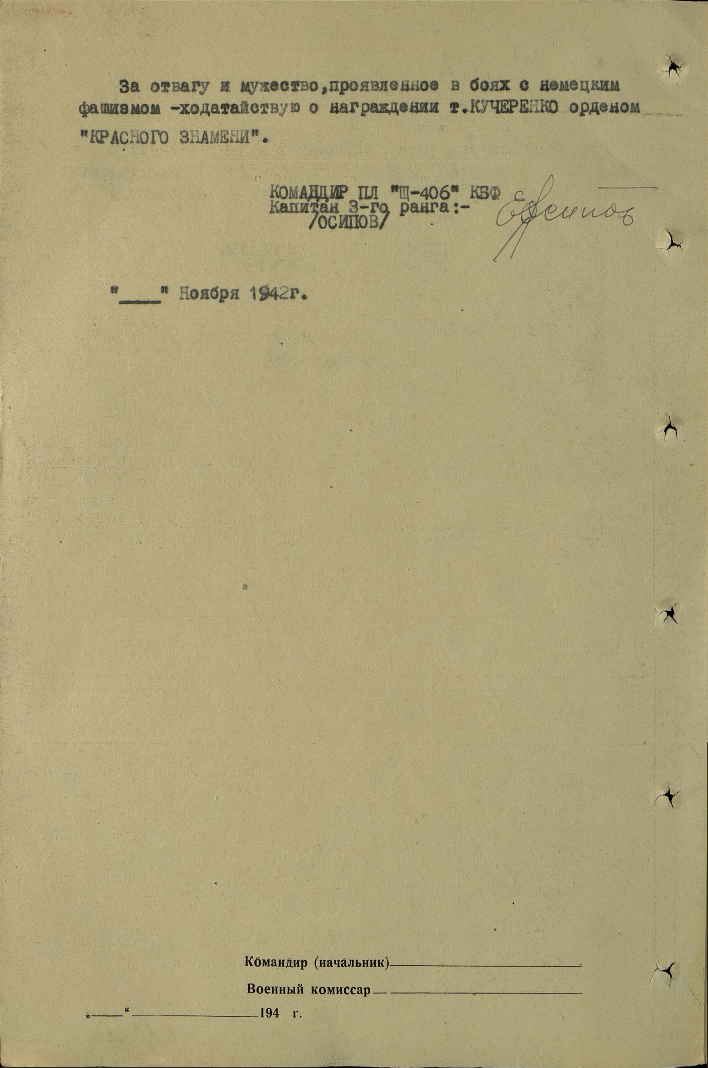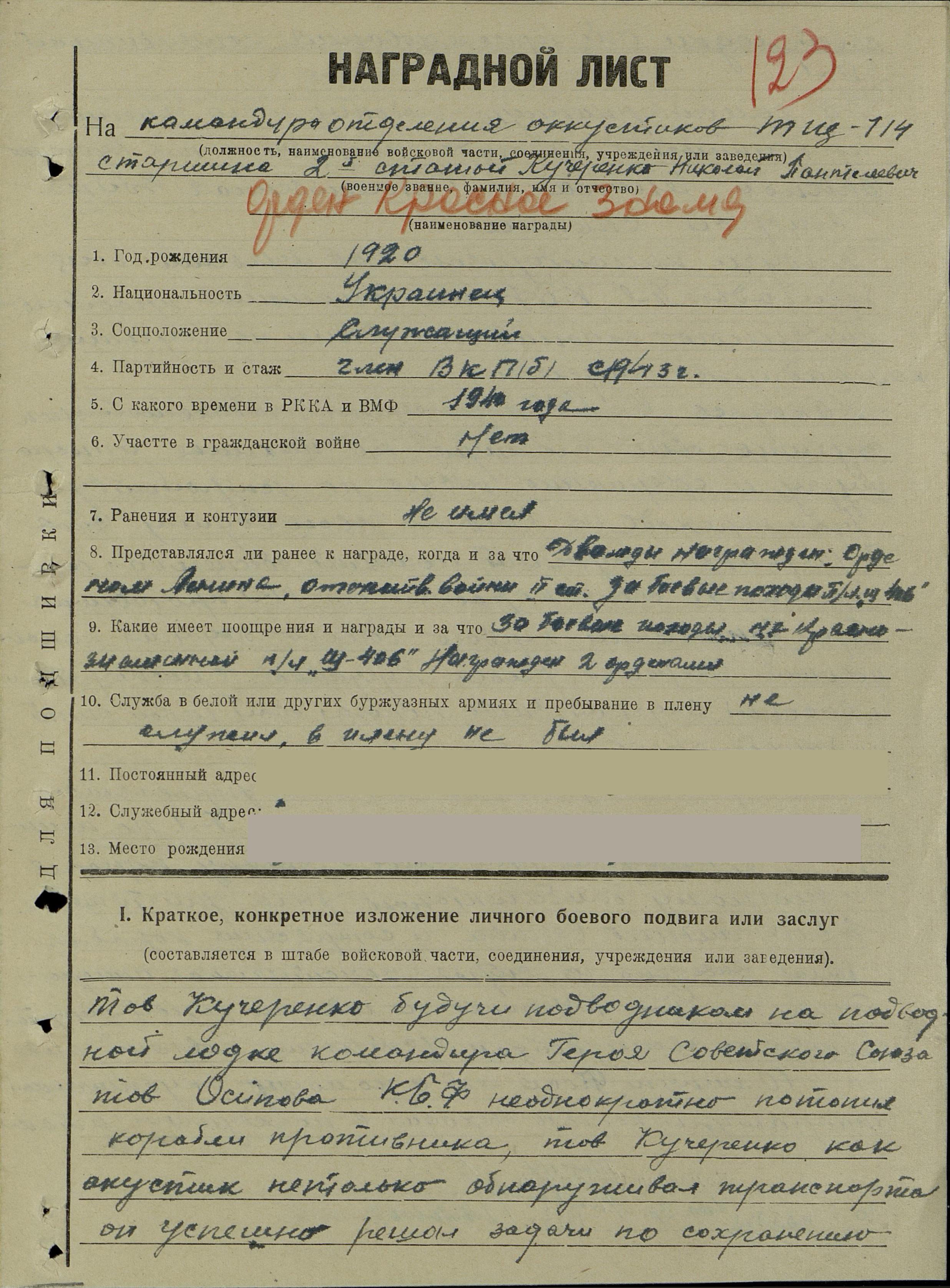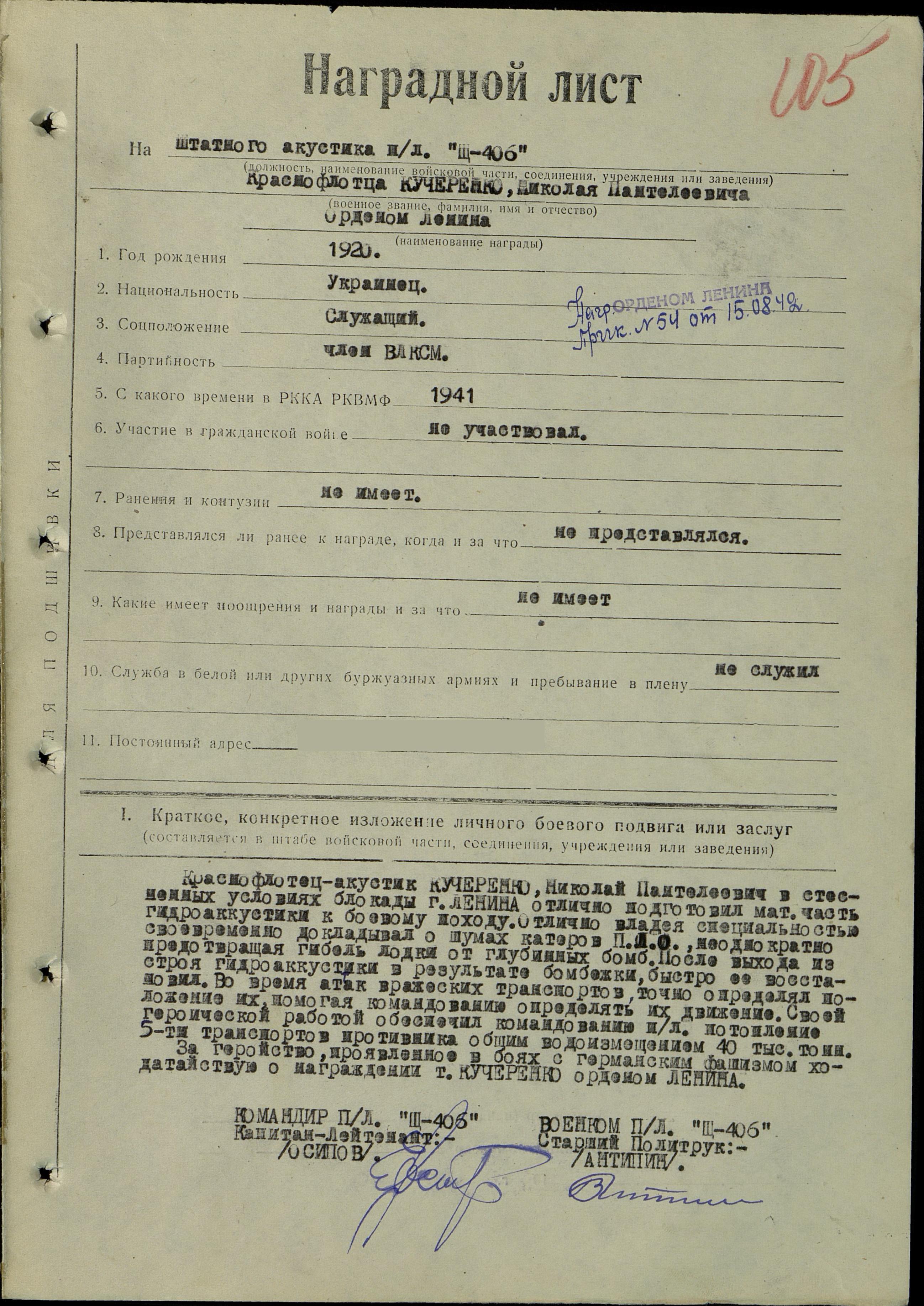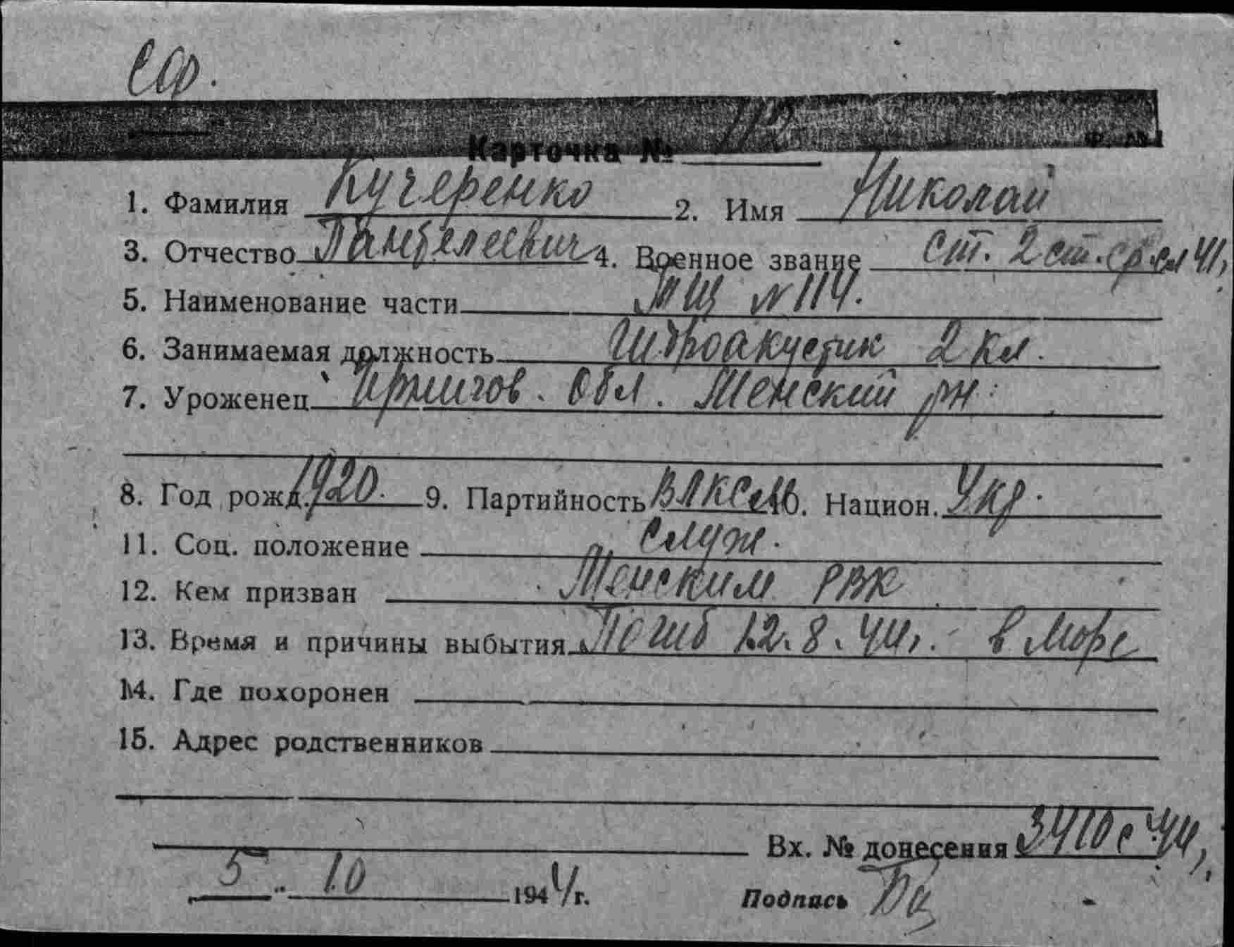 306. Кучеренко Николай Пантелеевич, воинское звание – старшина 2 статьи; должность и специальность – командир отделения акустиков, … 2 кл.; год рождения – 1920 г.; партийность и № партдокумента (комсомольского билета) – ВЛКСМ; место рождения – Черниговская обл., Менский р-н; социальное положение – служащий; национальность – украинец; срок срочной службы – 1941 г.; последнее место службы – минный тральщик ТЩ-114, бригада траления ОВР ГБ СФ; каким РВК призван – Менским РВК; по какой причине, где и когда выбыл – погиб в море при выполнении боевого задания, 12.08.1944 г.; семейное положение – холост.