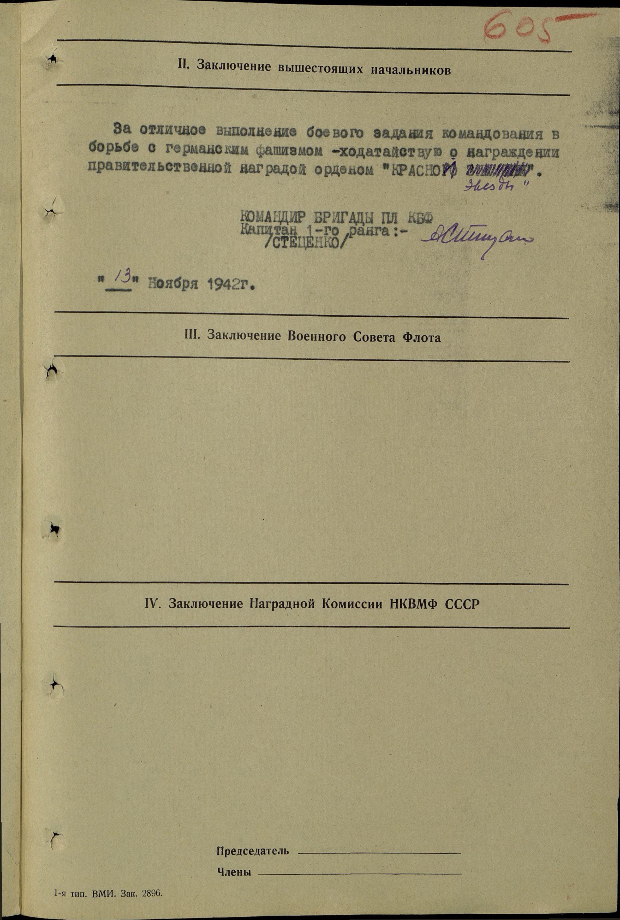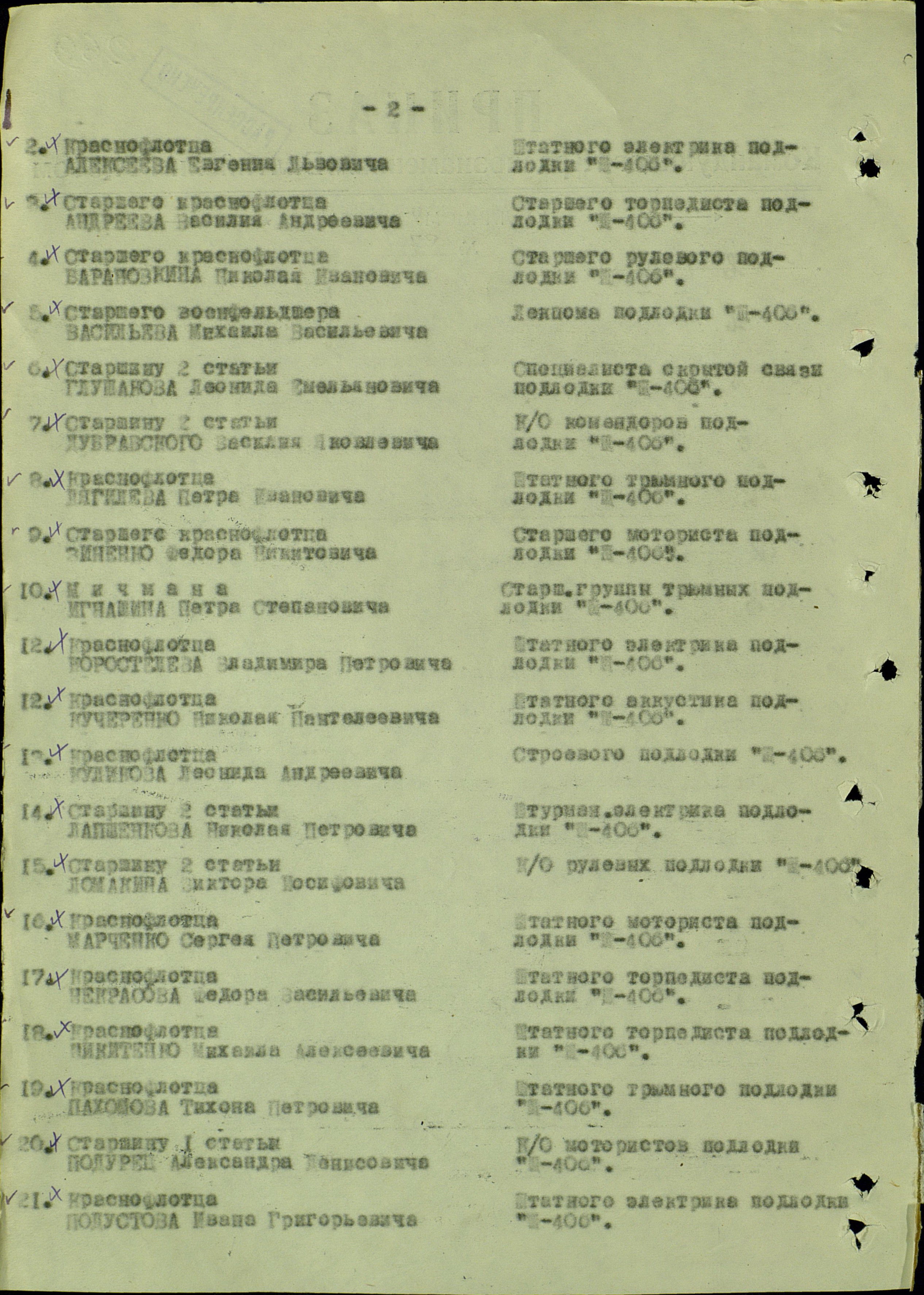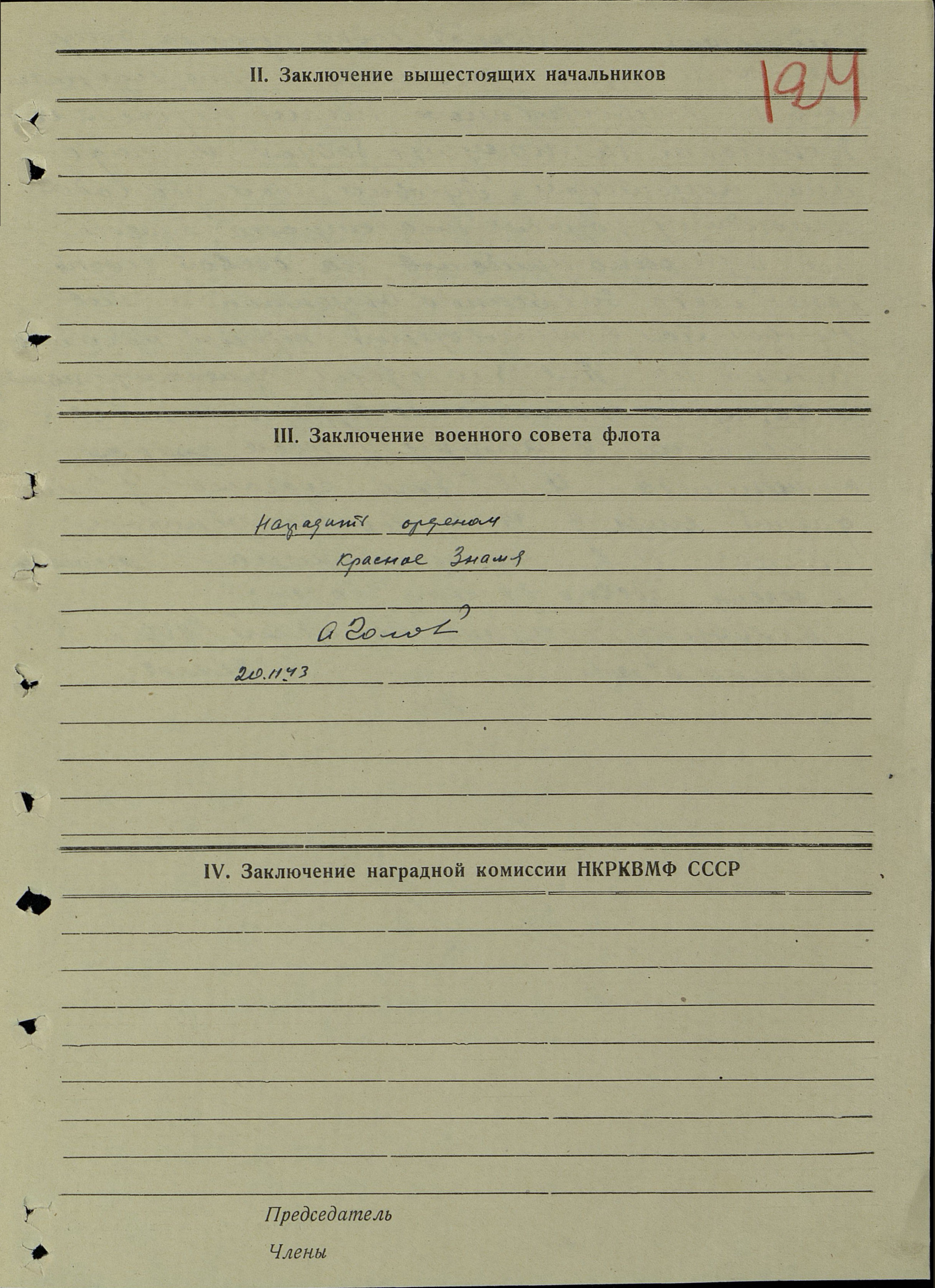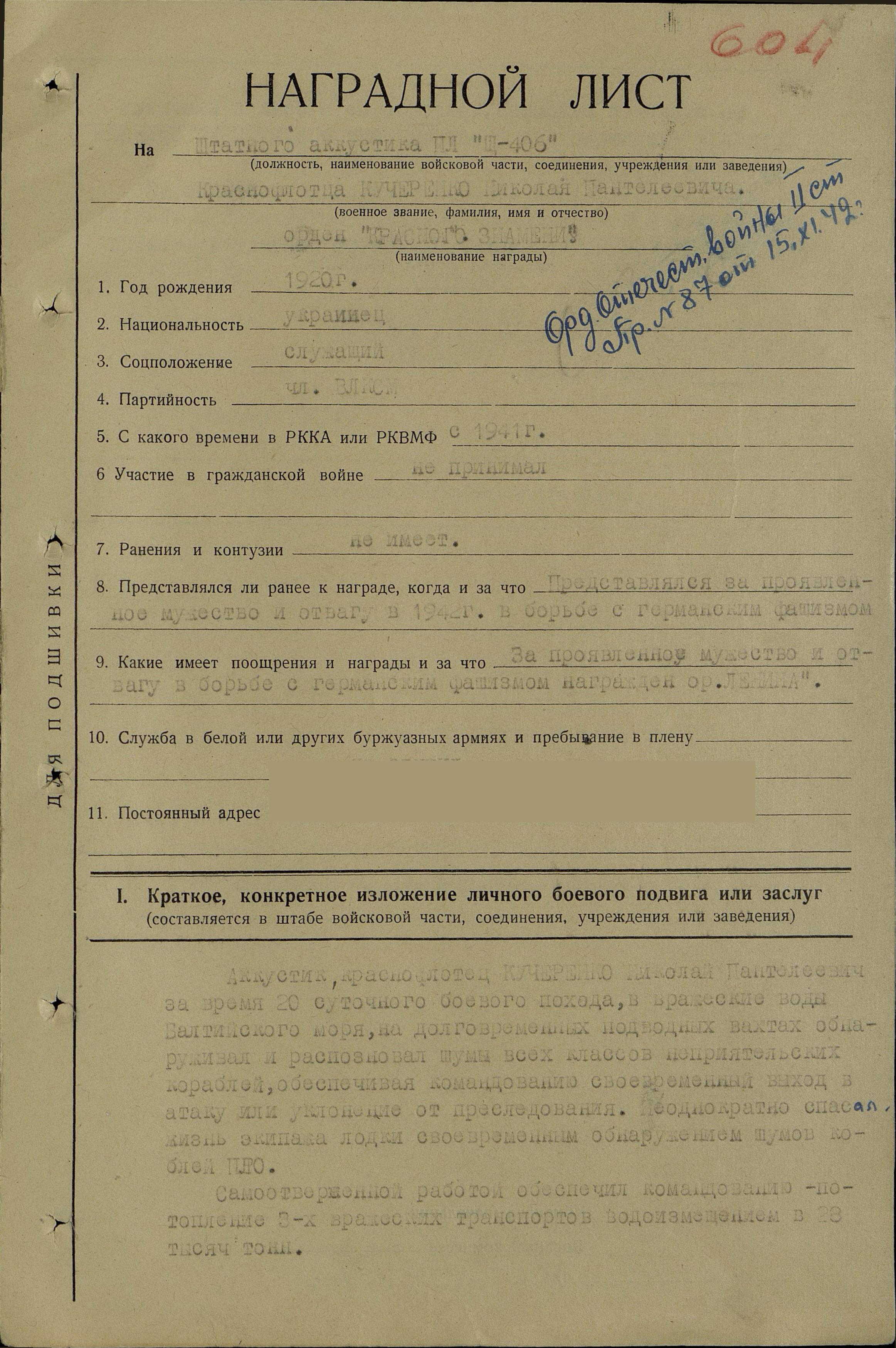 306. Кучеренко Николай Пантелеевич, воинское звание – старшина 2 статьи; должность и специальность – командир отделения акустиков, … 2 кл.; год рождения – 1920 г.; партийность и № партдокумента (комсомольского билета) – ВЛКСМ; место рождения – Черниговская обл., Менский р-н; социальное положение – служащий; национальность – украинец; срок срочной службы – 1941 г.; последнее место службы – минный тральщик ТЩ-114, бригада траления ОВР ГБ СФ; каким РВК призван – Менским РВК; по какой причине, где и когда выбыл – погиб в море при выполнении боевого задания, 12.08.1944 г.; семейное положение – холост.