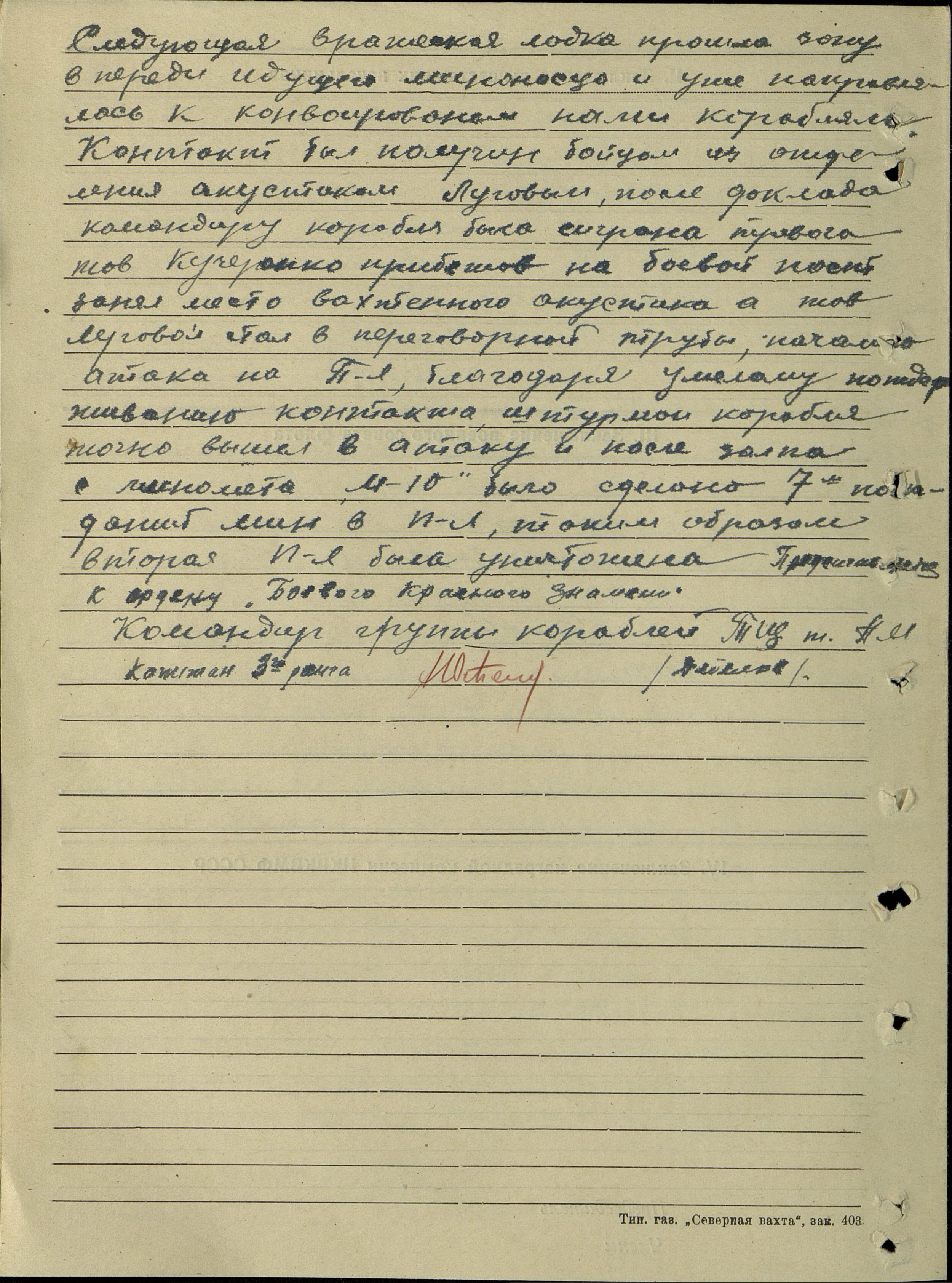 Этот поход Е. Я. Осипова по времени был значительно короче первого, а результат достоин звания Краснознаменного корабля — его боевой счет увеличился на три транспорта. Забегу немного вперед. Весной 1943 года Краснознаменная «Щ-406» под командованием Героя Советского Союза капитана 3 ранга Е. Я. Осипова снова вышла в море для выполнения боевых заданий. К нашему великому сожалению, это, был ее последний боевой поход. Никто не знает места, причин ее гибели. Евгений Осипов навечно зачислен в списки подводников...