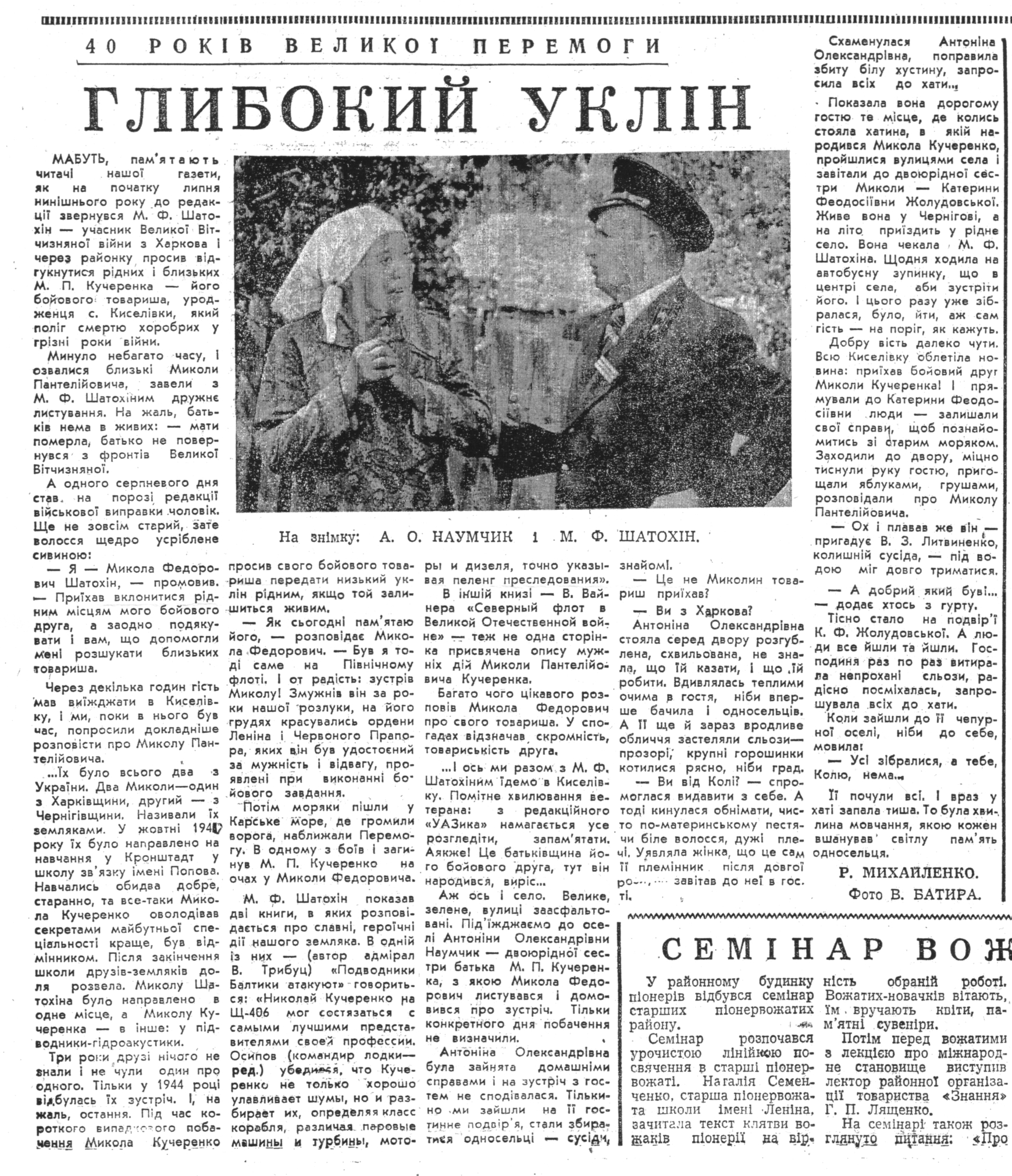 …Их было всего двое из Украины. Два Николая - один из Харковщины, другой - из Черниговщины. Называли их земляками. В октябре 1940 года их направили на обучение в Кронштадт в школу связи им. Попова. Обучались оба хорошо, старательно, но все-таки Николай Кучеренко овладел секретами будущей специальности лучше, был отличником. После окончания школы друзей-земляков судьба развела. Николай Шатохин был направлен в одно место, Николай Кучеренко - в другое: в подводники-гидроакустики.