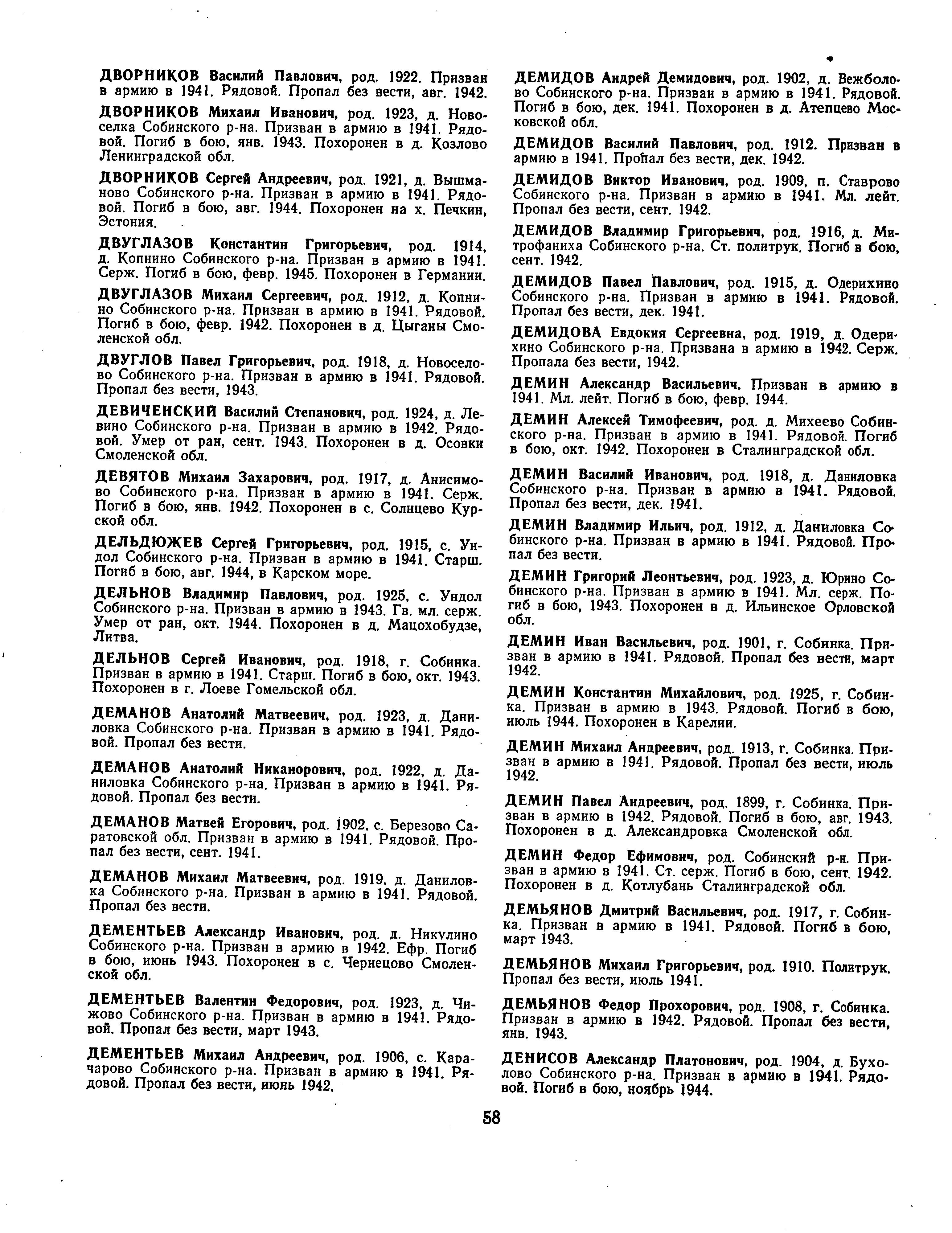 Дельдюжев Сергей Григорьевич, дата рождения – 1915 г.; место рождения – с. Ундол Собинского р-на; дата и место призыва – 1941 г.; воинское звание – старшина; причина выбытия – погиб в бою; дата выбытия – 08.1944; место выбытия – в Карском море; название книги Памяти – книга Памяти. Владимирская область. Том 6.
