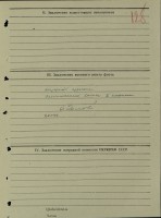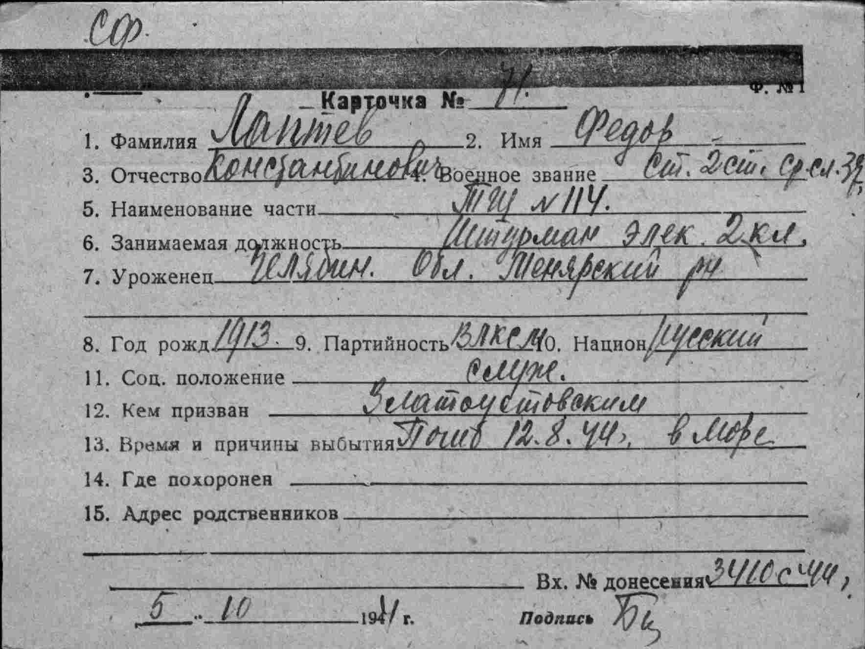 327. Лаптев Фёдор Константинович, воинское звание – старшина 2 статьи; должность и специальность – командир отделения штурманских электриков, штурманский электрик 2 кл.; год рождения – 1913 г.; партийность и № партдокумента (комсомольского билета) – ВЛКСМ; место рождения – Челябинская обл., Менярский р-н; социальное положение – служащий; национальность – русский; срок срочной службы – 1937 г.; последнее место службы – минный тральщик ТЩ-114, бригада траления ОВР ГБ СФ; каким РВК призван – Златоустовским РВК; семейное положение – женат; по какой причине, где и когда выбыл – погиб в море при выполнении боевого задания, 12.08.1944 г.