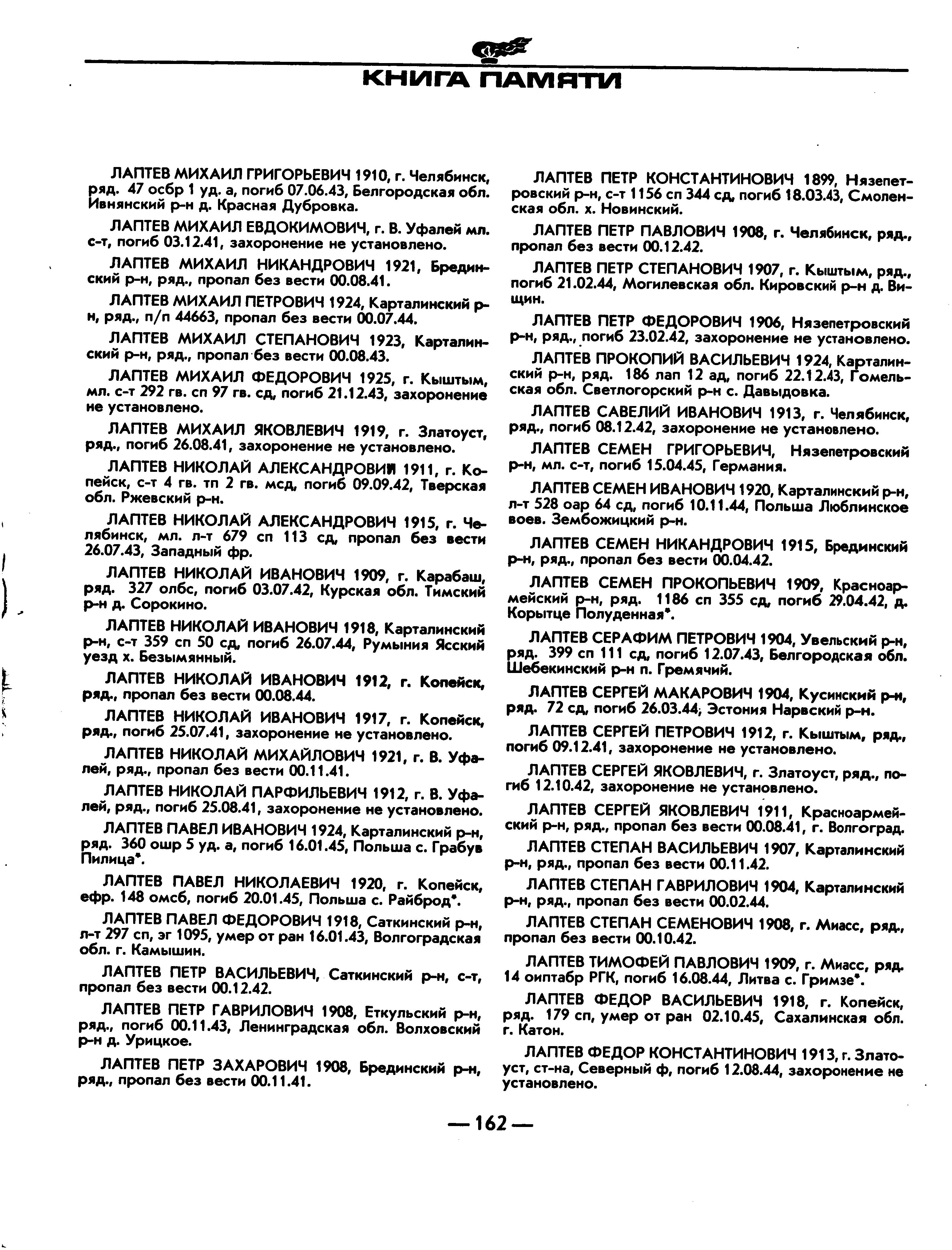 Книга Памяти Челябинской области составлялась по спискам Центрального архива Министерства обороны, городских и районных военкоматов области. В Книгу вошли воины призванные, захороненные либо проживающие после войны на территории Челябинской области. Первые 15 томов книги памяти составлялись по месту призыва военнослужащих участвовавших в Великой Отечественной войне 1941-1945 гг. Златоуст это место призыва Лаптева Федора Константиновича. Для получения более подробной информации рекомендуем Вам обратиться в военный комиссариат г. Златоуста по адресу 456209, г.Златоуст, ул.Мира, 14, тел 7 (35136) 36750.