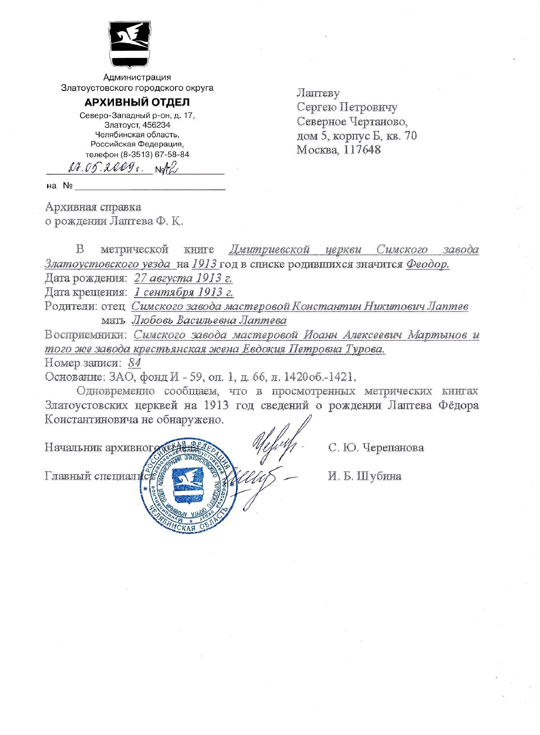 Одновременно сообщаем, что в просмотренных метрических книгах, Златоустовских церквей на 1913 год сведений о рождении Лаптева Федора Константиновича не обнаружено.