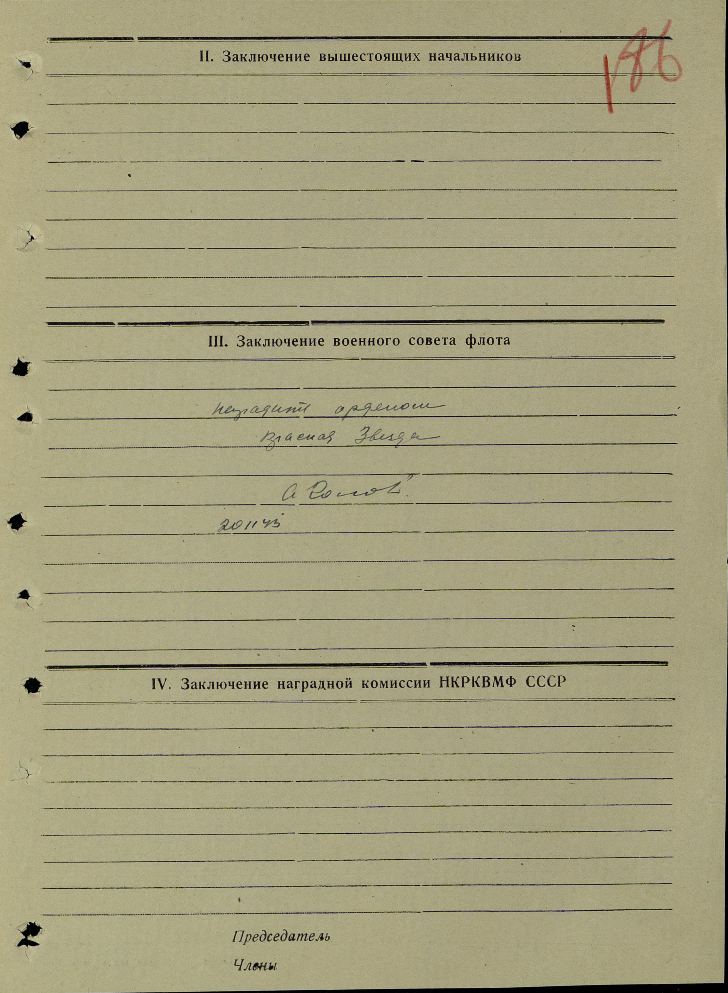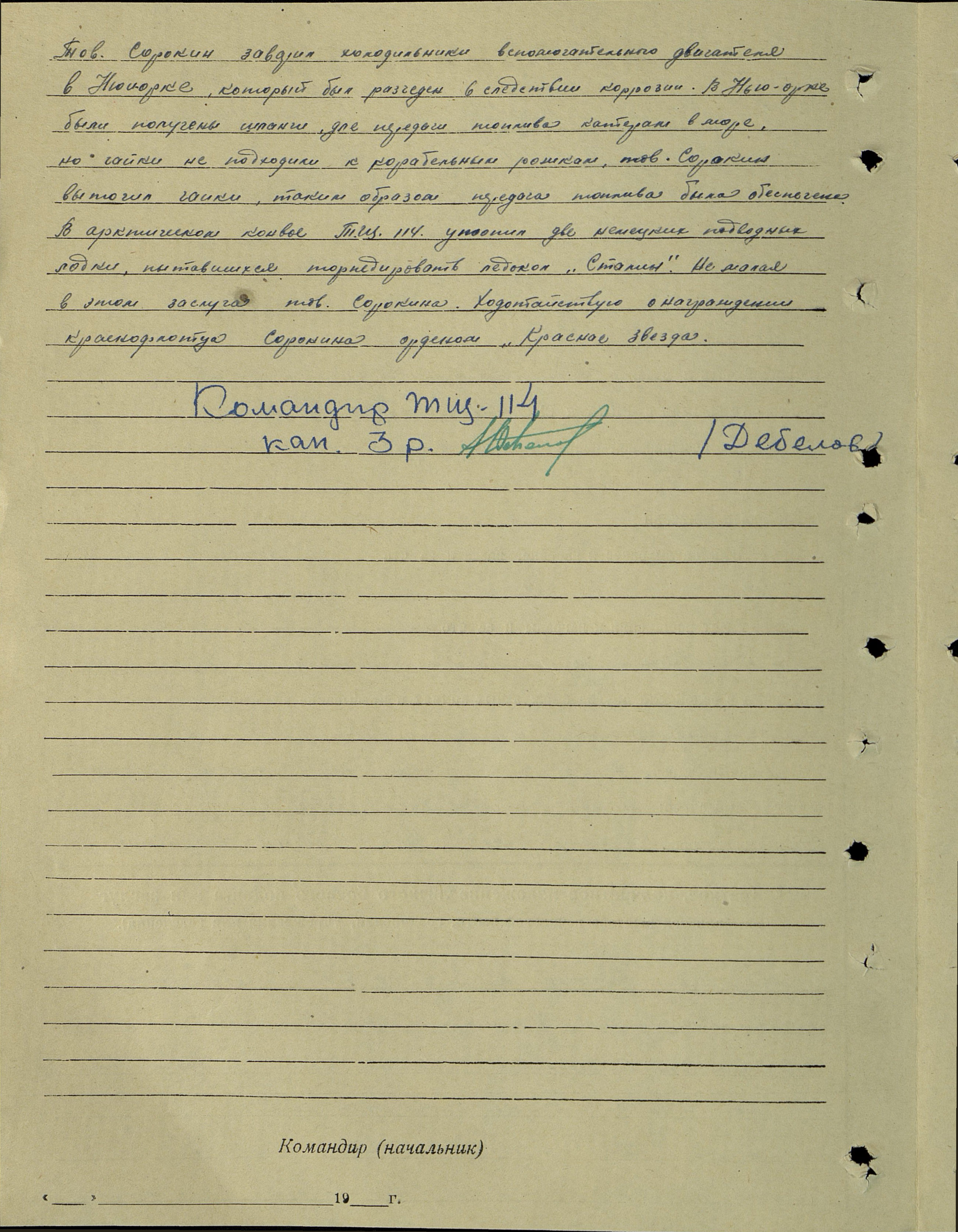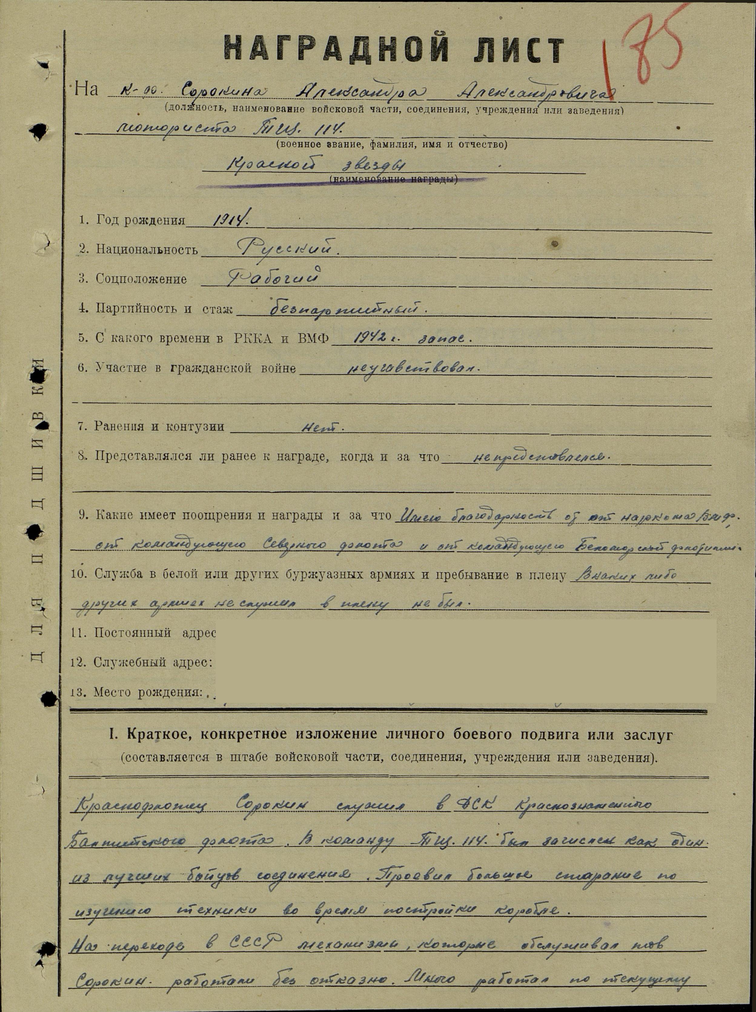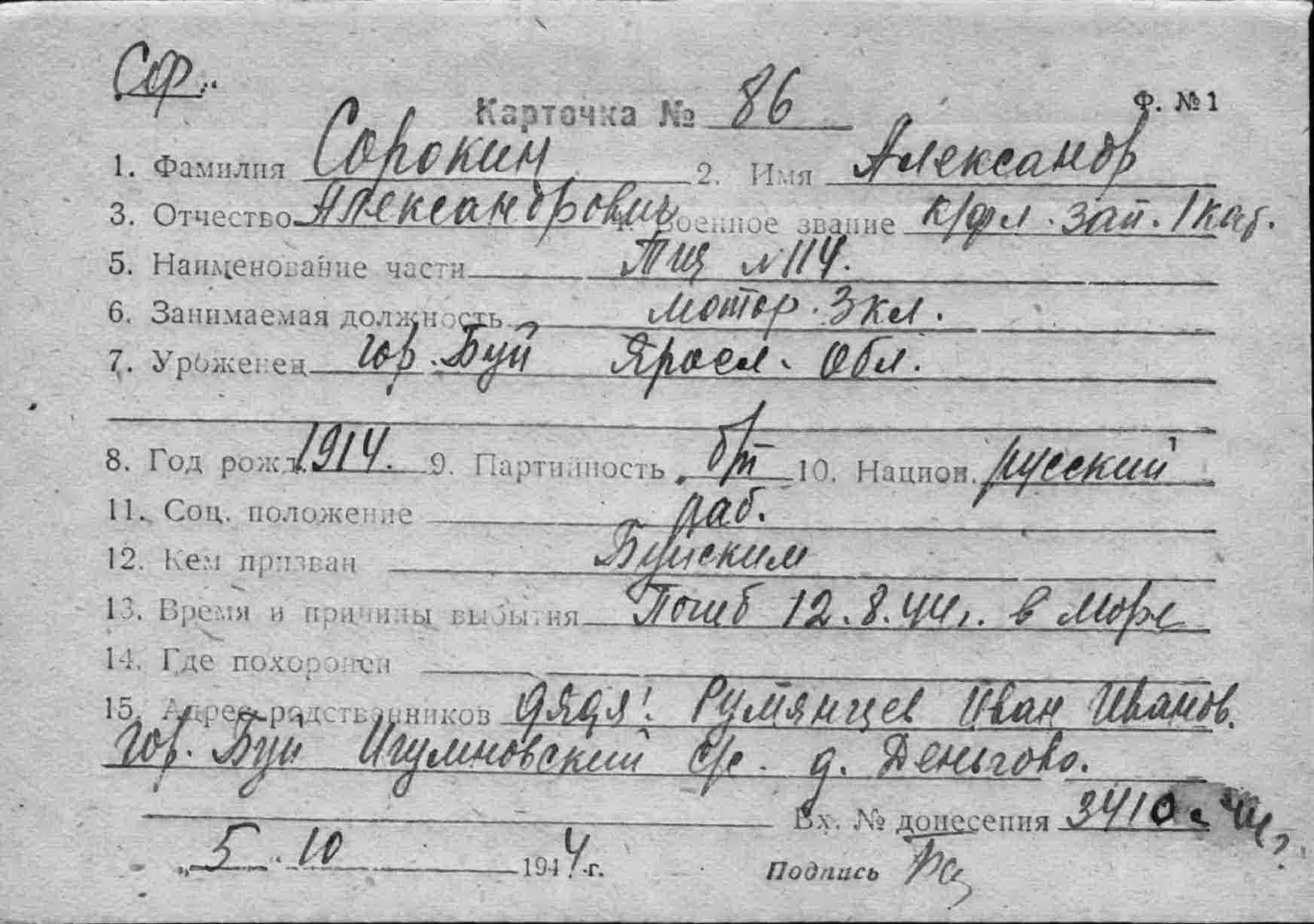 Сорокин Александр Александрович, воинское звание – краснофлотец; должность и специальность – моторист 3 кл.; год рождения – 1914 г.; партийность и № партдокумента (комсомольского билета) – беспартийный; место рождения – г. Буй, Ярославская обл.; социальное положение – рабочий; национальность – русский; срок срочной службы – запас 1 кат.; последнее место службы – тральщик ТЩ-114, бригада траления ОВР ГБ СФ; каким РВК призван – Буйским РВК; по какой причине, где и когда выбыл – погиб в море при выполнении боевого задания, 12.08.1944 г.; семейное положение – холост; родственники (фамилия, имя, отчество, адрес) – дядя: Суманцев (Румянцев) Иван Иванович, г. Буй, Игмуновский (Игумновский) р-н (с/с), д. Денагово (Деньгово).