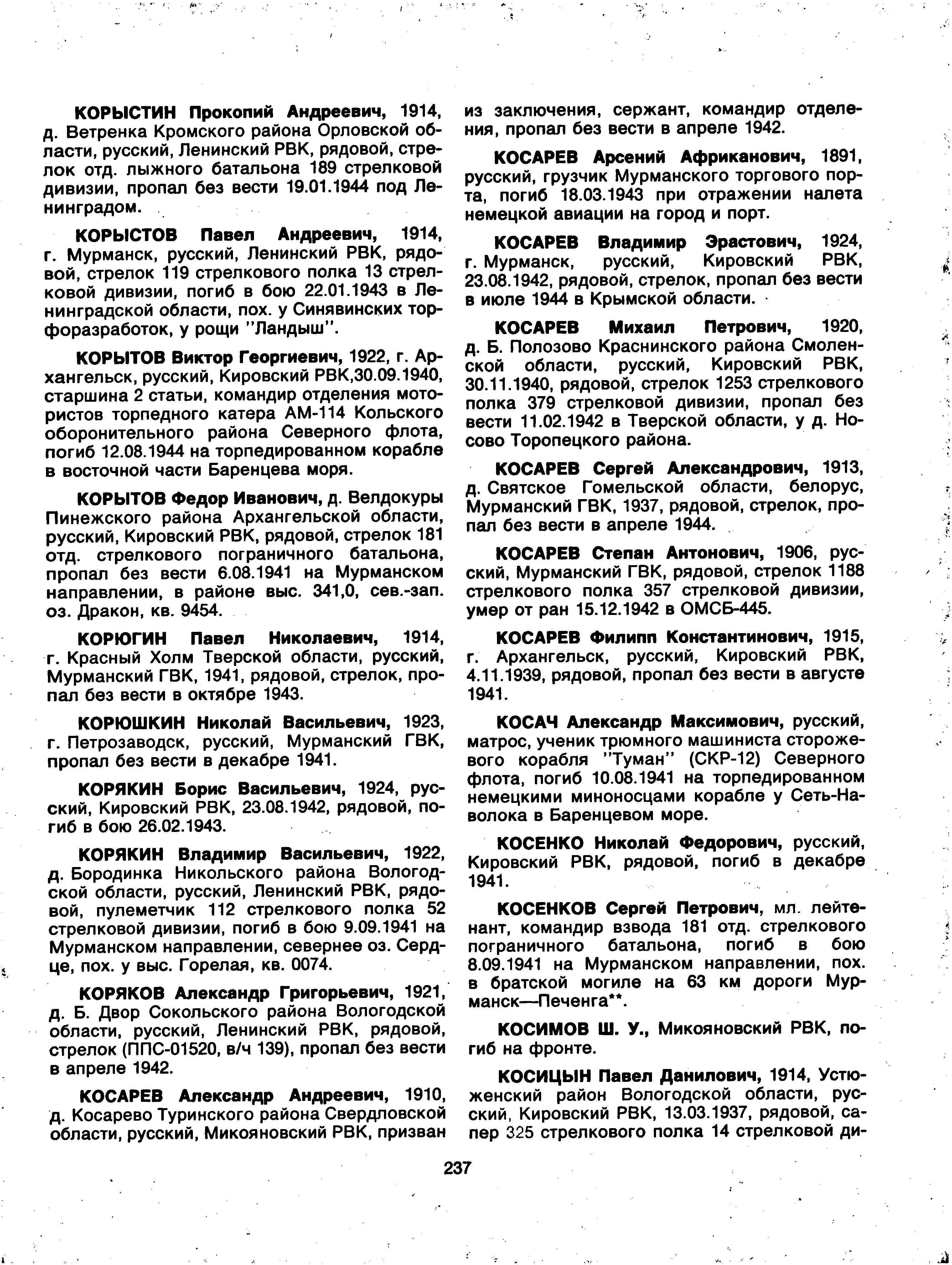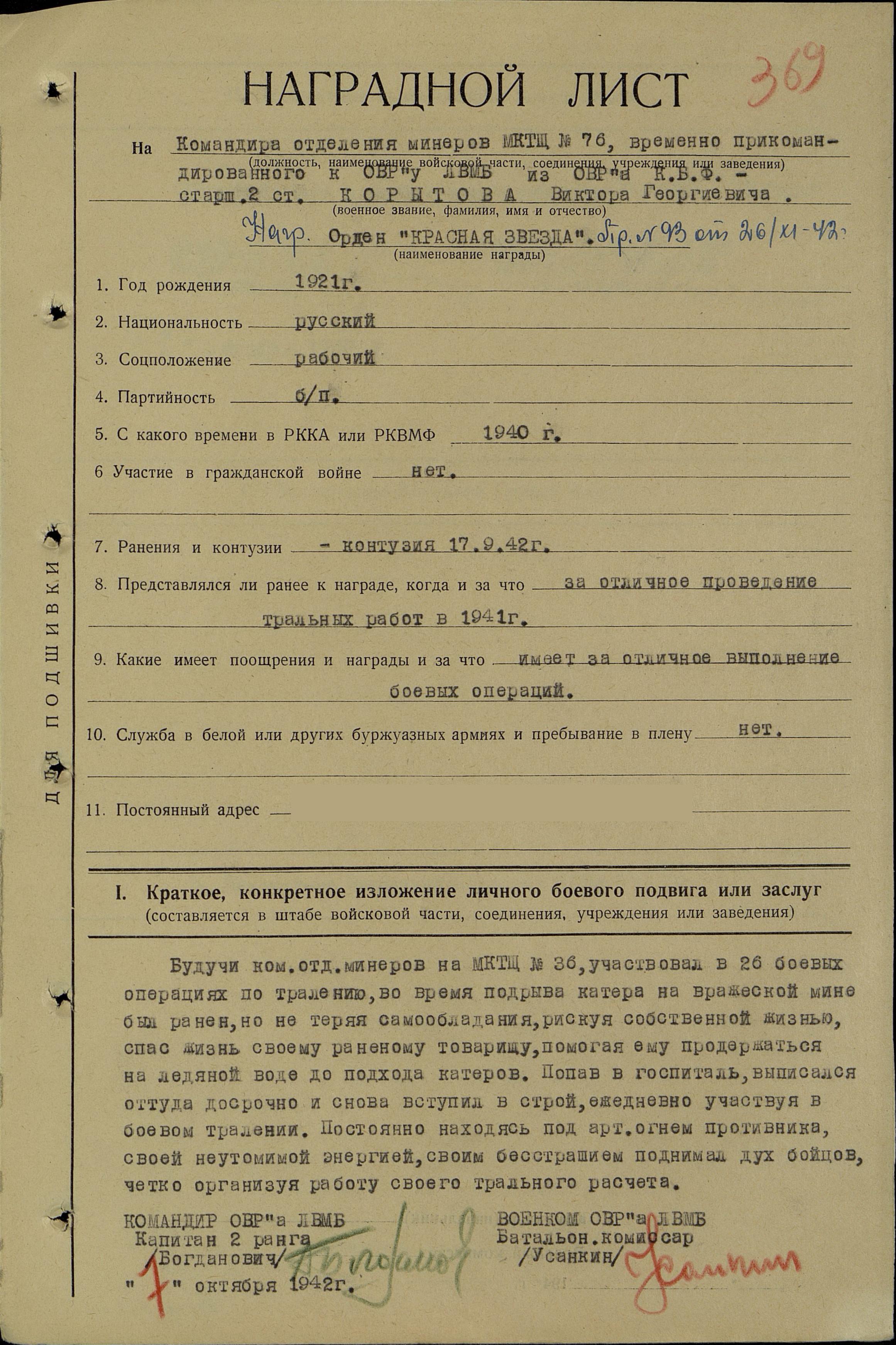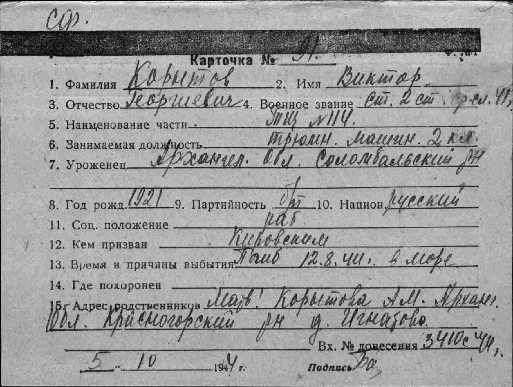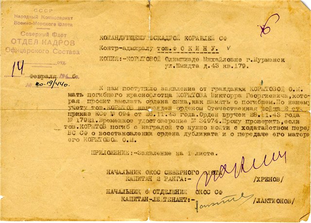 К нам поступило заявление от гражданки Корытовой О.М., матери погибшего краснофлотца Корытова Виктор Георгиевича, которая просит выслать ордена сына, как память о погибшем. По нашему учету тов. Корытов награжден орденом Отечественной войны 2 степени, приказ КСФ № 094 от 26.11.1943 года. Орден вручен 28.11.1943 года № 17921. Временное удостоверение № 34974. Прошу проверить, если тов. Корытов погиб с наградой, то нужно выйти с ходатайством перед ВС СФ о восстановлениии ордена дубликата (точнее, наверное, - "в виде дубликата" или "об изготовлении дубликата ордена" - С.Ш.) и передаче его матери - Корытовой О.М.