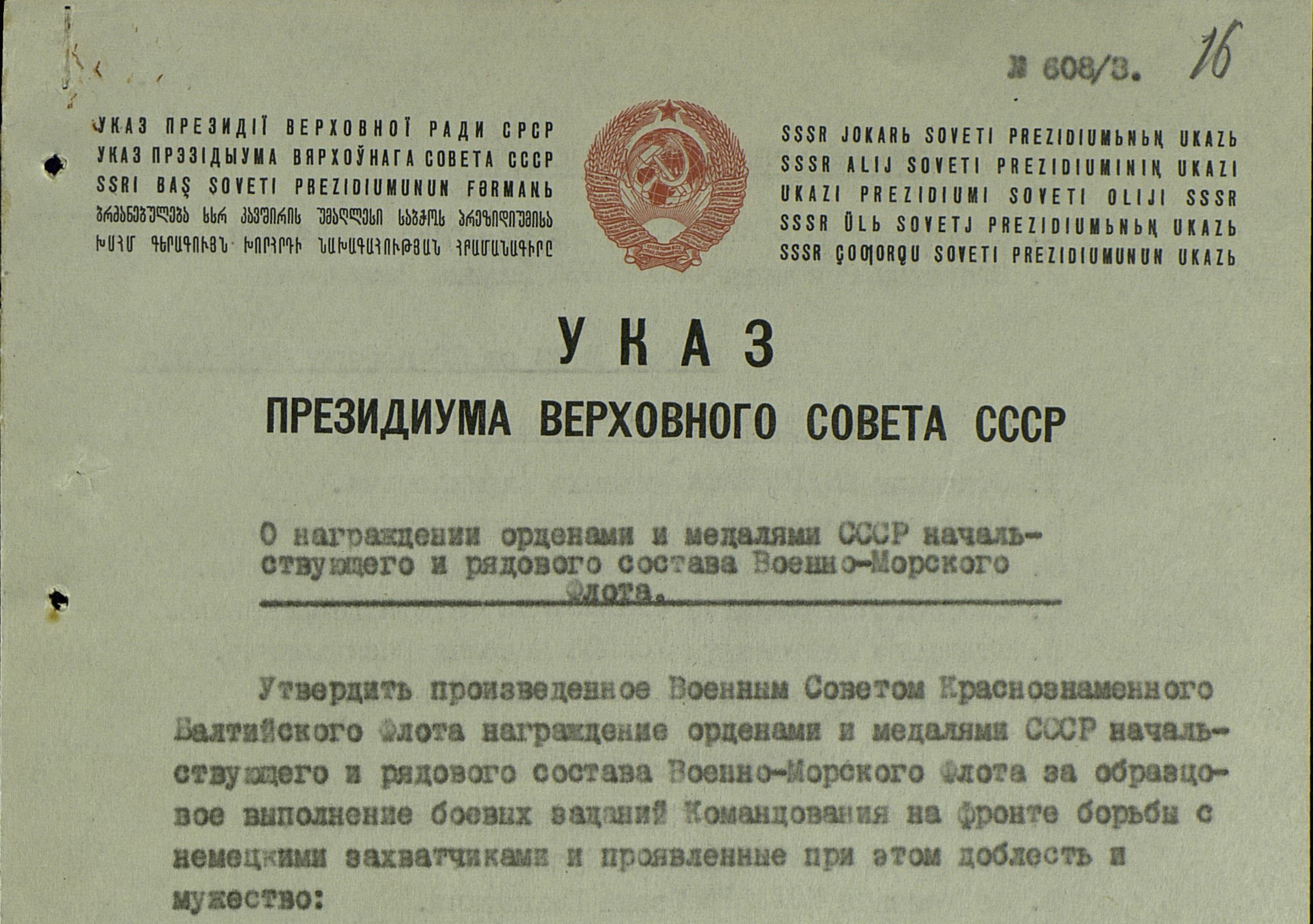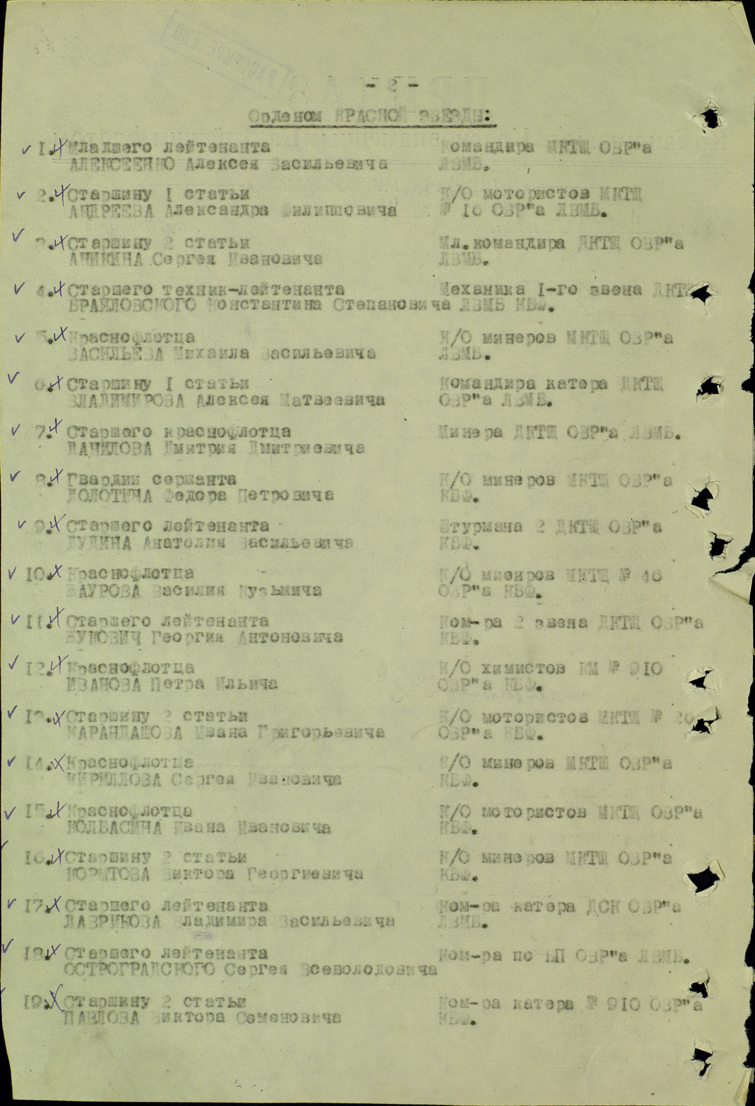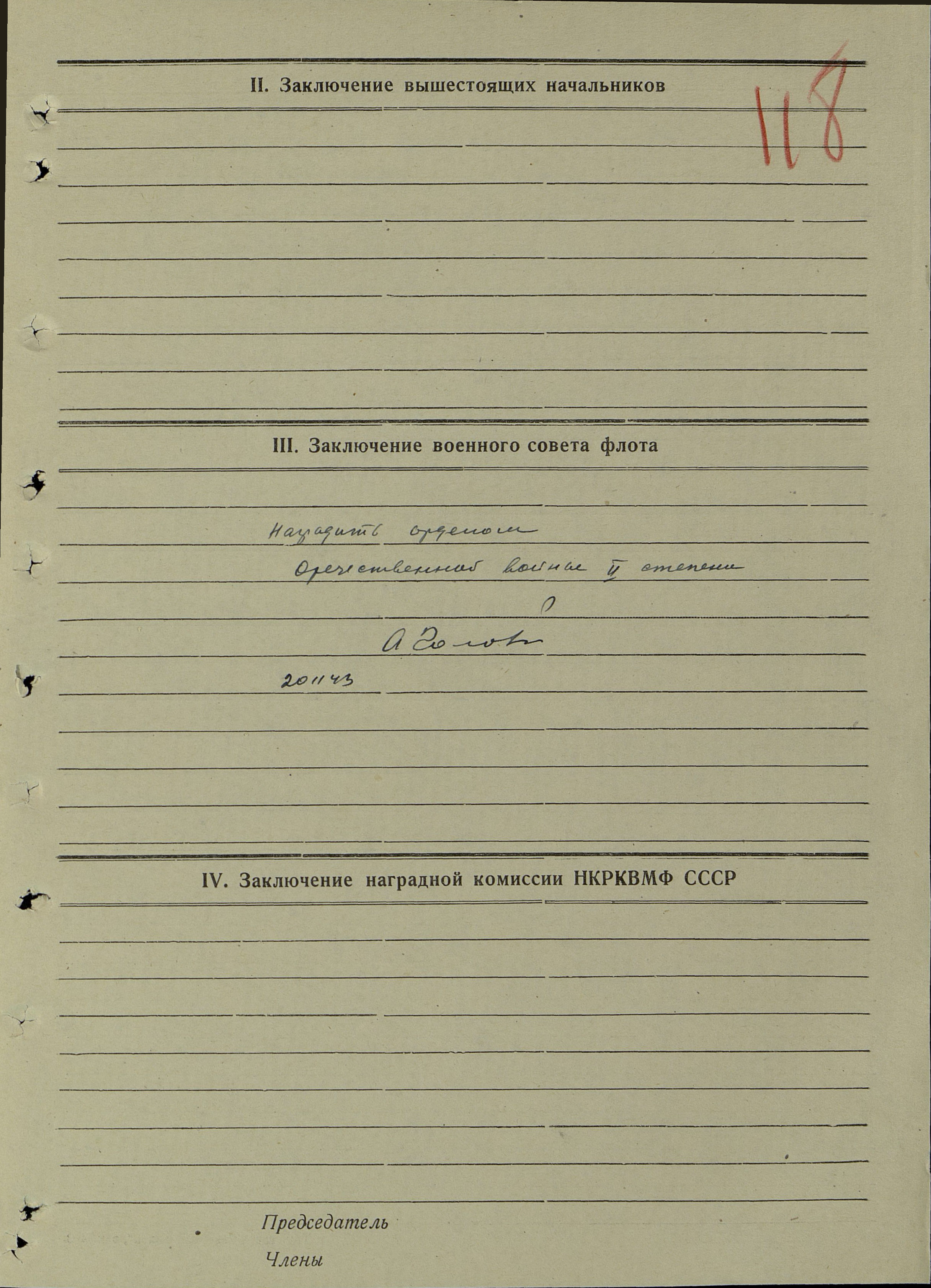 К нам поступило заявление от гражданки Корытовой О.М., матери погибшего краснофлотца Корытова Виктор Георгиевича, которая просит выслать ордена сына, как память о погибшем. По нашему учету тов. Корытов награжден орденом Отечественной войны 2 степени, приказ КСФ № 094 от 26.11.1943 года. Орден вручен 28.11.1943 года № 17921. Временное удостоверение № 34974. Прошу проверить, если тов. Корытов погиб с наградой, то нужно выйти с ходатайством перед ВС СФ о восстановлениии ордена дубликата (точнее, наверное, - "в виде дубликата" или "об изготовлении дубликата ордена" - С.Ш.) и передаче его матери - Корытовой О.М.