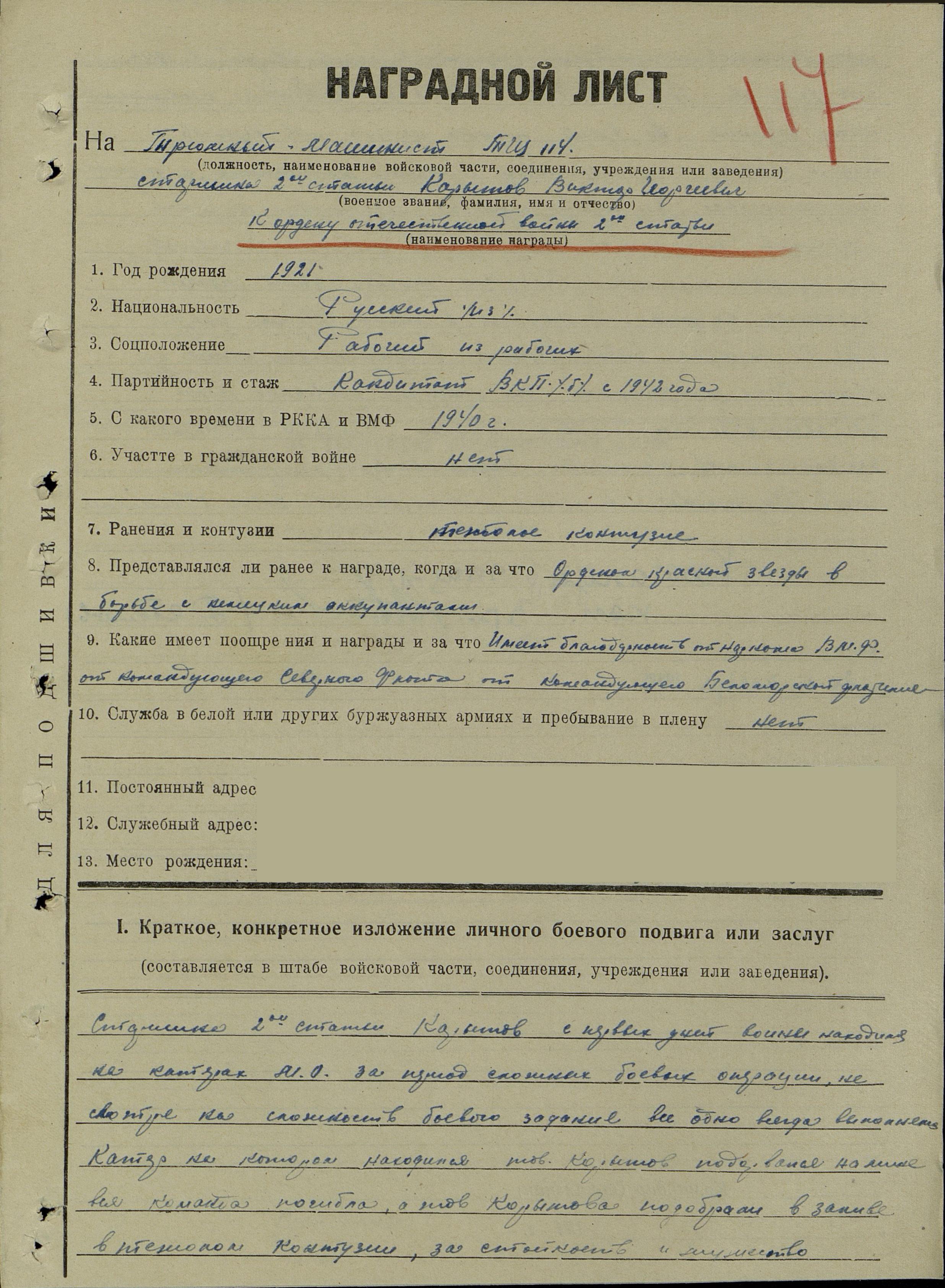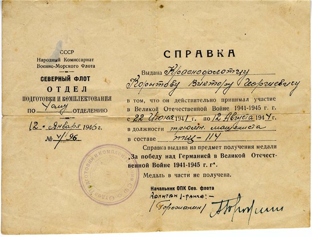 Выдана краснофлотцу Корытову Виктору Георгиевичу в том, что он действительно принимал участие в Великой Отечественной войне 1941-1945 г.г. с 22 июня 1941 г. по 12 августа 1944 г. в должности трюмного машиниста в составе ТЩ-114.