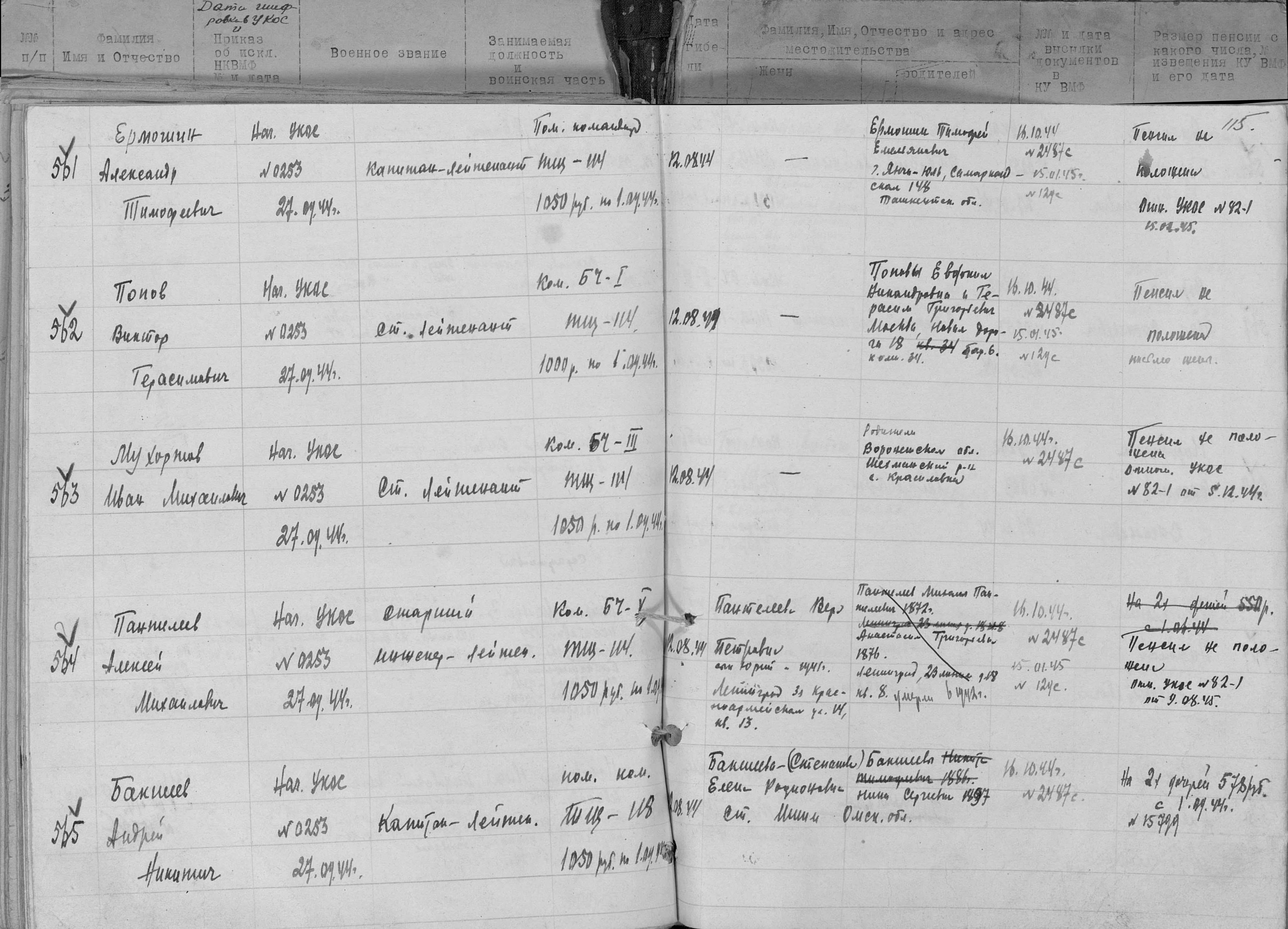 Книга учета безвозвратных потерь начсостава за Отечественную войну Командный отдел СФ (ЦВМА, Ф. 691, О. 1, Д. 4).