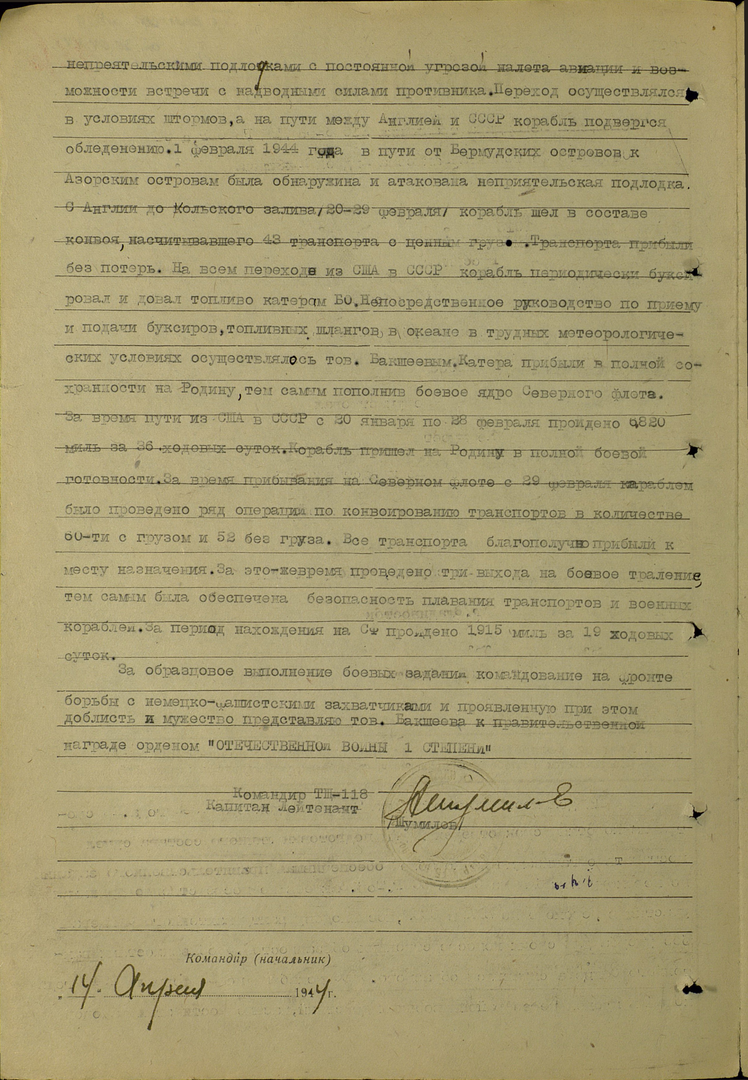 На должности помощника командира ТЩ-118 с декабря 1943 года. Несмотря на короткий срок, отведенный для подготовки личного состава, сумел поставить организацию [работы или несения службы] на корабле, обеспечившую выполнение правительственного задания по переходу корабля из США в СССР. Тов. Бакшеев непосредственно принимал участия в переходе из США в СССР, неся ходовые вахты вахтенного офицера без ущерба для своих непосредственных обязанностей. С обязанностями вахтенного офицера справился образцово. С 20 декабря по 28 февраля 1944 г. корабль прошел через районы военных действий при насыщенности этих районов неприятельскими подлодками, с постоянной угрозой налета авиации, возможности встречи с надводными силами противника. Переход осуществлялся в условиях штормов, а на пути между Англией и СССР корабль подвергся обледенению. 1 февраля 1944 г. в пути от Бермудских островов к Азорским островам была обнаружена и атакована неприятельская подлодка. Из Англии до Кольского залива (20-29 февраля) корабль шел в составе конвоя, насчитывавшего 43 транспорта с ценным грузом. Транспорты прибыли без потерь. На всем переходе из США в СССР корабль периодически буксировал и давал топливо катером БО. Непосредственное руководство по приему и подачи буксиров, топливных шлангов в океане в трудных метеорологических условиях осуществлялось тов. Бакшеевым. Катера прибыли в полной сохранности на Родину, тем самым пополнив боевое ядро Северного флота. За время пути из США в СССР с 20 января по 28 февраля пройдено 6820 миль за 36 ходовых суток. Корабль пришел на Родину в полной боевой готовности. За время пребывания на СФ, с 29 февраля кораблем было проведено ряд операций по конвоированию 60 транспортов с грузами и 52 – без груза. Все транспорты благополучно прибыли к месту назначения. За это же время проведено три выхода на боевое траление, тем самым была обеспечена безопасность плавания транспортов и военных кораблей. За период нахождения на СФ пройдено 1915 миль за 19 ходовых суток.
