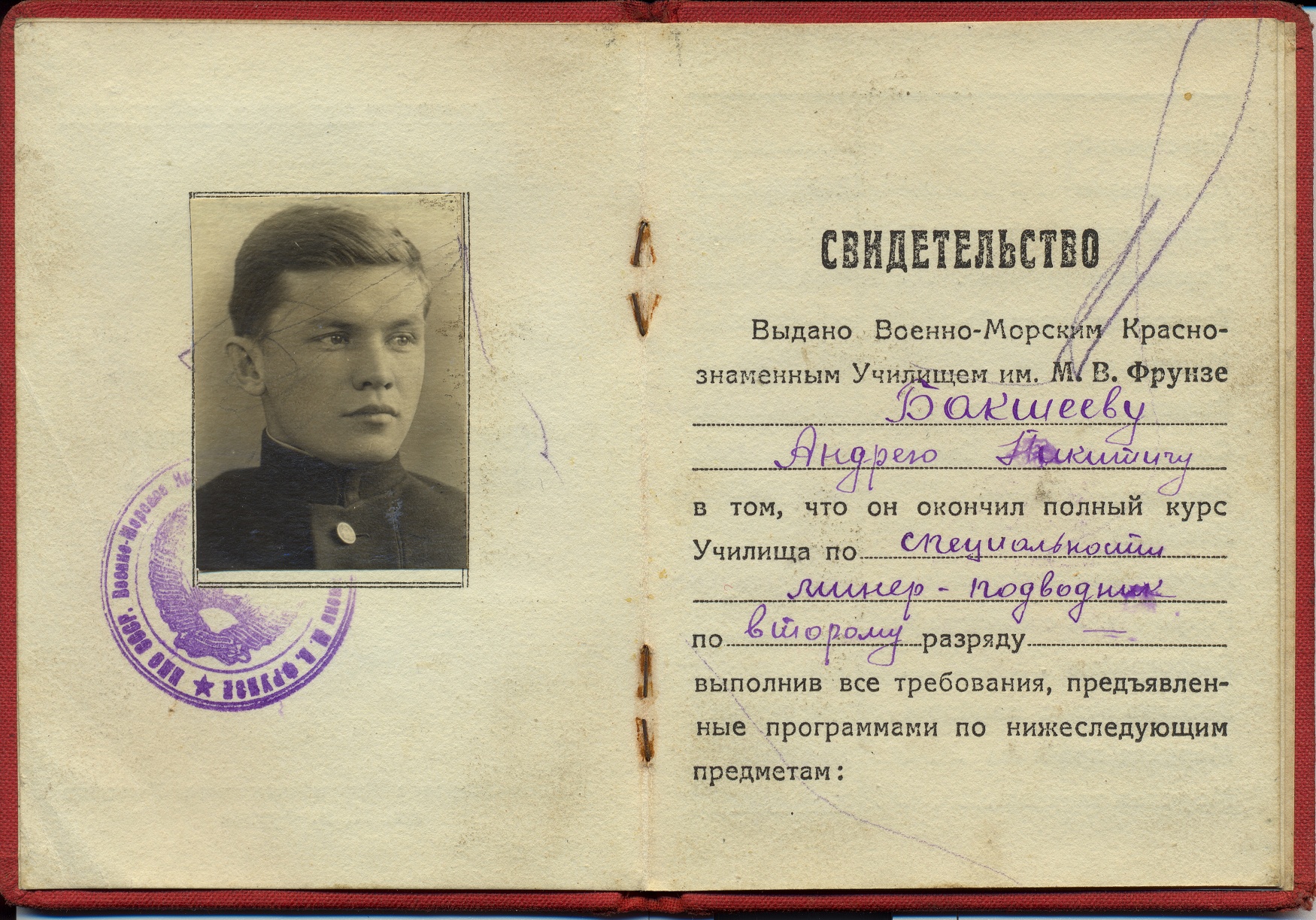 Елена Родионовна вернулась домой чуть раньше. Не окончив до конца курс из-за травмы, приехала на родину и устроилась учительницей в начальную школу № 34 на станции Ишим. Она стояла на углу улиц Школьной и Карла Маркса; теперь память об этом здании сохранилась только в городской топонимике. Андрей Никитич учился на минёра-подводника. В свидетельстве об окончании, выданном 17 июня 1938 года – разные оценки: от «посредственно» до «отлично». Особенно удачно давались будущему морскому офицеру такие предметы как «торпедное оружие», «средства наблюдения и связи», «устройство подводной лодки». По «истории ВКП(б)» – «хорошо». Из анкетных данных мы знаем, что впоследствии он вступил в ряды партии большевиков. Последняя запись в свидетельстве – приказом наркомвоенмора № 542 А.Н.Бакшееву присвоено звание лейтенанта.