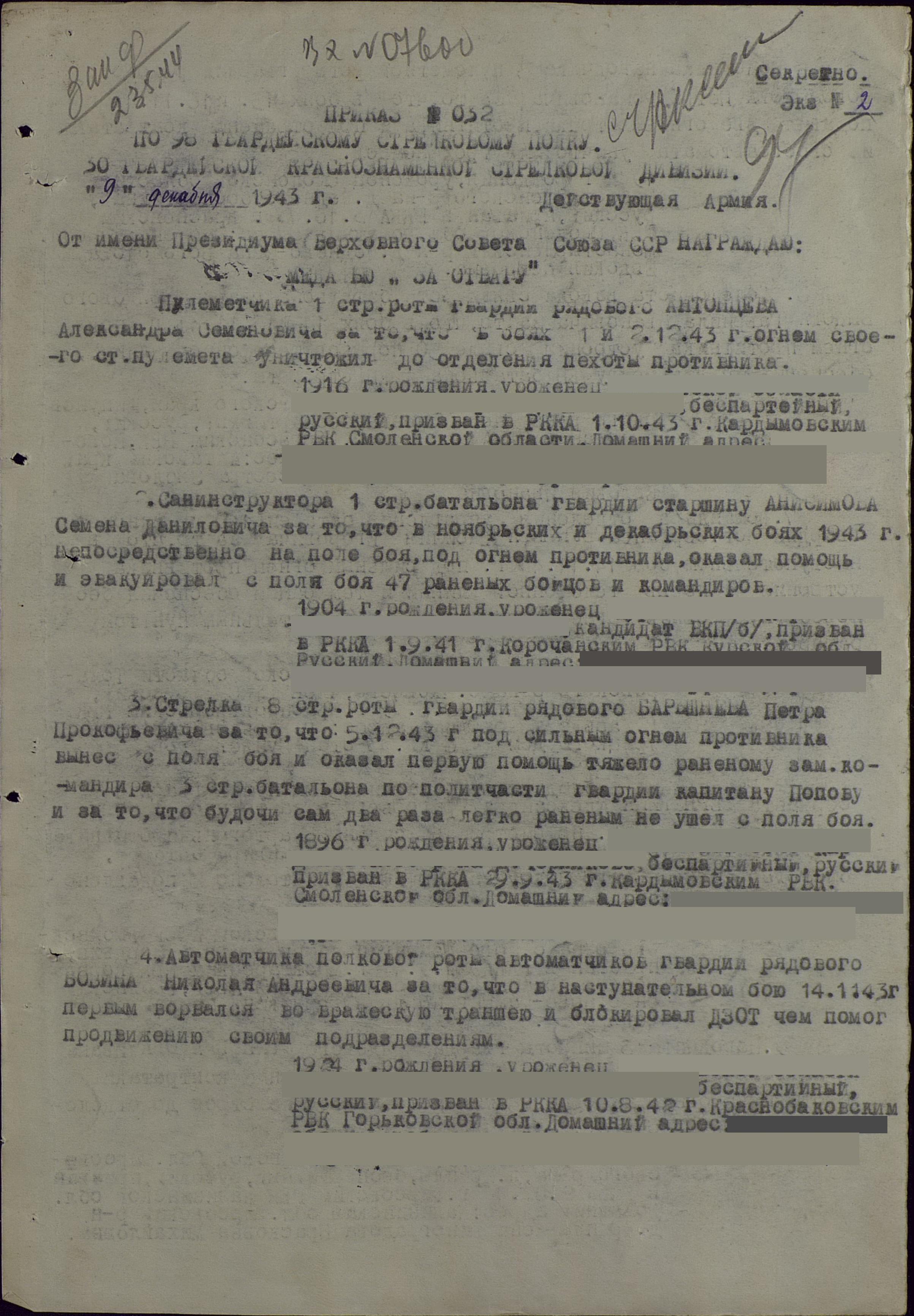 гвардии рядовой); военно-учетная специальность – ВУС № 134; место службы – 391 ЗСП 29 ЗСД, в/ч 12205 (г. Вологда), по распоряжению Главупраформа Красной Армии (наряд № М/4/8388) из числа военнообязанных нестроевиков в/ч 12205 был направлен для работы в арктические предприятия ГУСМП; год рождения – 1896; место рождения – Смоленская обл., Кардымовский (Кардынский) р-н, Залесовский с/с, д. Черниково; партийность – б/п; национальность –