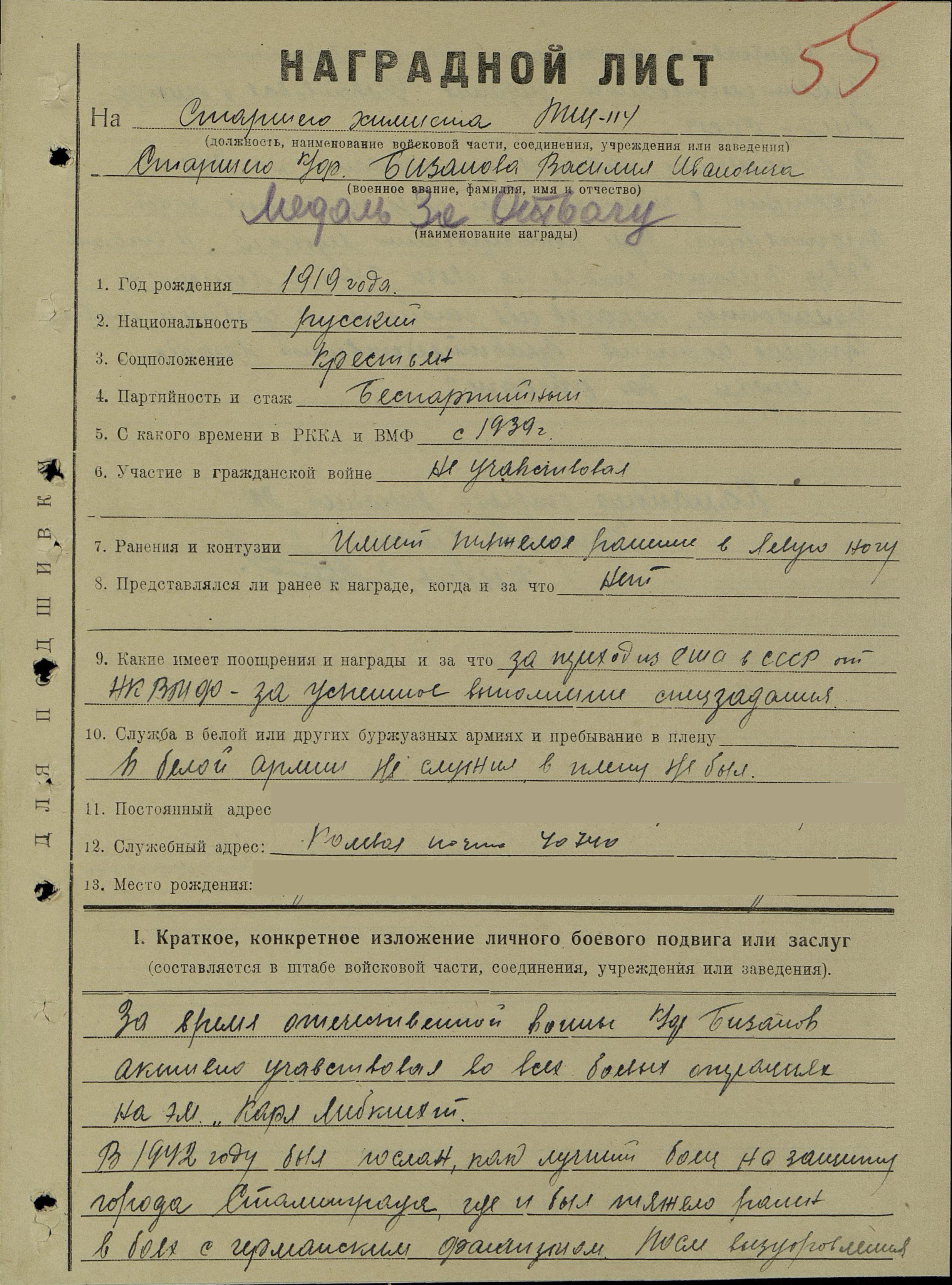 Наградной лист.