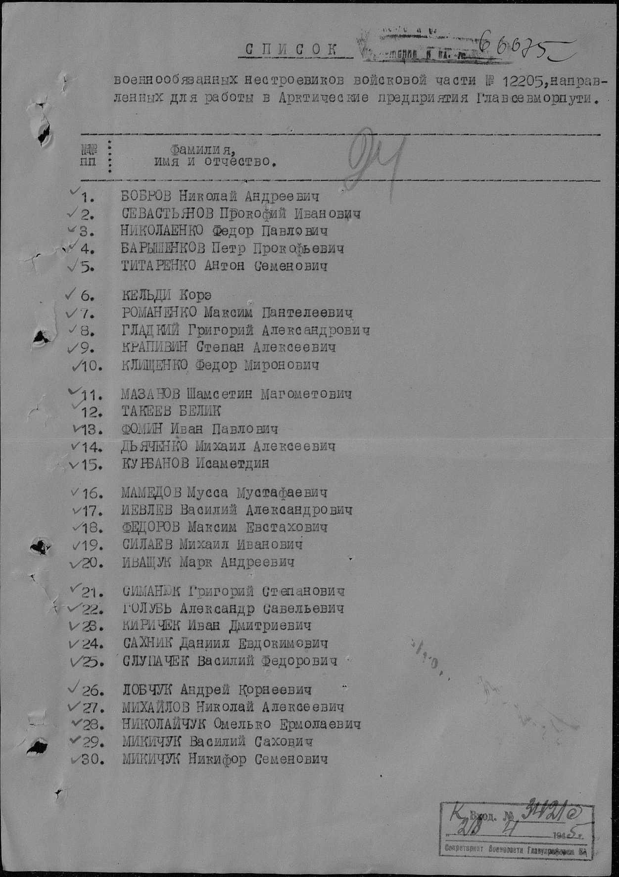 Донесение о безвозвратных потерях 66675 от 30.04.1945 (ЦАМО, Ф. 58, О. 18003, Д. 604).
