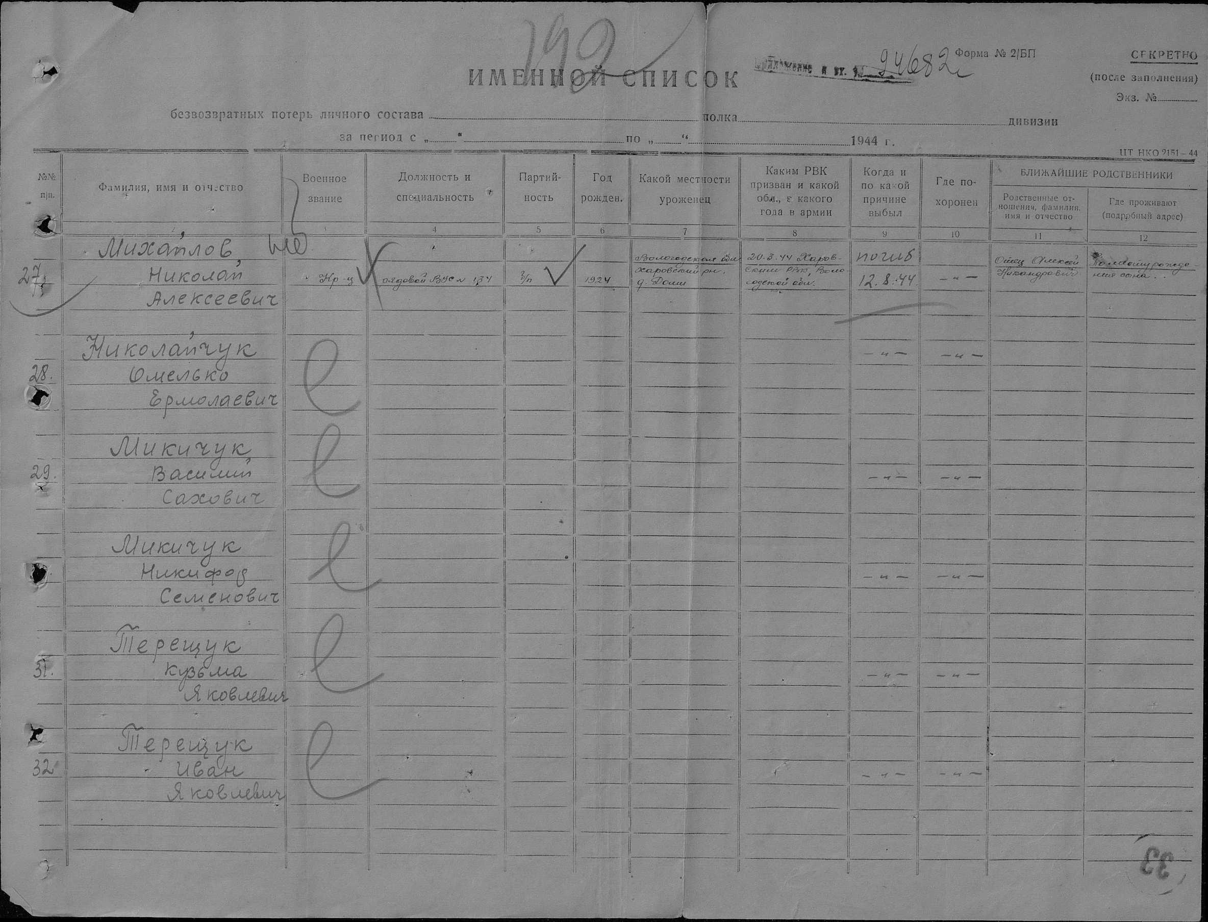 Донесение о безвозвратных потерях 94682 от 14.06.1945 (ЦАМО, Ф. 58, О. 18003, Д. 803).