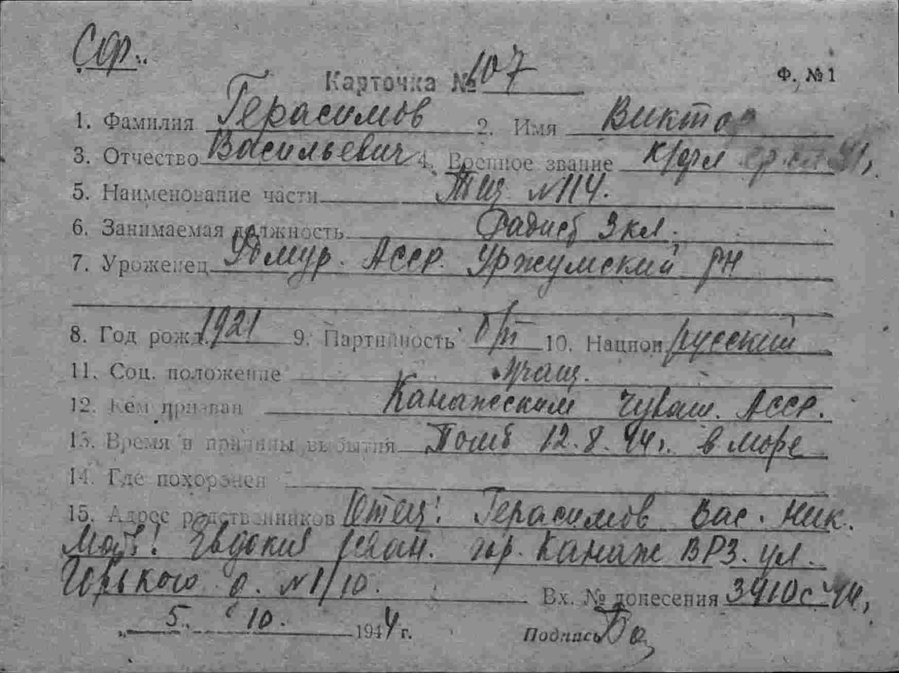 Герасимов Виктор Васильевич, воинское звание – краснофлотец; должность (специальность), часть – радист 3 кл. (радиотелеграфист), тральщик ТЩ-114 6 ДТЩ Бригада траления ОВР ГБ СФ; год рождения – 1921; место рождения – Удмуртская АССР, Уржумский р-н; партийность – б/п; социальное положение – учащийся из крестьян; национальность – русский; срок срочной службы – 1940 (1941) г.; каким РВК призван – Канашским (Канажским) РВК Чувашской АССР; награды – орден Красной Звезды; по какой причине, где и когда выбыл – погиб в море при выполнении боевого задания 12.08.1944 г.; семейное положение – холост; родственники (ФИО, адрес) – отец, Герасимов Василий Николаевич, мать, Герасимова Евдокия Ивановна, г. Канаш (Канаж) ВРЗ, ул. Горького, д. 1/15 (1/10); дополнительная информация – имел одно ранение и одну контузию, служил во 2 морской бригаде, участвовал в боях за город Кингисепп, за станцию Котлы и за станцию Копорье, в последнем был тяжело ранен, после излечения был на переправе в Невской дубровке в особом отрядов моряков, где был контужен, после излечения находился в лыжно-буерном отряде, защищал подступы к городу Ленина, затем участвовал в операциях на катерных тральщиках по очищению Финского залива. Участник выполнения правительственного задания по переводу корабля из США в СССР, участник потопления двух ПЛ противника.