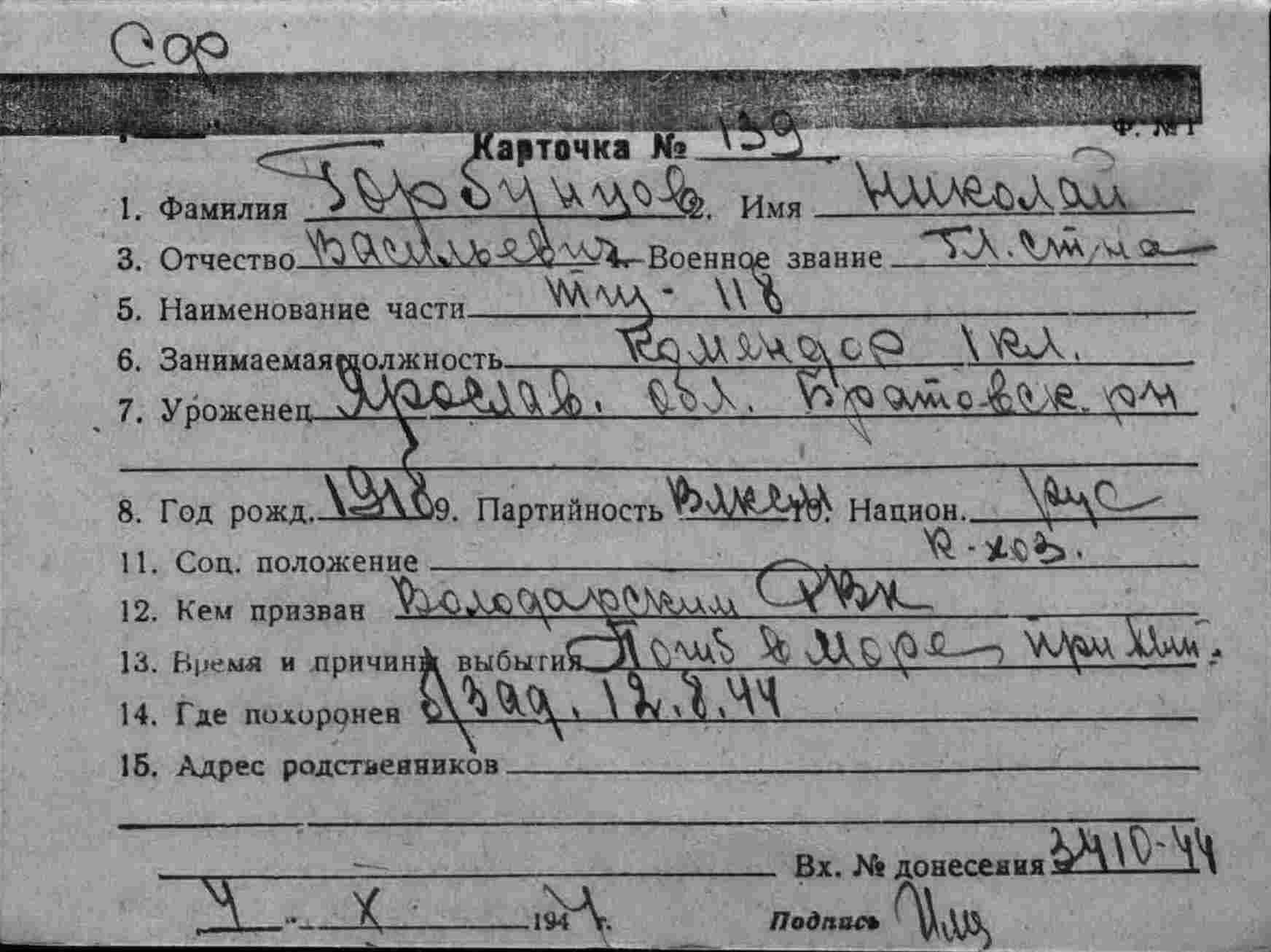 Донесение о безвозвратных потерях 3410 от 03.10.1944 (ЦВМА, Ф. 864, О. 1, Д. 1358).
