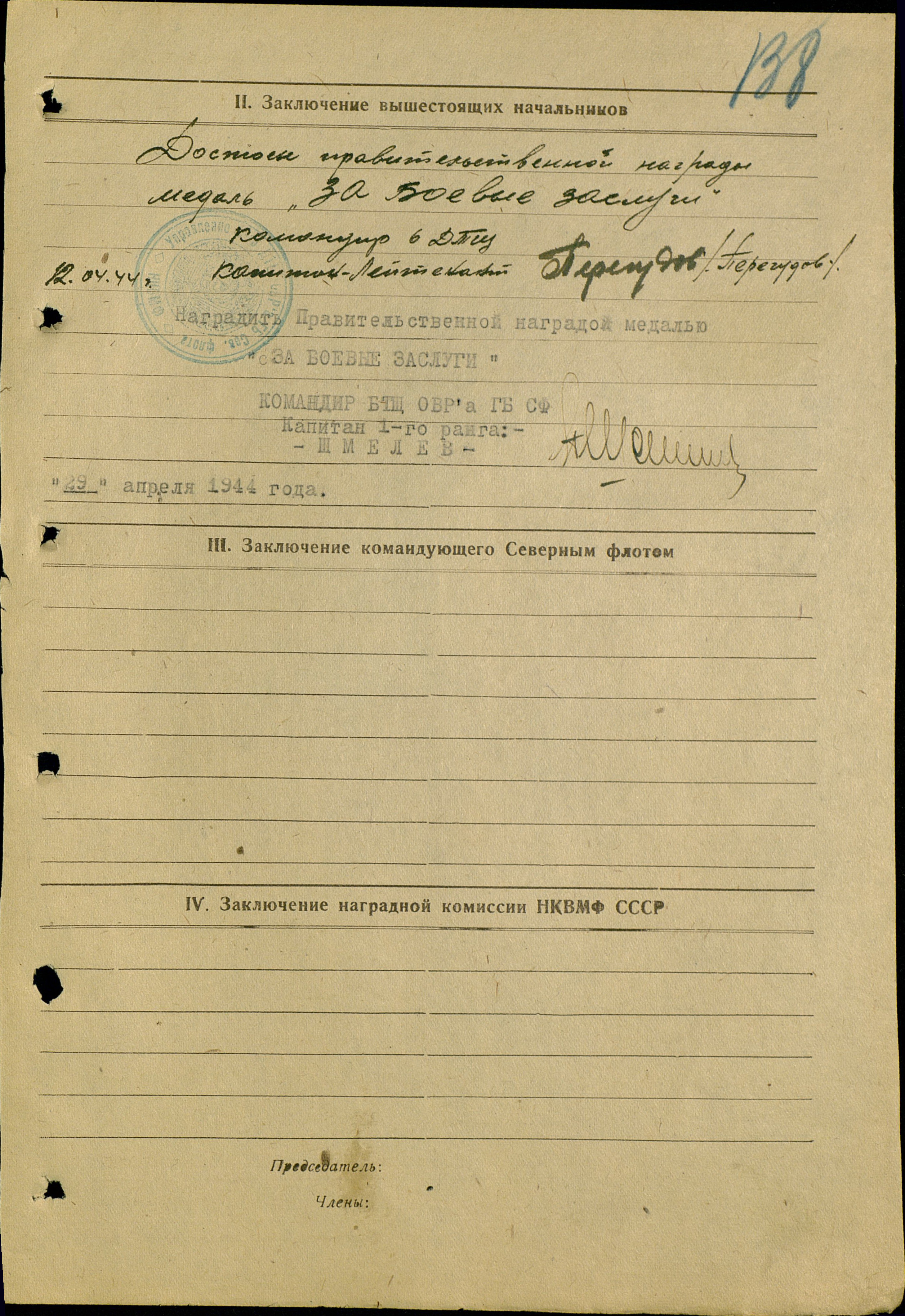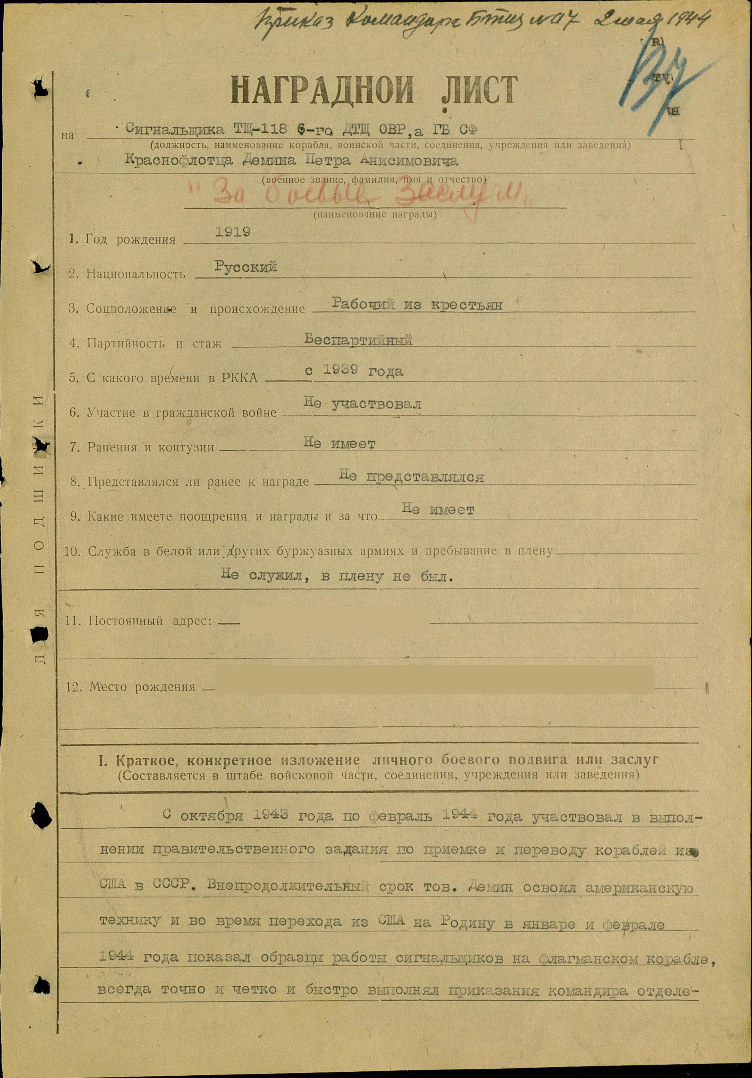 Наградной лист.