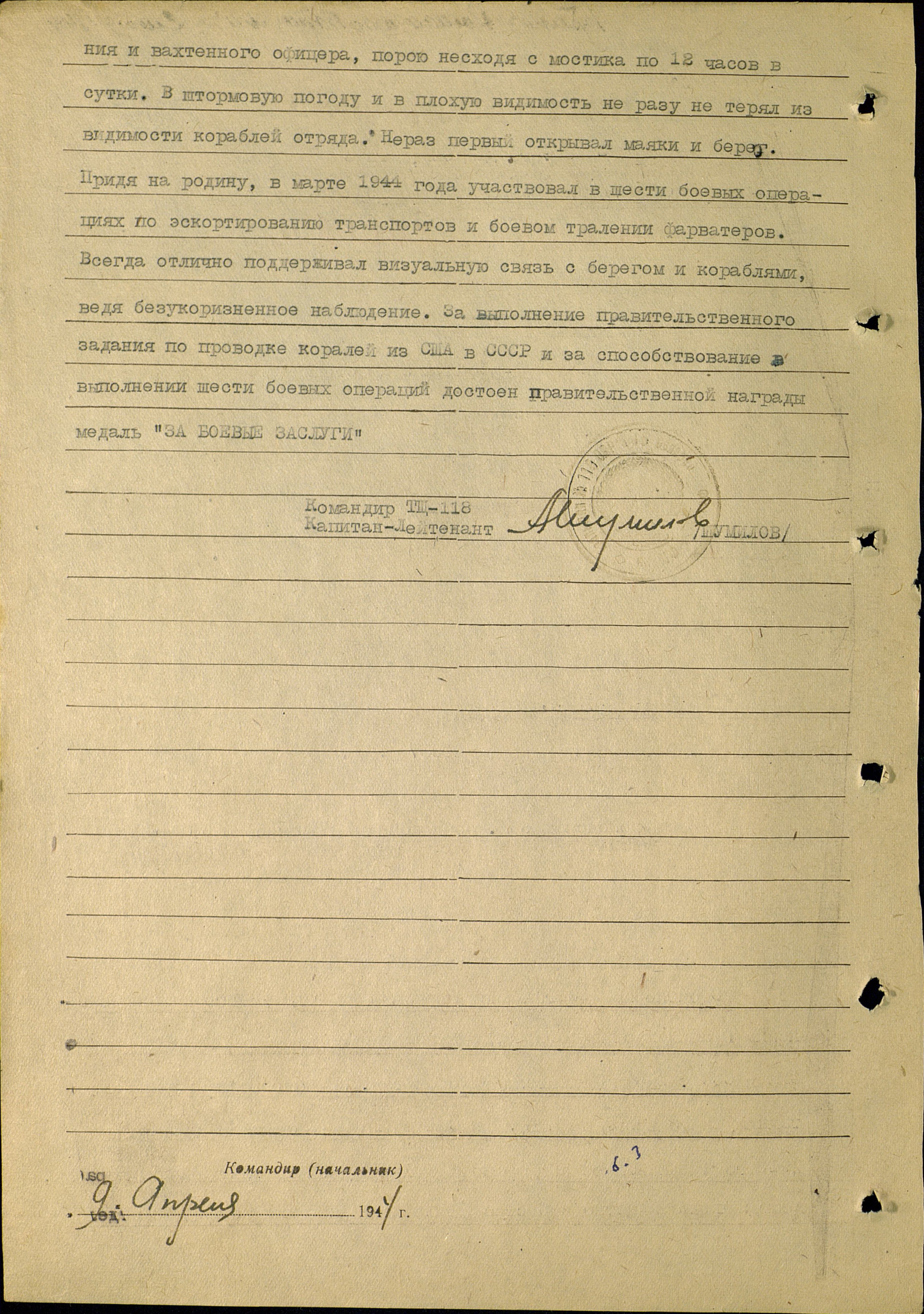 За выполнение правительственного задания по проводке кораблей из США в СССР и за способствование в выполнении шести боевых операций достоин правительственной награды «За боевые заслуги».