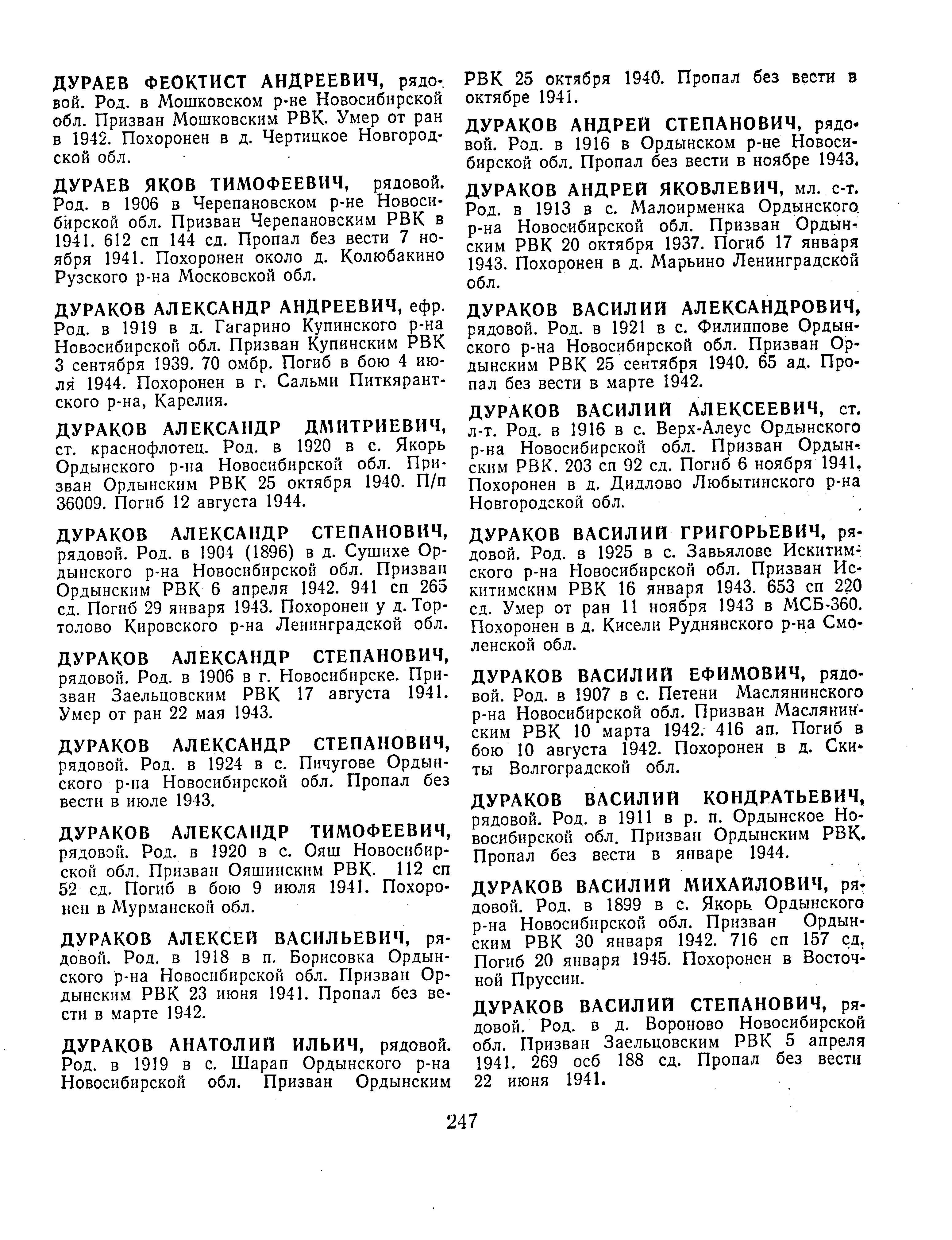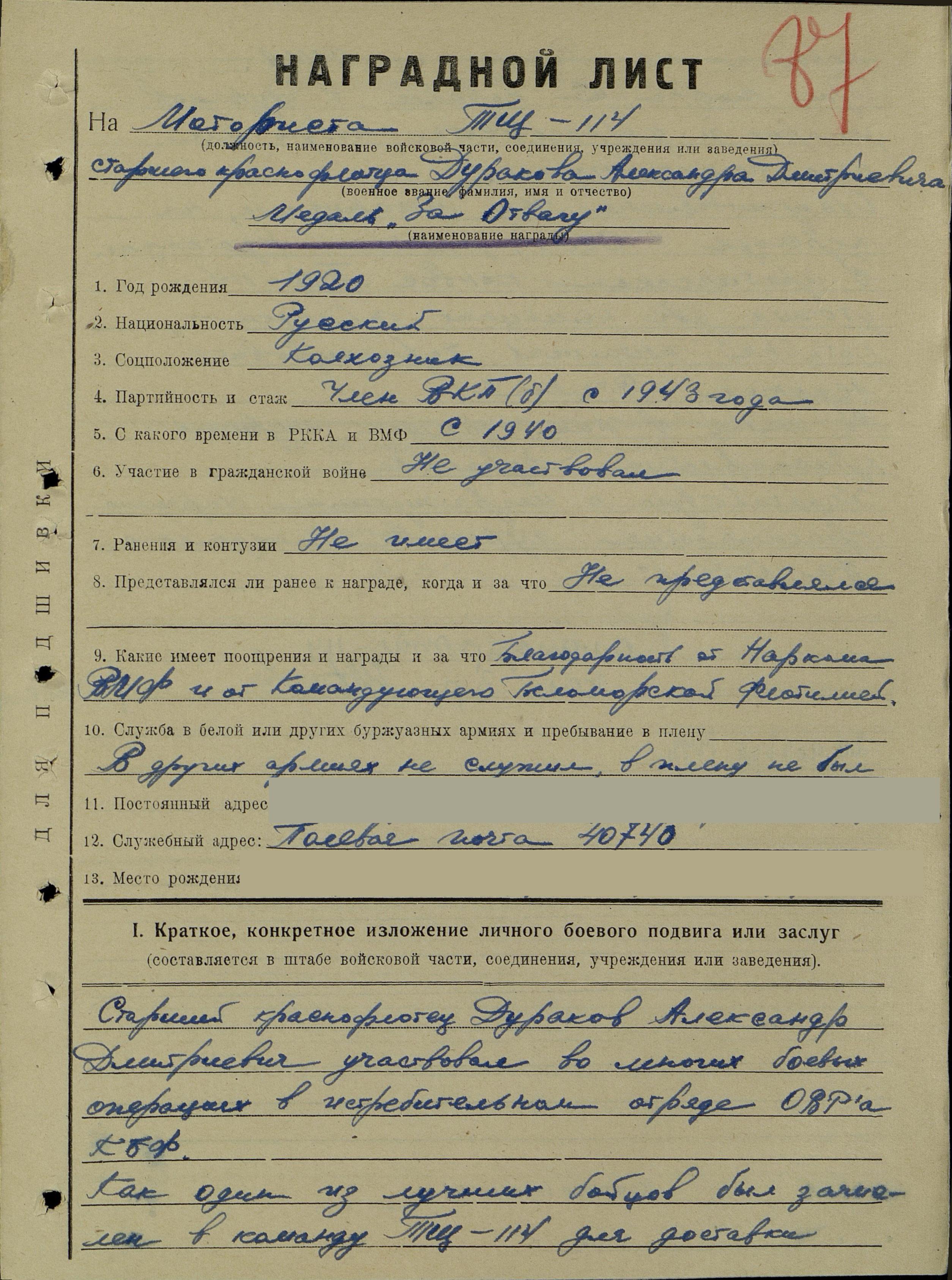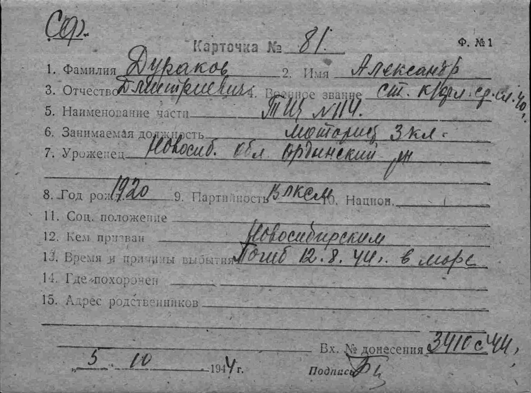 Дураков Александр Дмитриевич, воинское звание – ст. краснофлотец; должность (специальность), часть – моторист 3 кл., тральщик ТЩ-114 6 ДТЩ Бригада траления ОВР ГБ СФ (п/п 36009); год рождения – 1920 г.; место рождения – Новосибирская обл., Ордынский р-н (с. Якорь); партийность –
