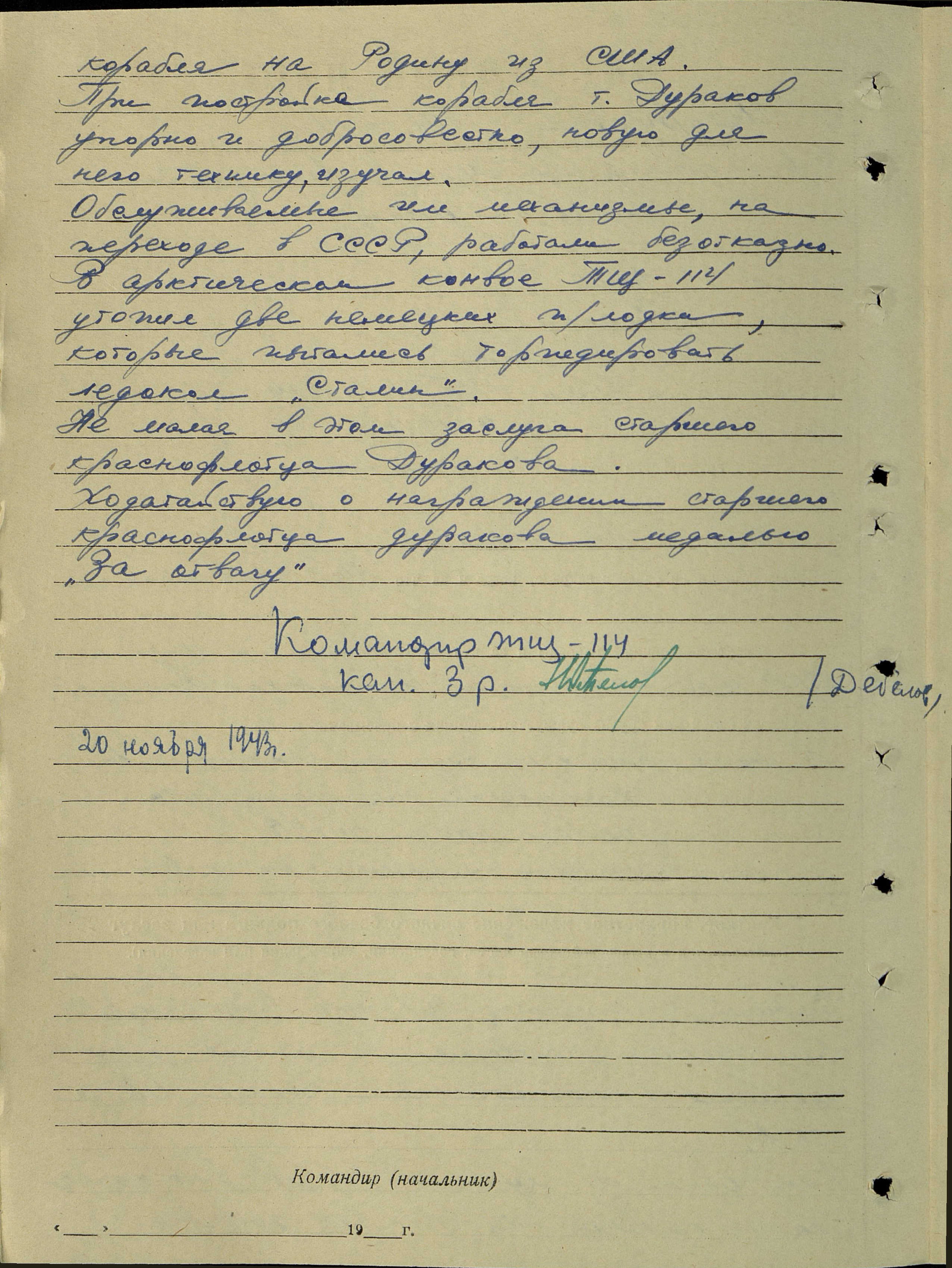 Не малая в этом заслуга старшего краснофлотца Дуракова. Ходатайствую о награждении старшего краснофлотца Дуракова медалью «За отвагу».