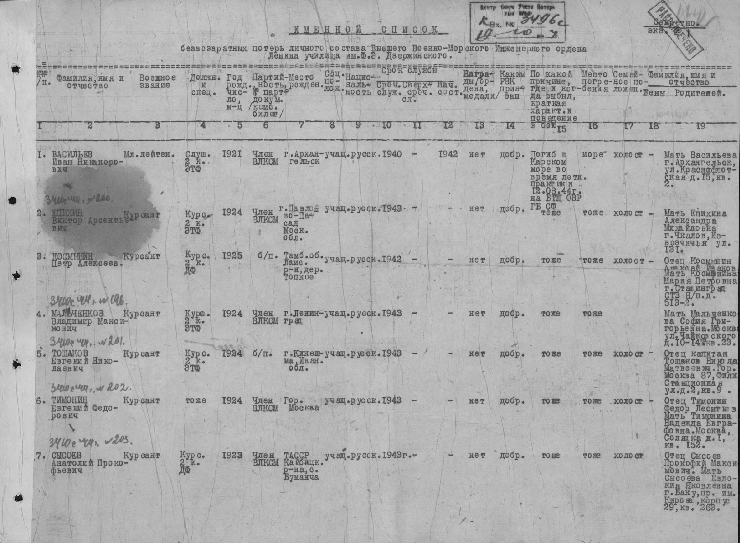 Донесение о безвозвратных потерях 3496 от 19.10.1944 (ЦВМА, Ф. 864, О. 1, Д. 1341).