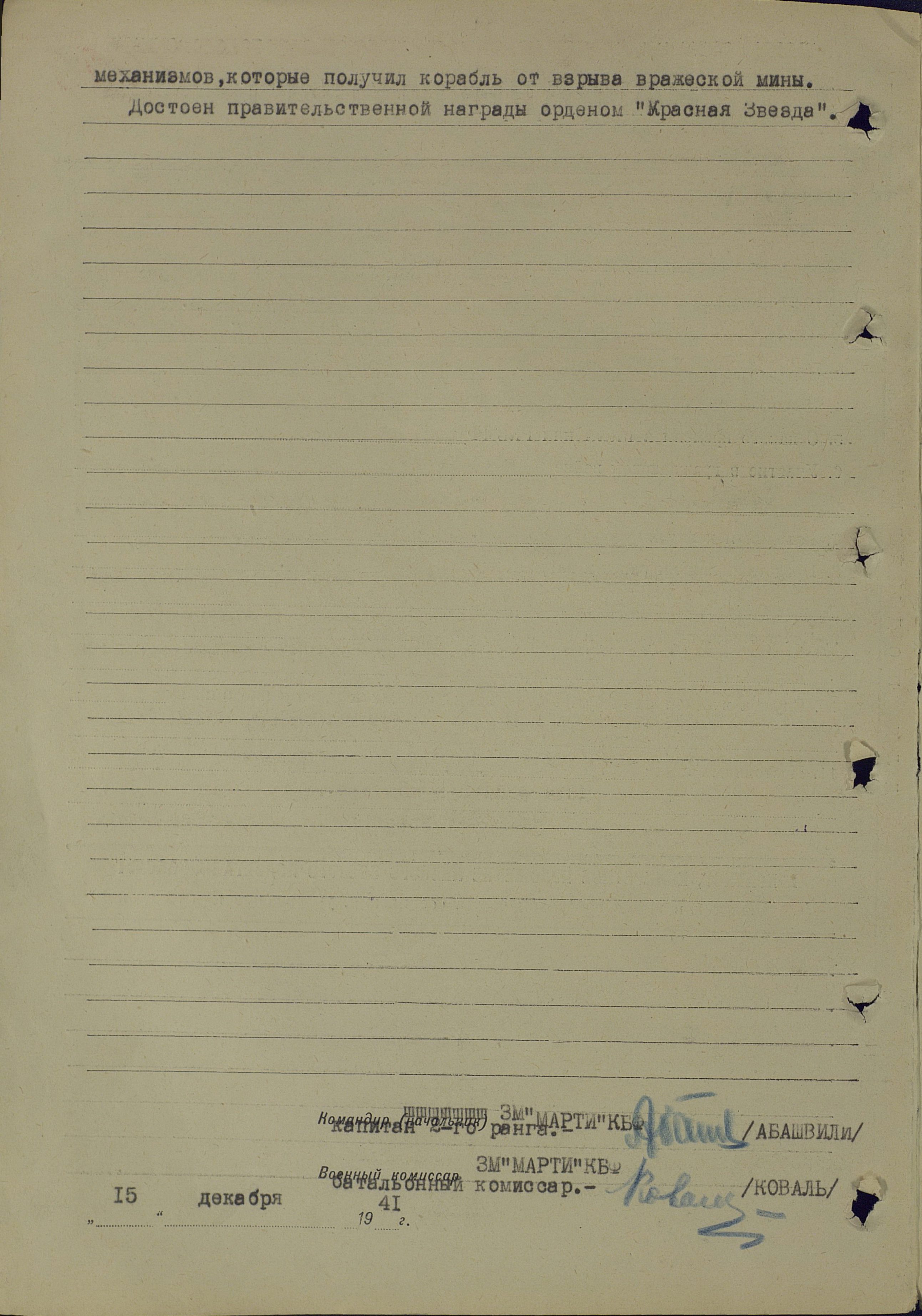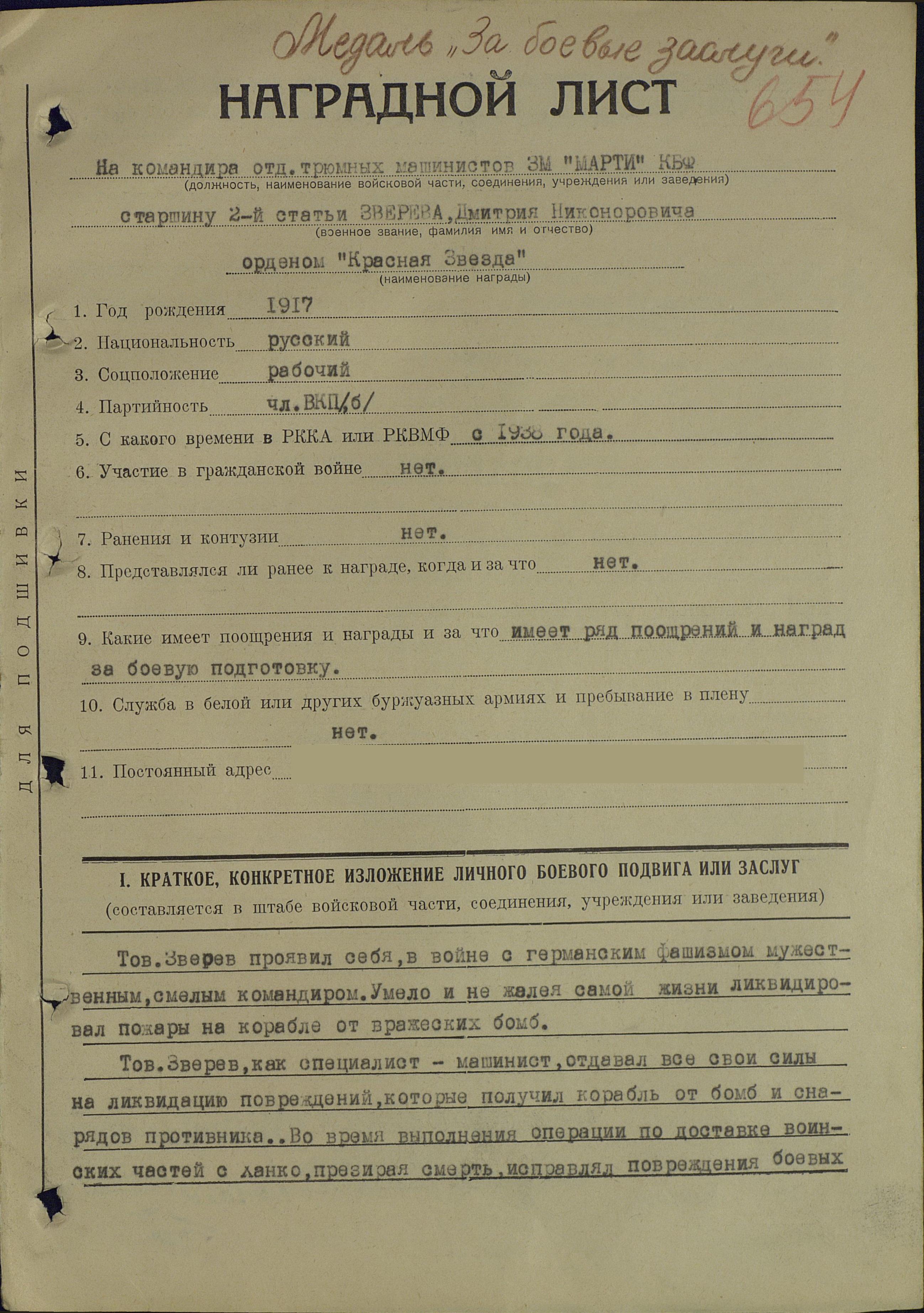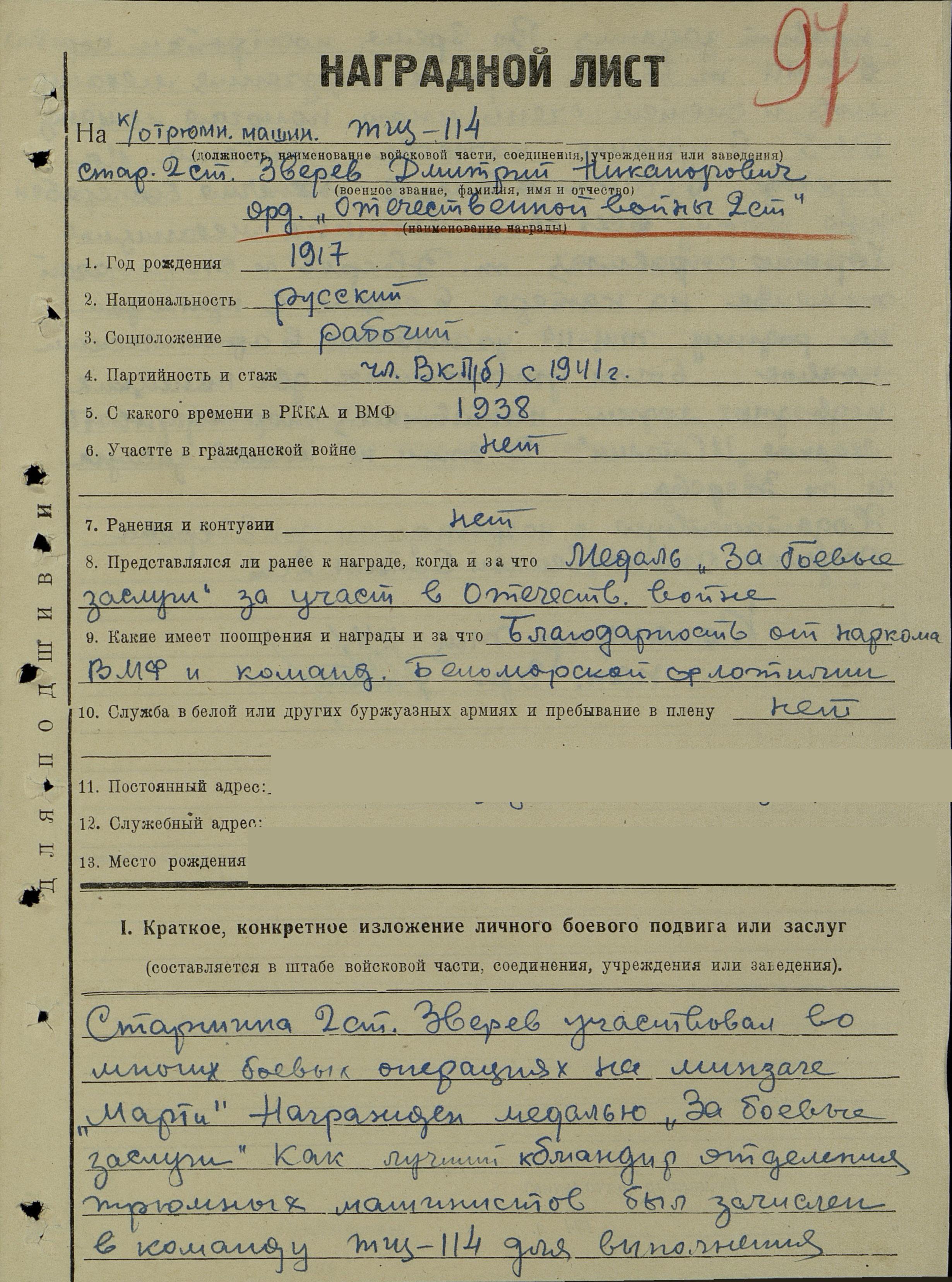 Тов. Зверев как специалист-машинист отдавал все свои силы на ликвидацию повреждений, которые получил корабль от бомб и снарядов противника. Во время выполнения операции по доставке воинских частей с Ханко, презирая смерть, исправлял повреждения боевых механизмов, которые получил корабль от взрыва вражеской мины.