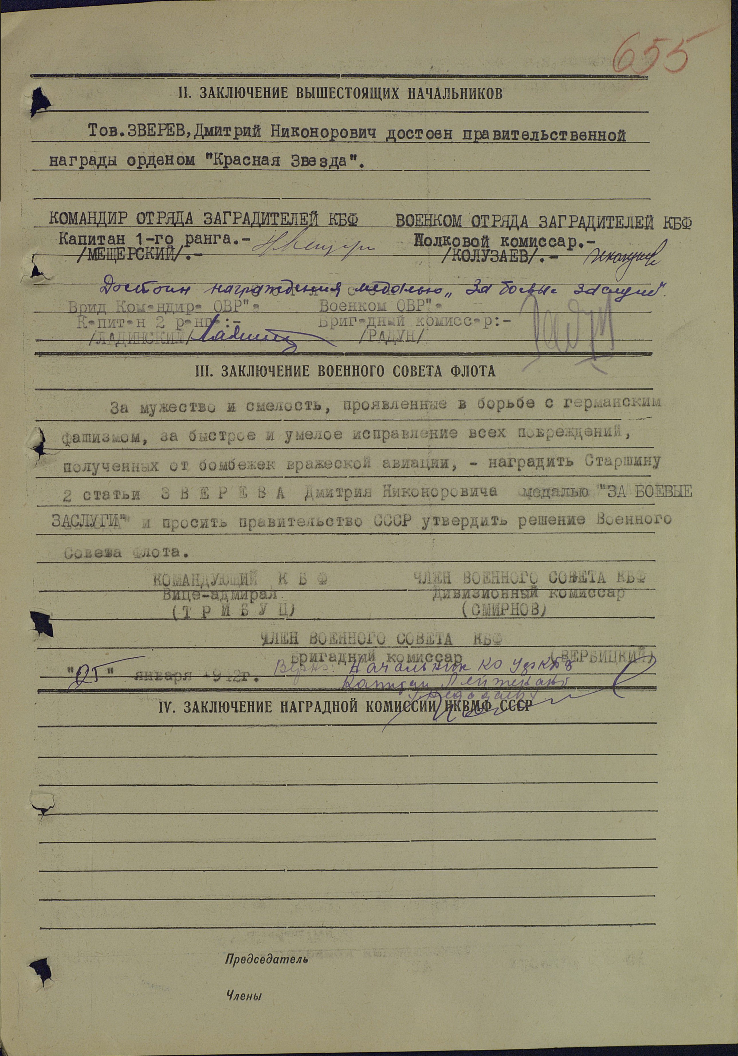 Тов. Зверев проявил себя в войне с германским фашизмом мужественным, смелым командиром. Умело, и не жалея самой жизни, ликвидировал пожары на корабле от вражеских бомб.