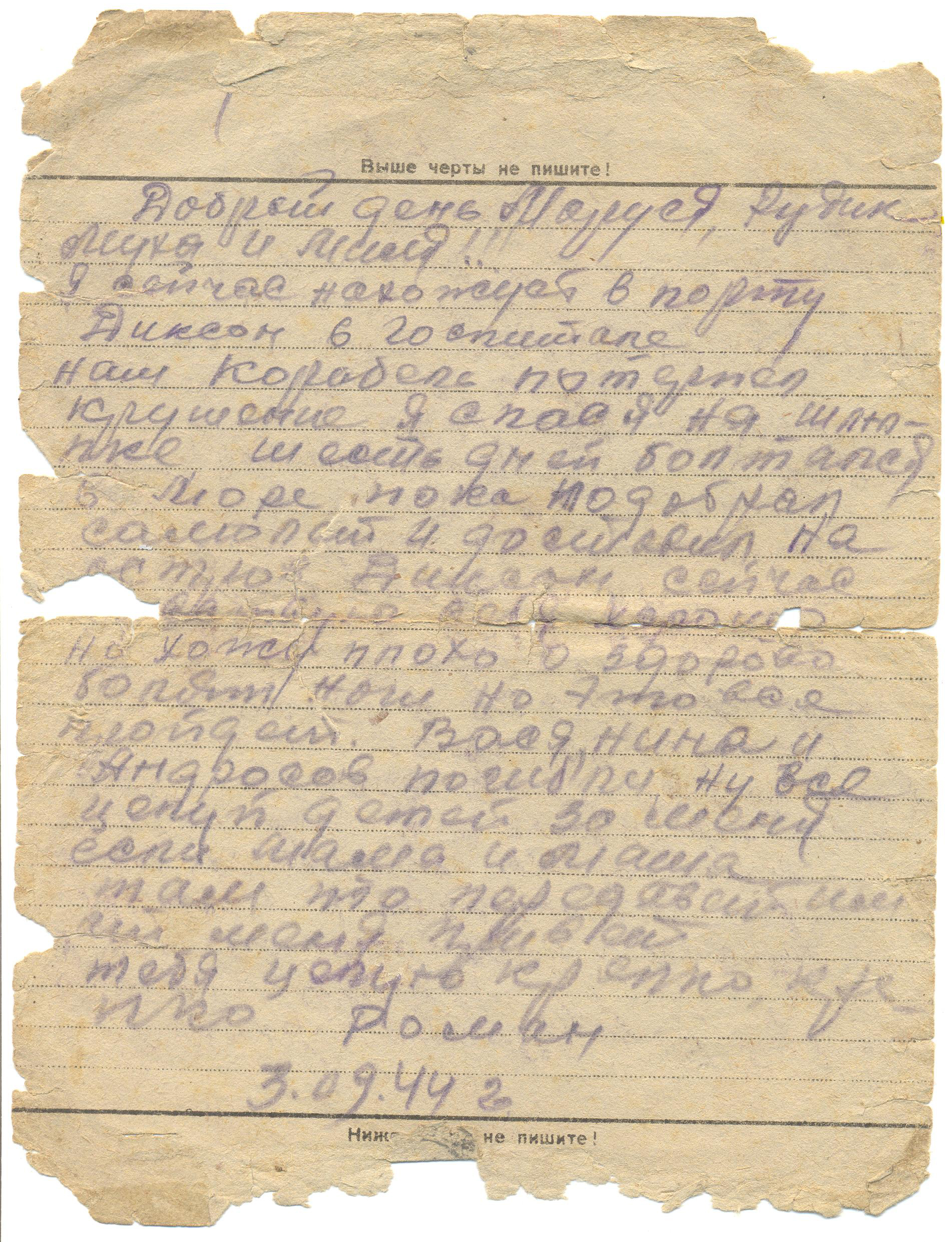 Я сейчас нахожусь в порту Диксон в госпитале. Наш корабль потерпел крушение. Я спасся на шлюпке, шесть дней болтался в море, пока не подобрал самолет и доставил нас на остров Диксон. Сейчас ... себя хорошо, но хожу плохо и здорово болят ноги. Но это все пройдет. Вася, Нина и Андросов погибли. Ну все, целуй детей за меня. Если мама и Маша там, то передавай им от меня привет. Тебя целую крепко-крепко.