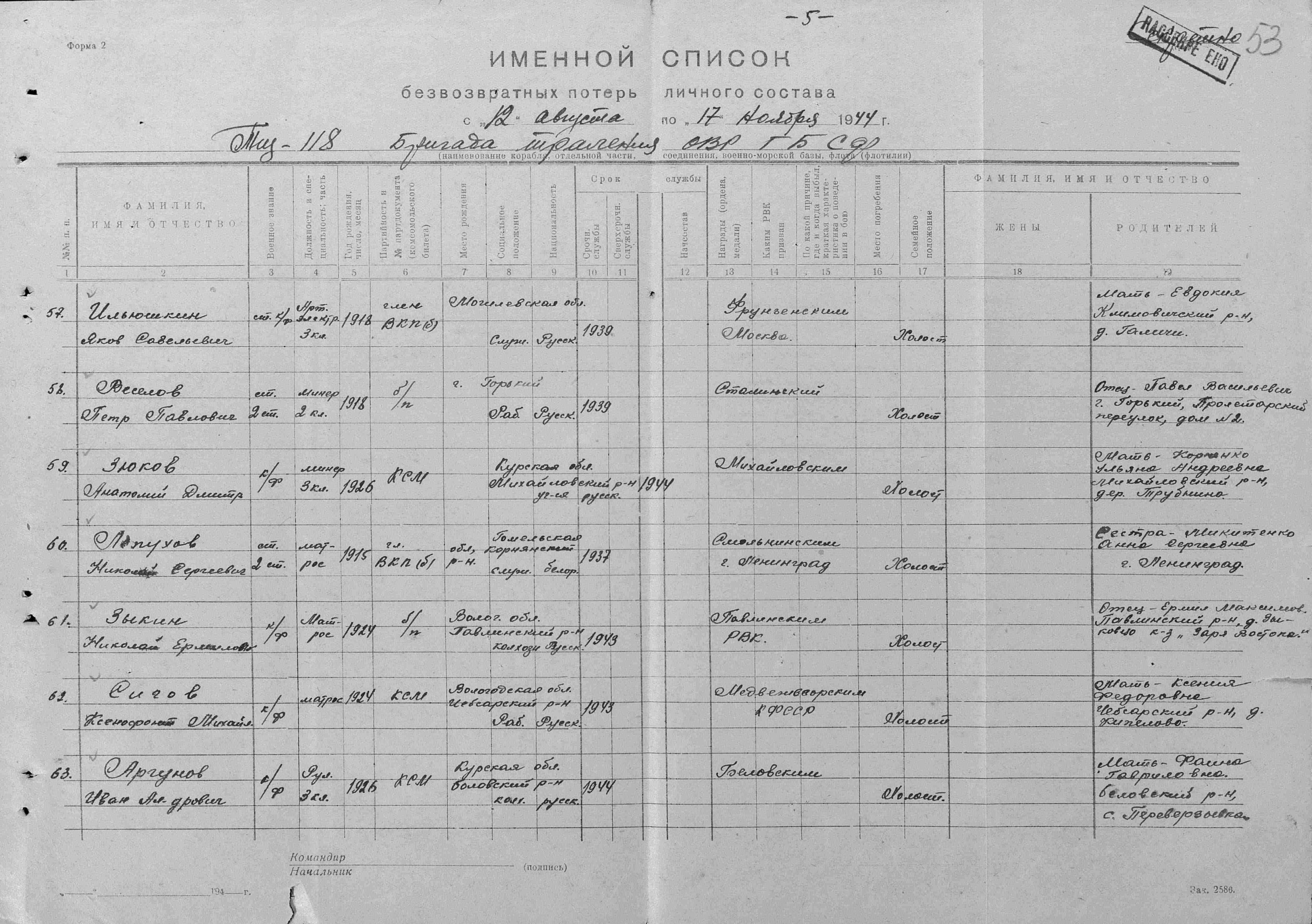 Донесение о безвозвратных потерях 5467 от 27.11.1944 (ЦВМА, Ф. 4038, О. 54, Д. 23).