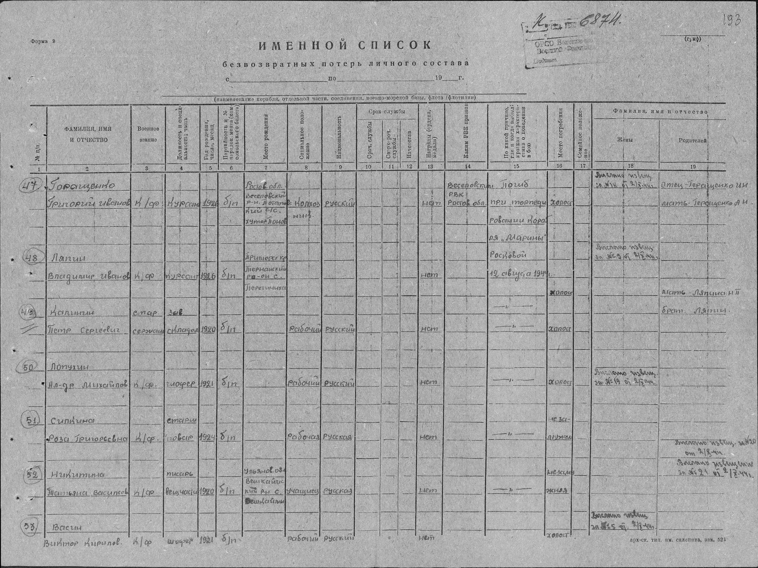 Донесение о безвозвратных потерях 6757 от 06.10.1944 (ЦВМА, Ф. 787, О. 2, Д. 139).