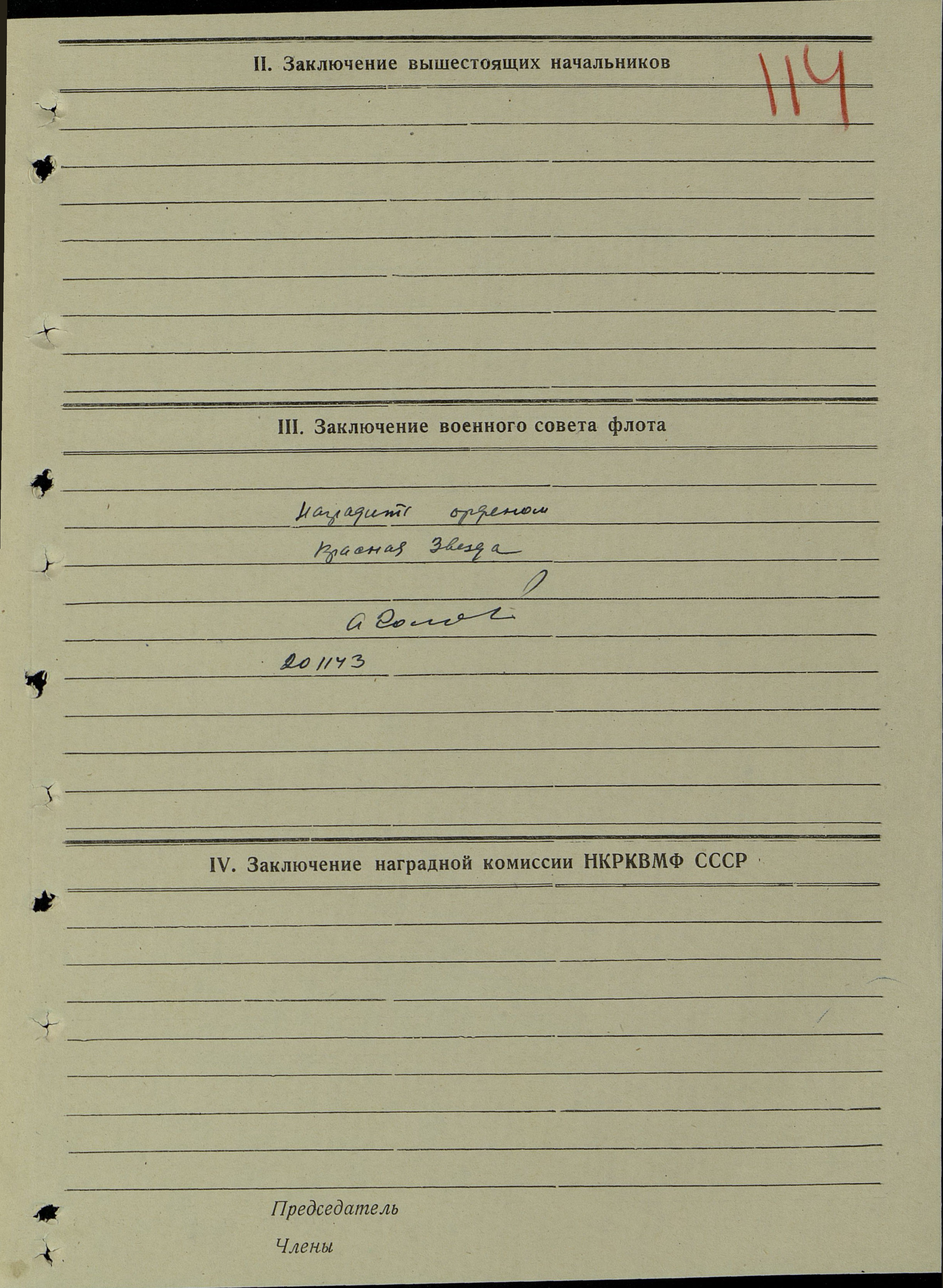 Будучи за границей показал себя дисциплинированным, знающим свое дело [специалистом]. На переходе США–СССР нес вахту на связи отлично, отличные морские качества. При выполнении задания по конвоированию ледокола «И. Сталин» обеспечивал связь между постами. Отлично нес вахту, при чем потоплено две ПЛ противника.