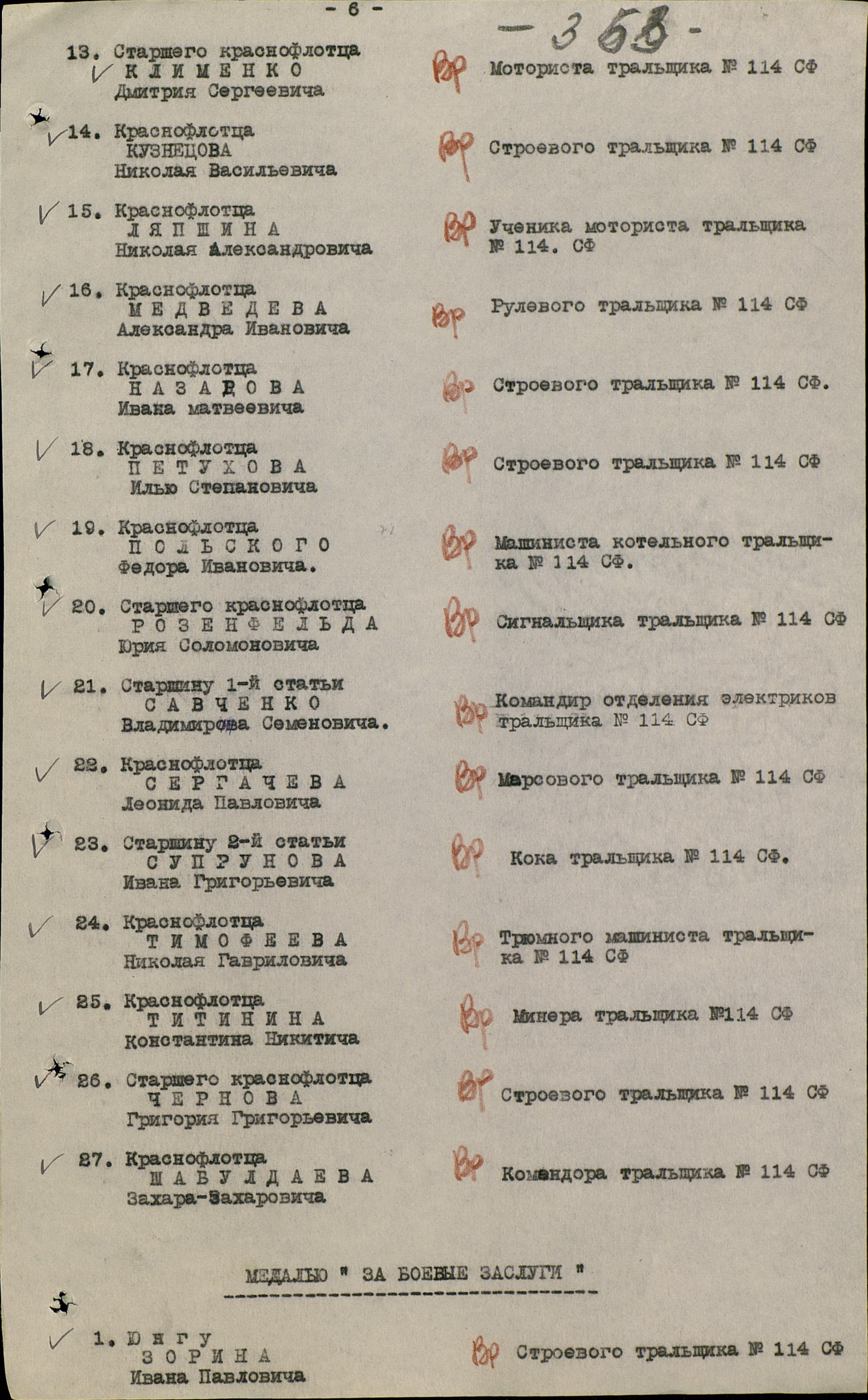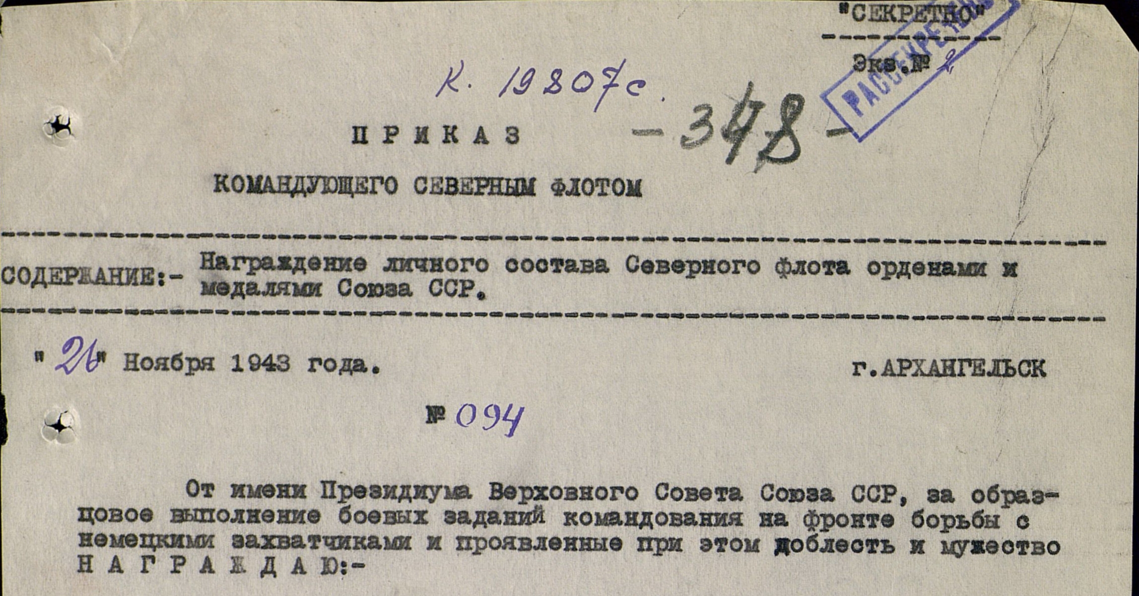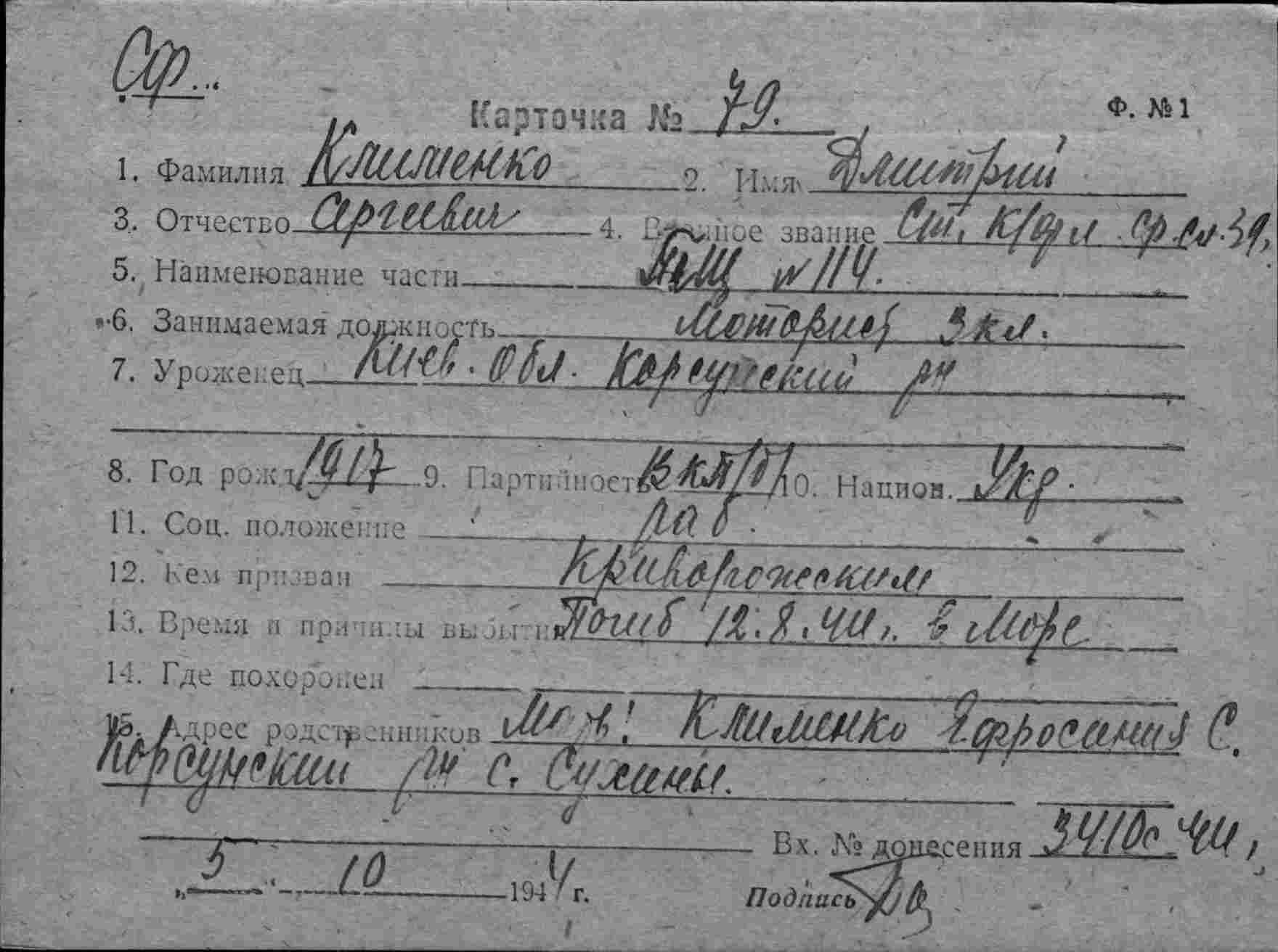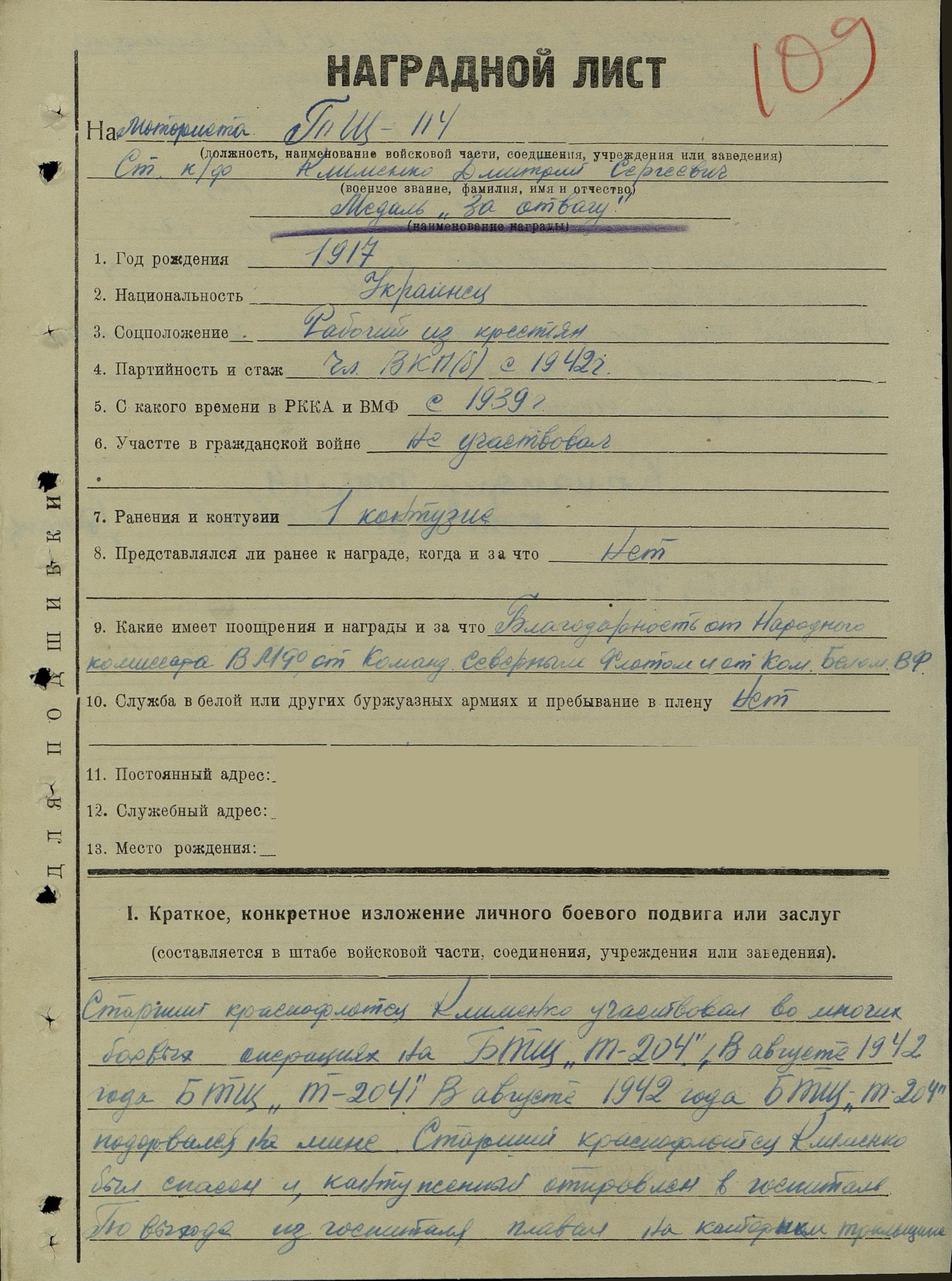 В этом есть заслуга и тов. Клименко. Ходатайствую о награждение старшего краснофлотца Клименко медалью «За отвагу».