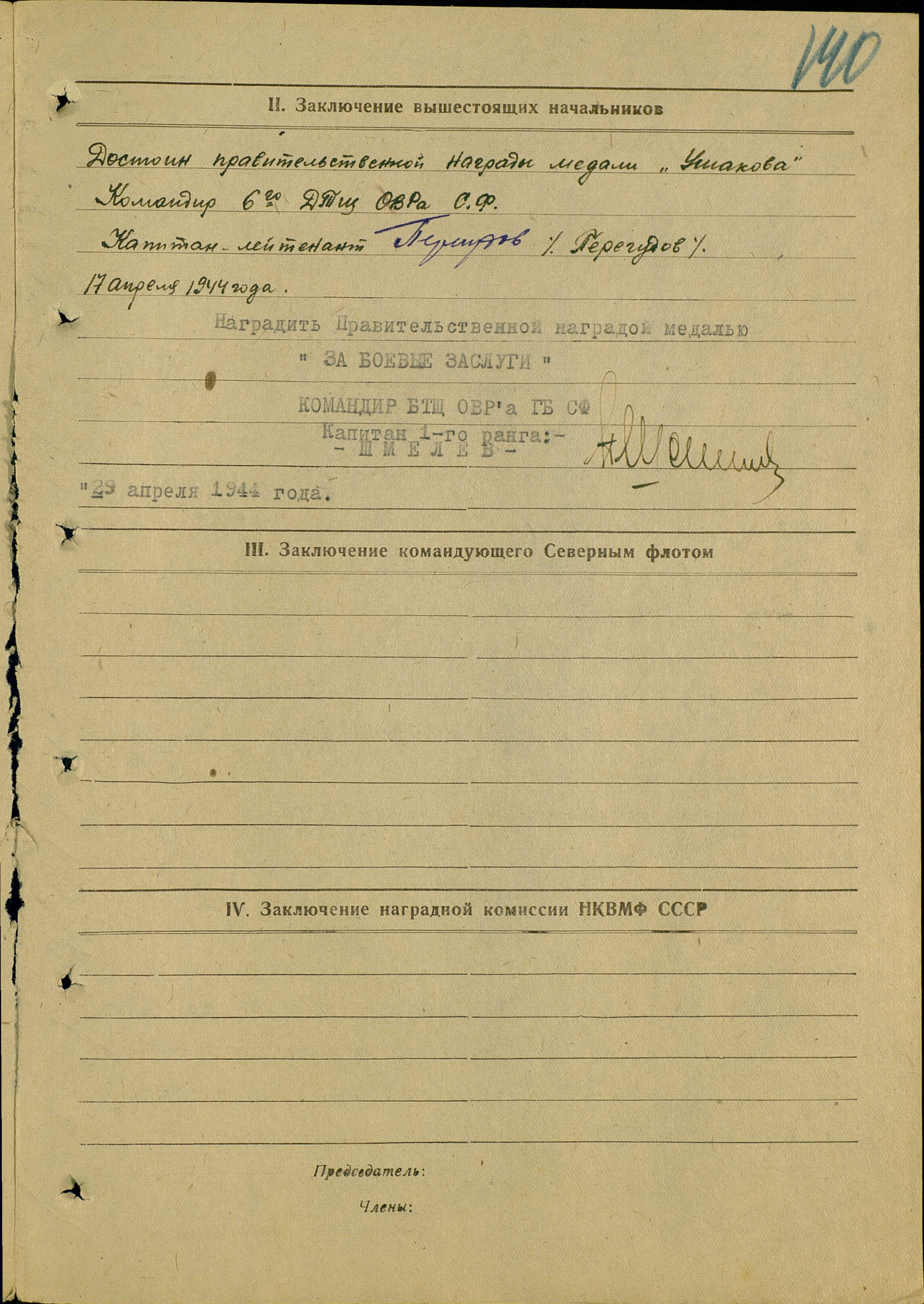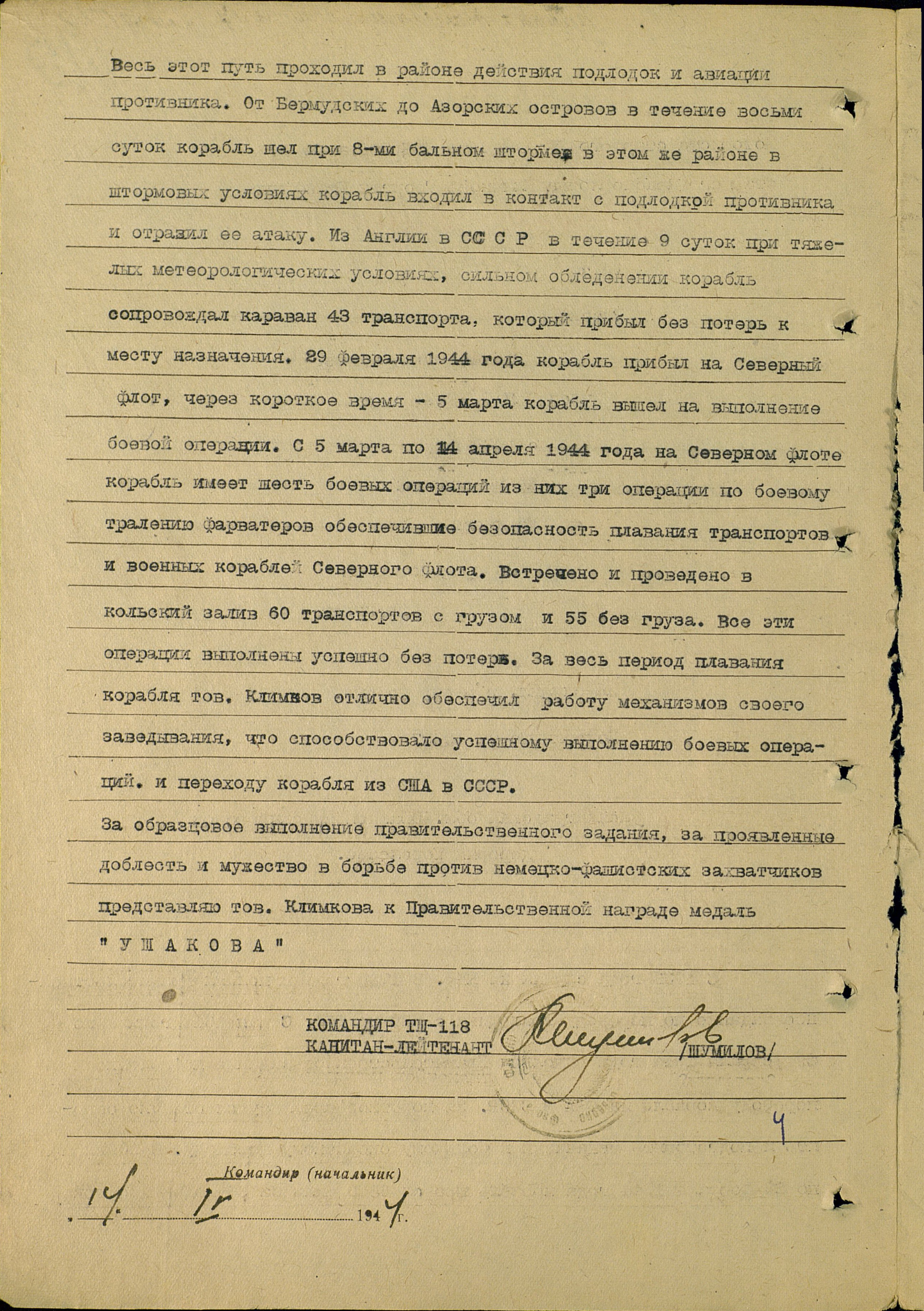 За образцовое выполнение правительственного задания, за проявленные доблесть и мужество в борьбе против немецко-фашистских захватчиков представляю тов. Климкова к правительственной награде – медали Ушакова.
