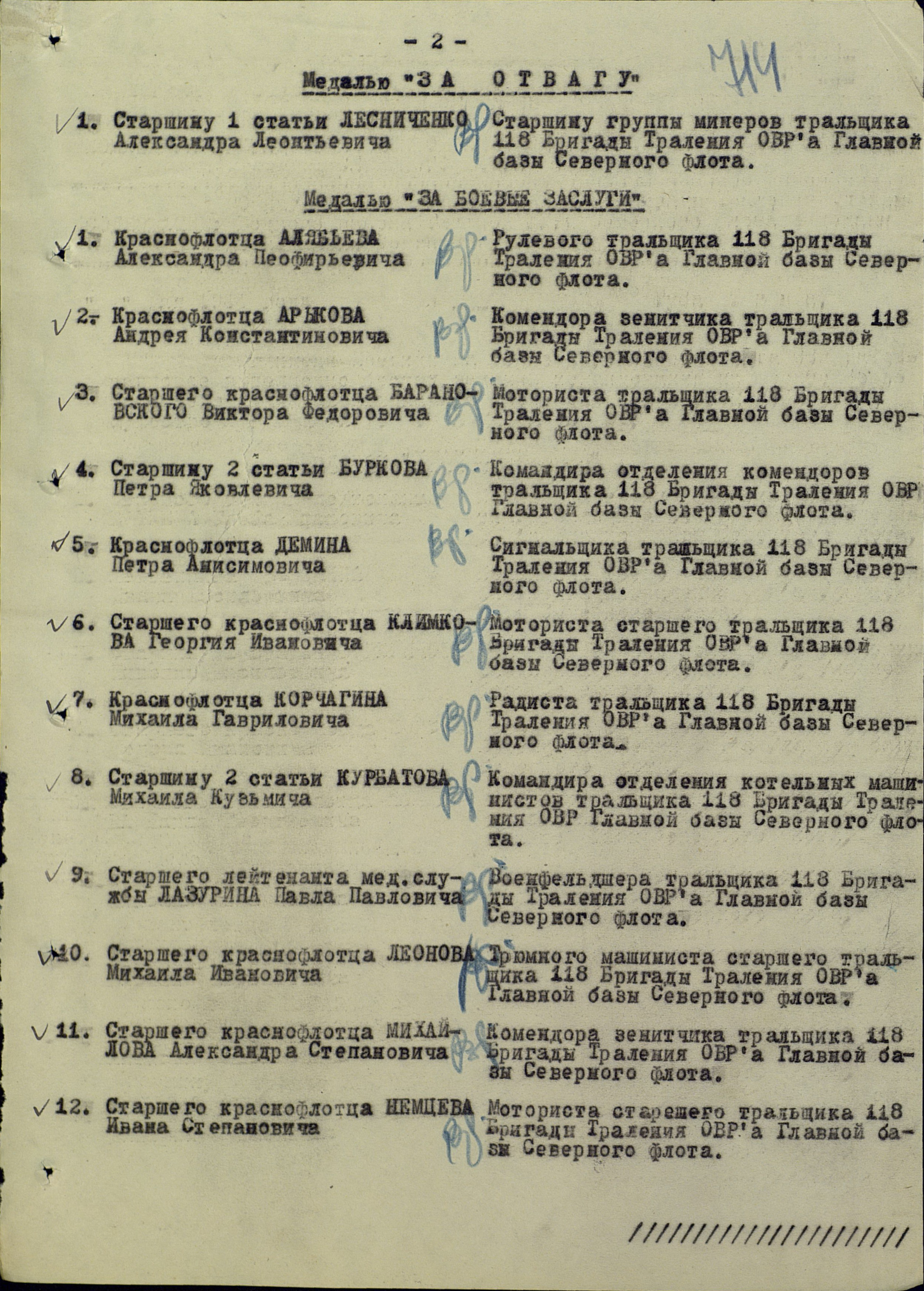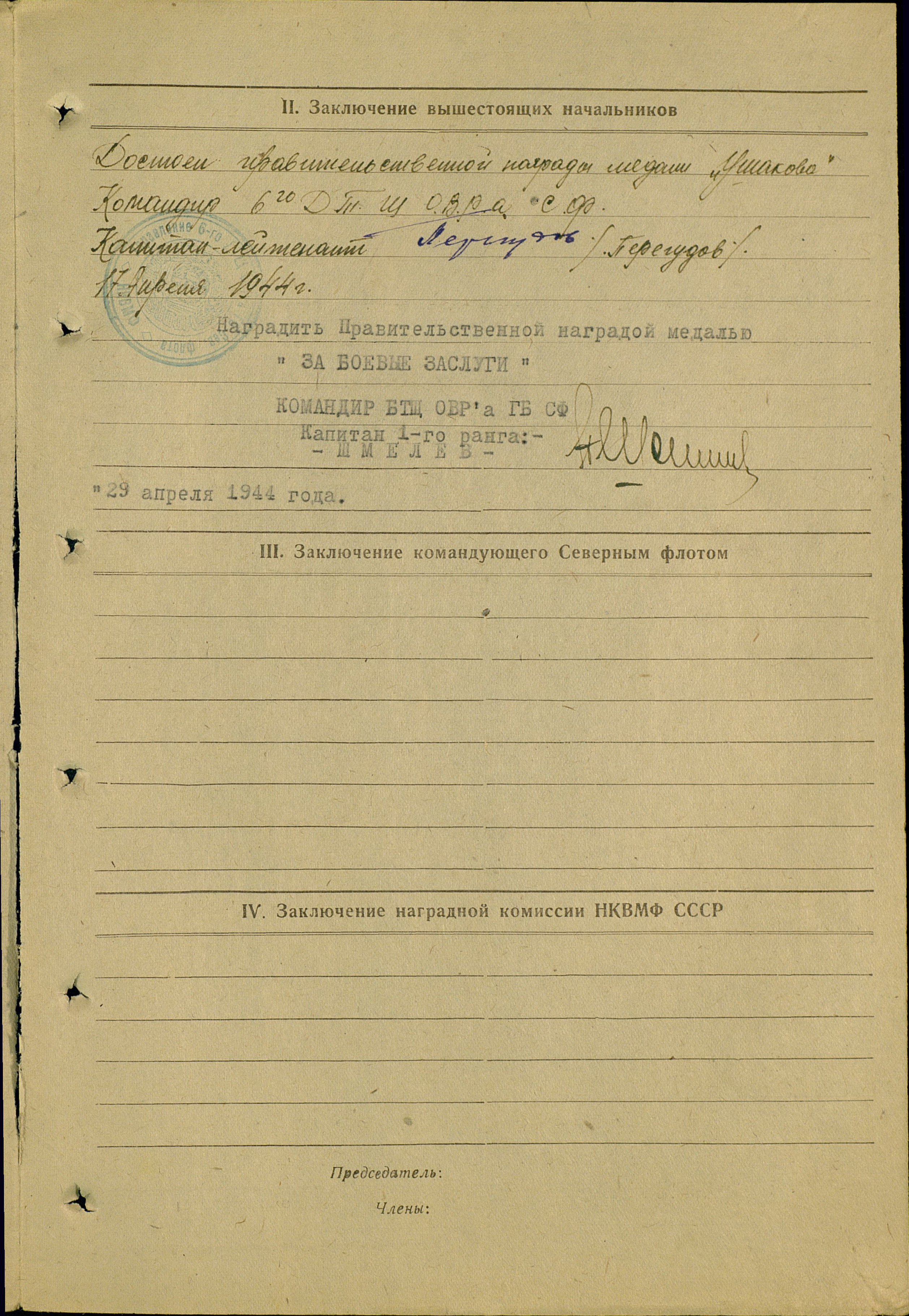 За образцовое выполнение правительственного задания и боевых заданий командования по борьбе с немецко-фашистскими захватчиками представляю краснофлотца Корчагина к правительственной награде – медали Ушакова.